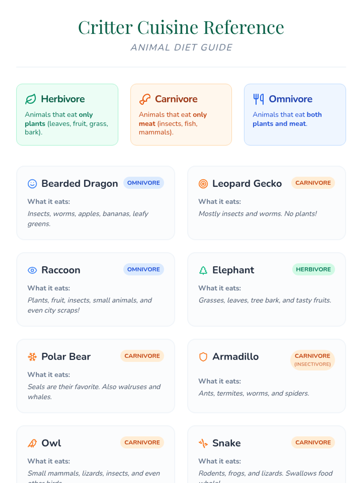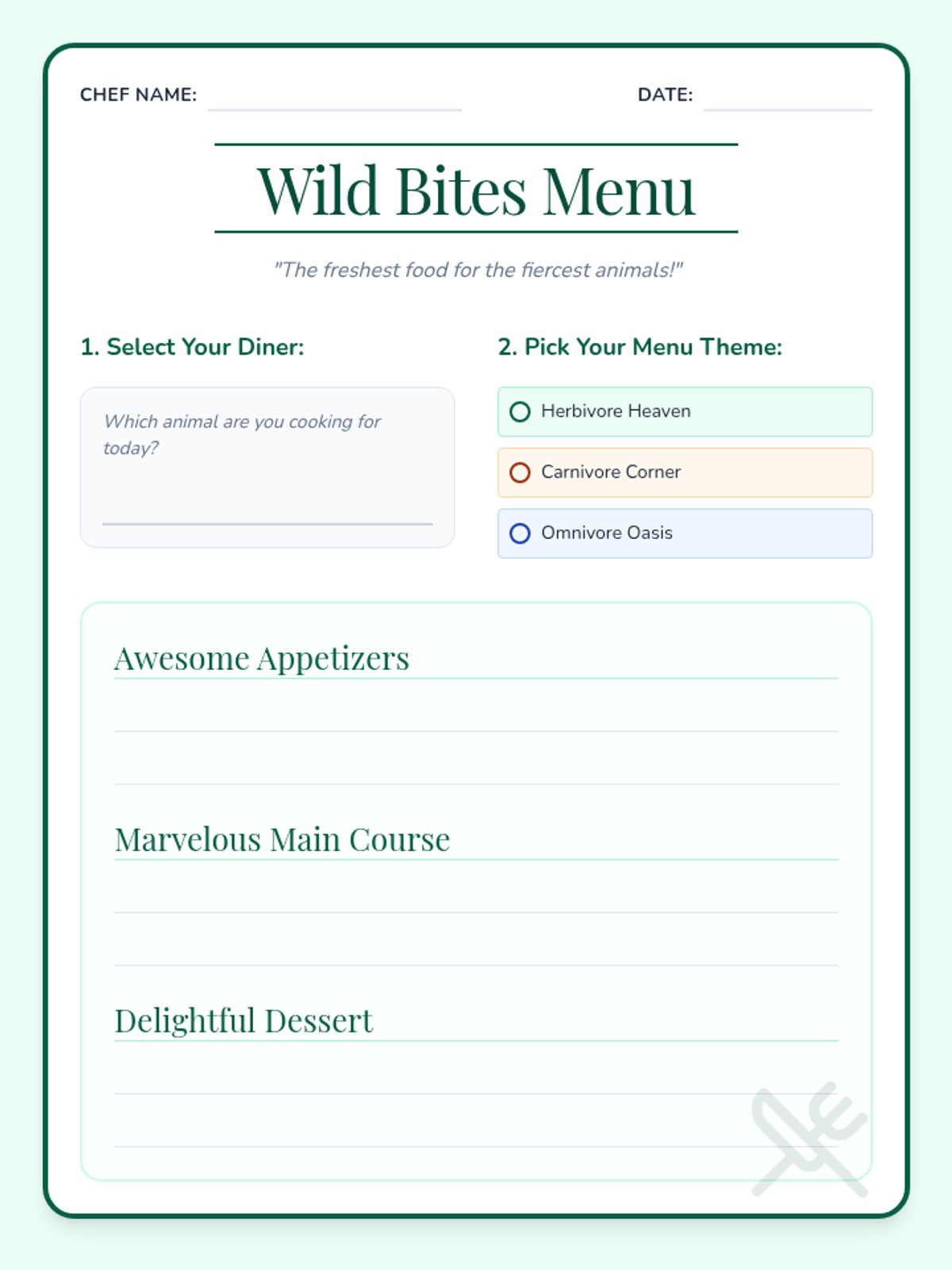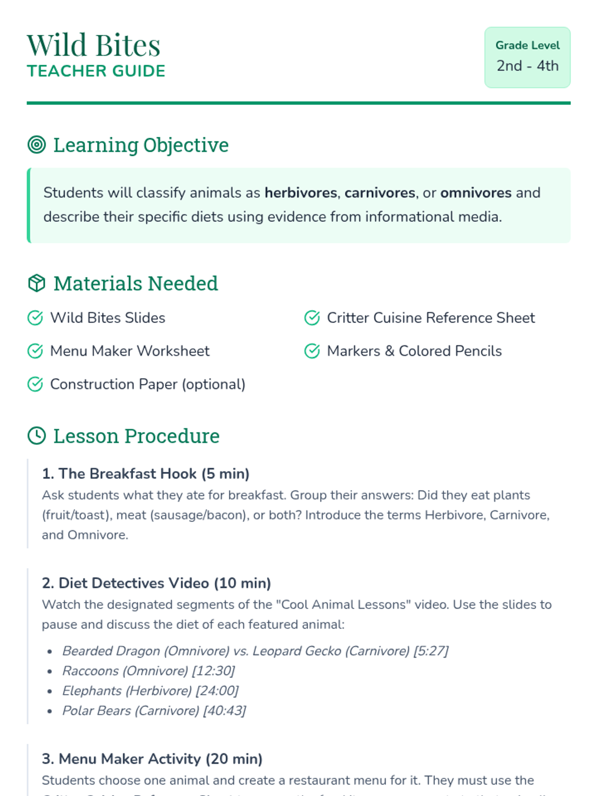 Students will classify animals into diet categories (herbivore, carnivore, or omnivore) based on video evidence and create a themed restaurant menu for a specific animal.