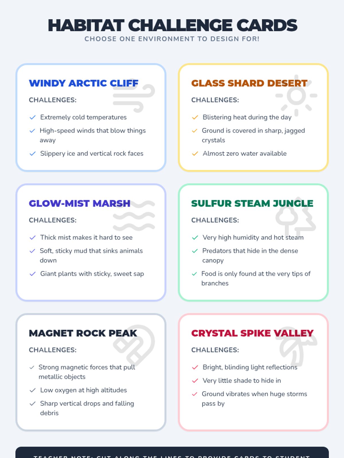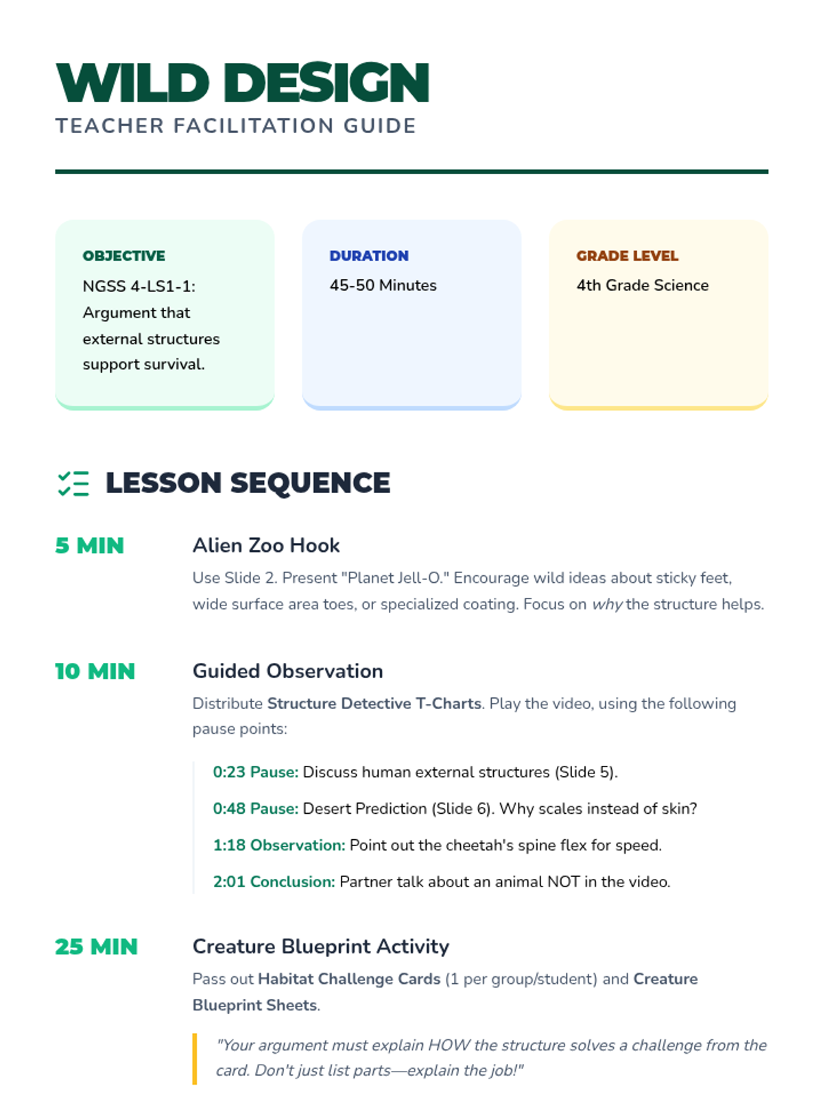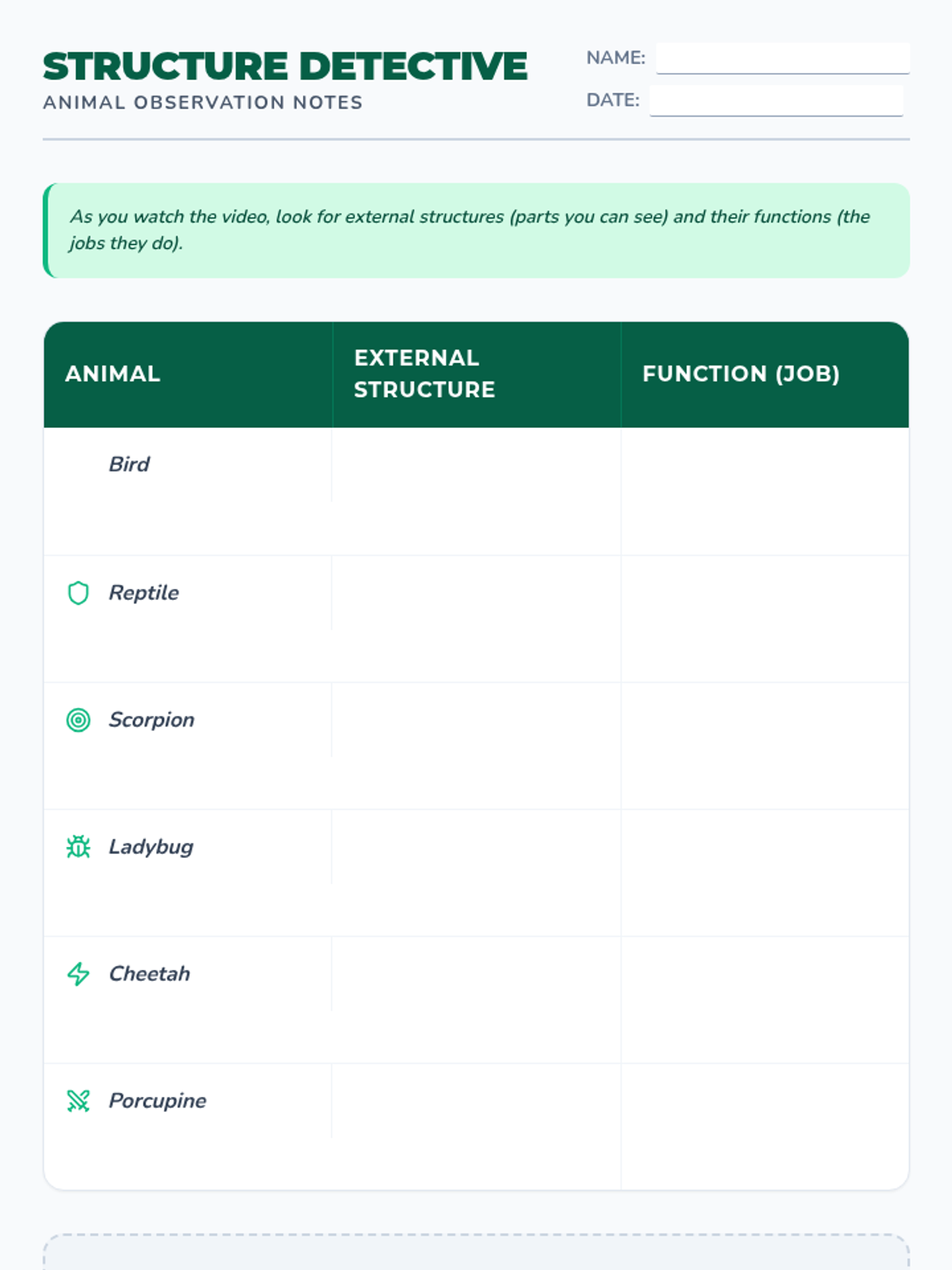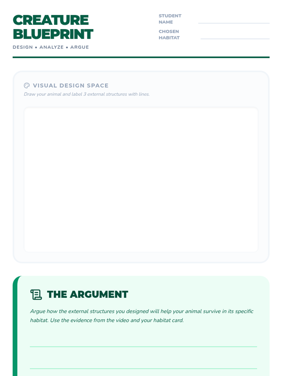 Students investigate how external structures of animals function to support survival, growth, and behavior, culminating in the design of a custom creature for a specific habitat.