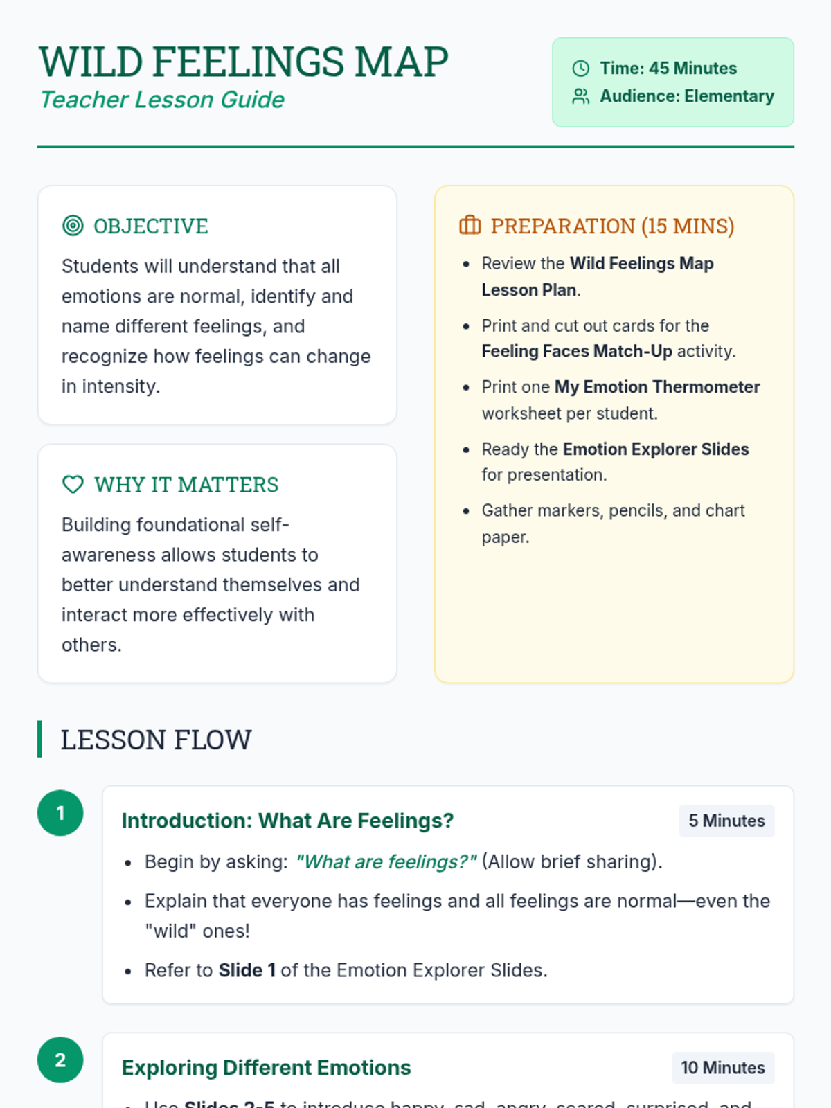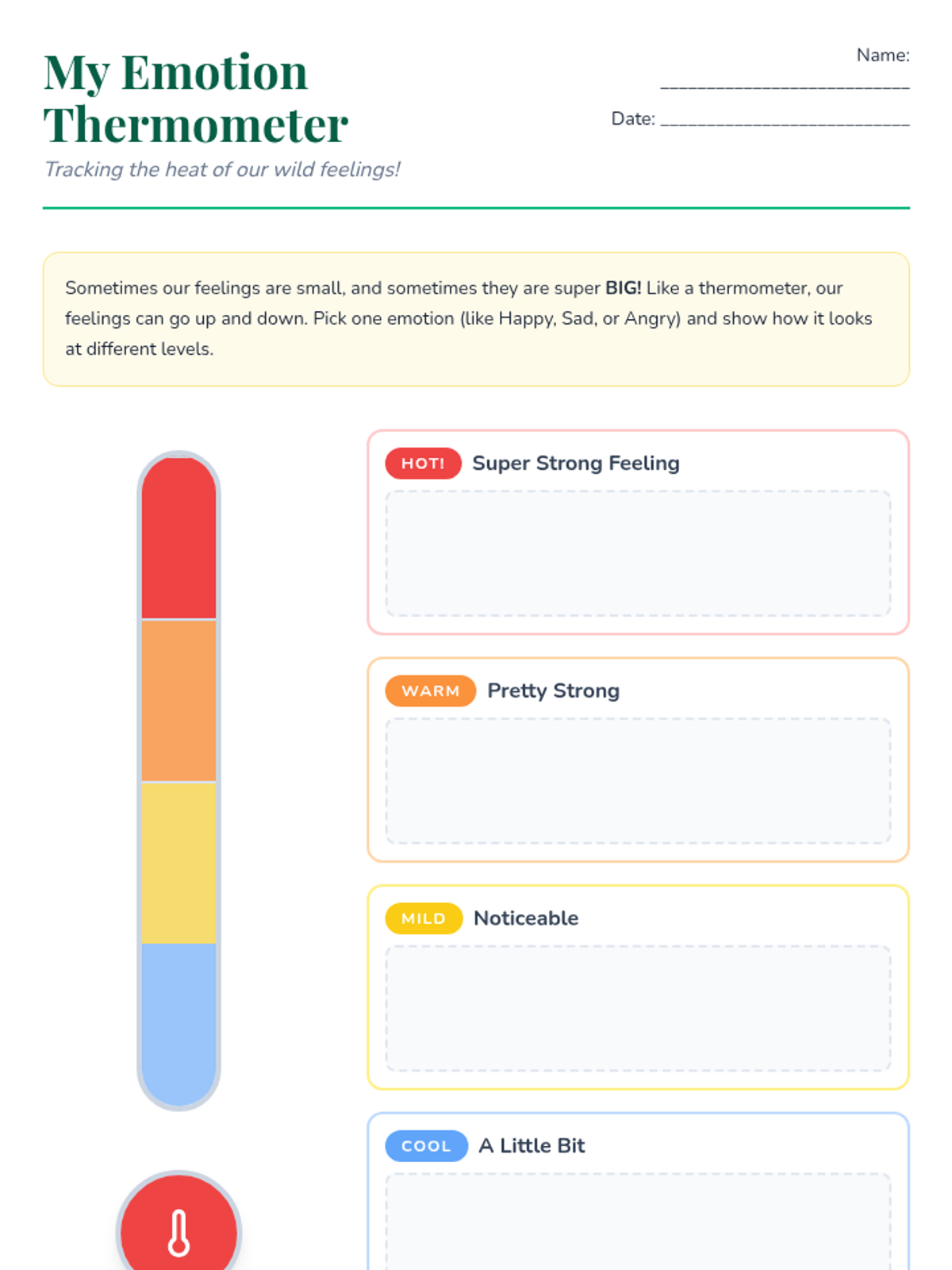 An introductory lesson on emotional self-awareness, teaching students to identify, name, and measure the intensity of their feelings through interactive activities and a 'thermometer' framework.
