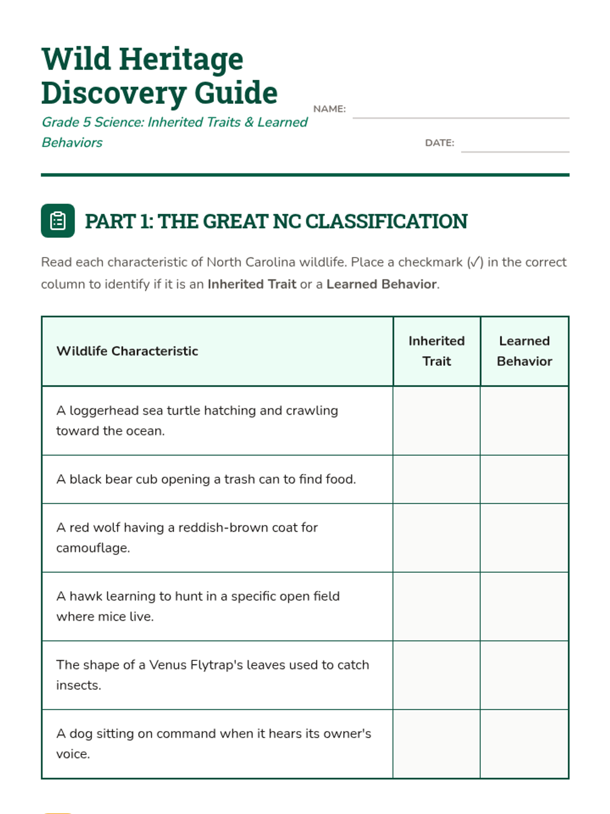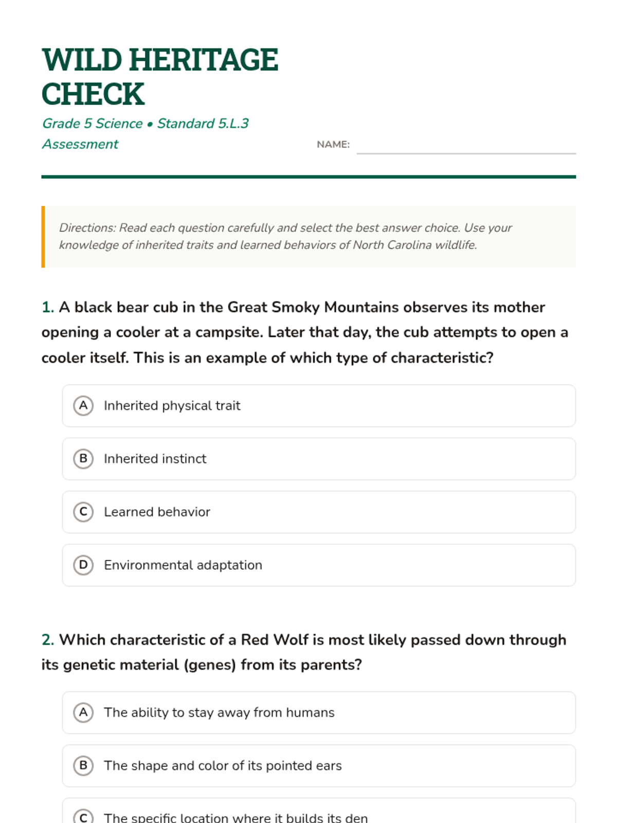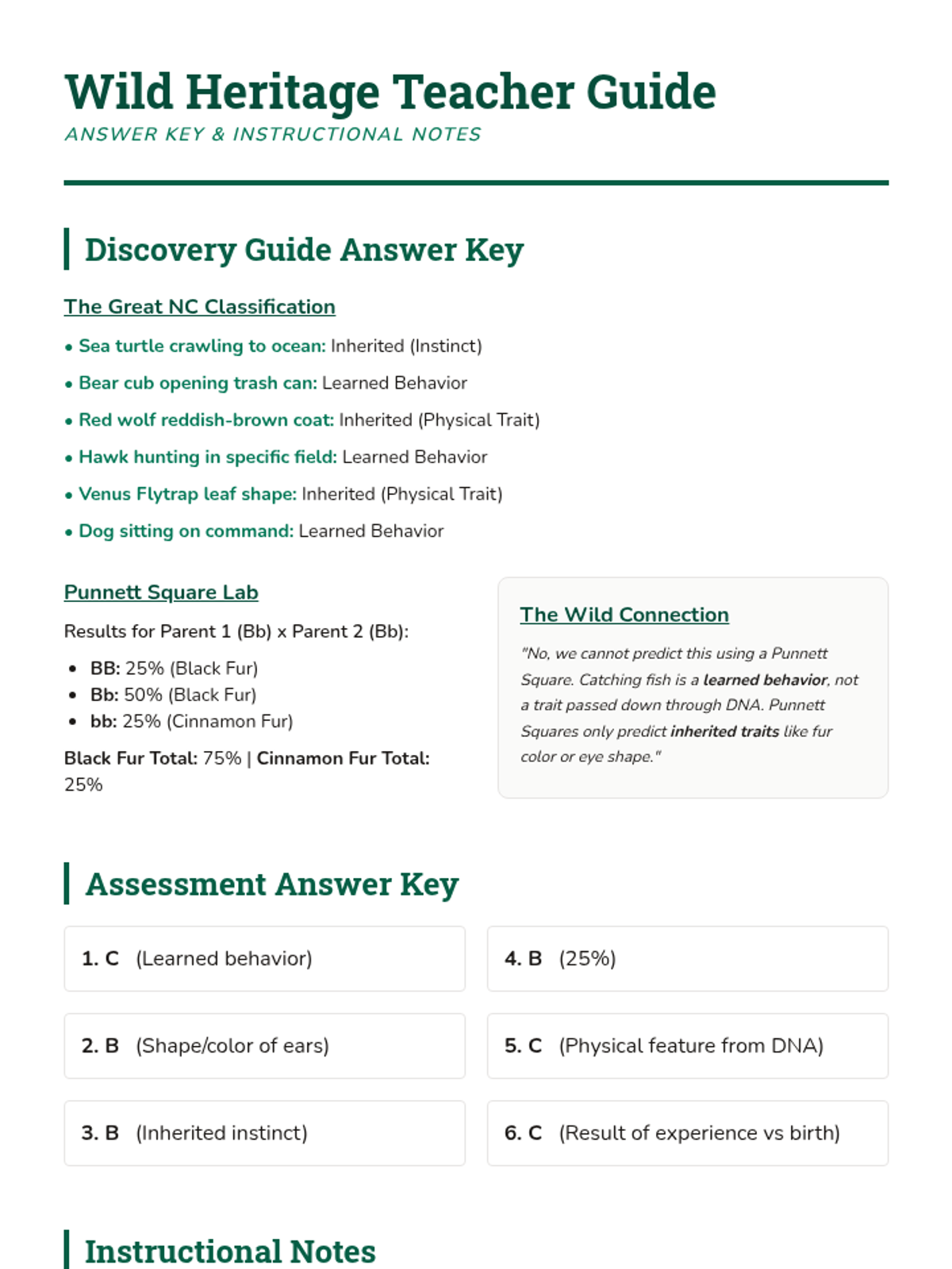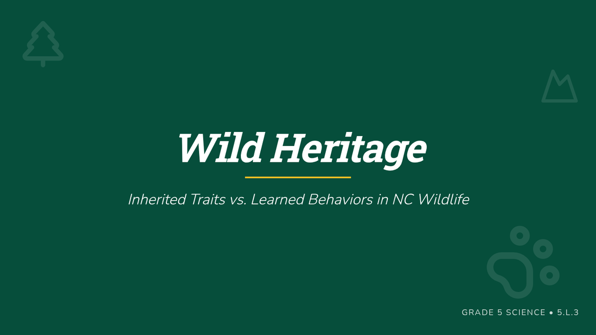 A comprehensive Grade 5 science lesson focused on distinguishing between inherited traits and learned behaviors using North Carolina wildlife examples like black bears and red wolves. Includes instructional slides, a classification activity, a Punnett square introduction, and EOG-style assessment.