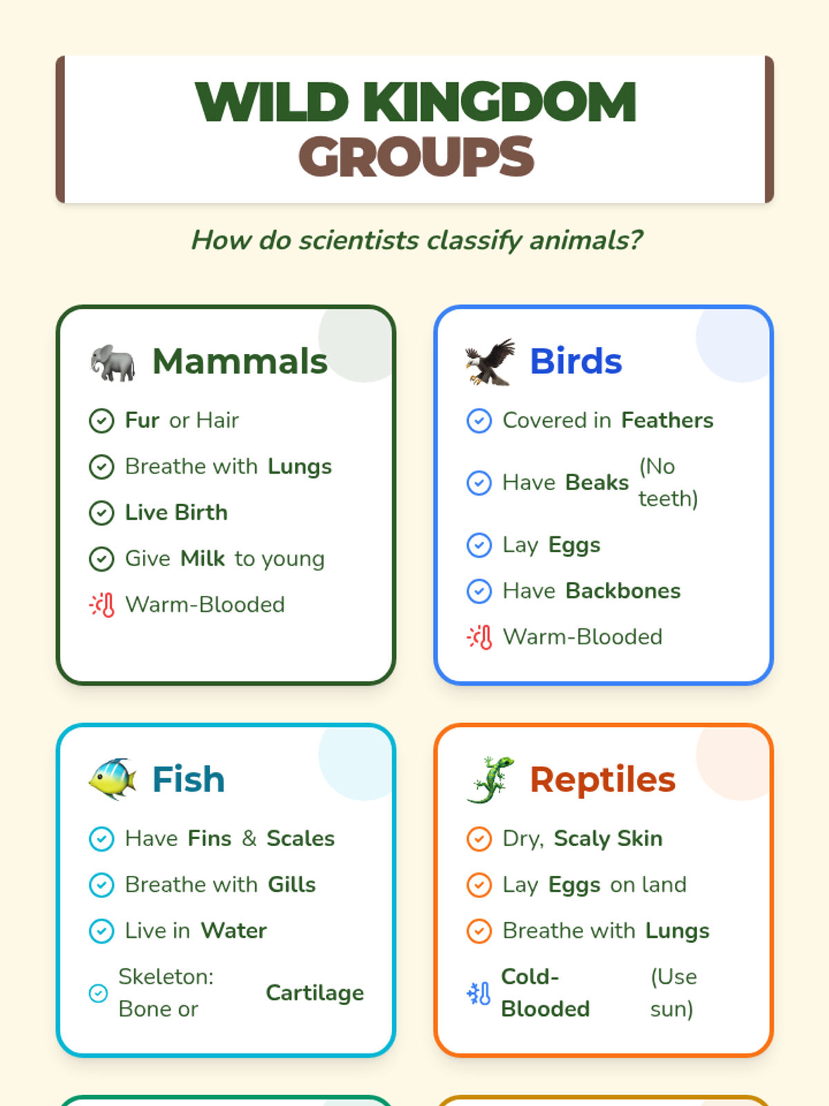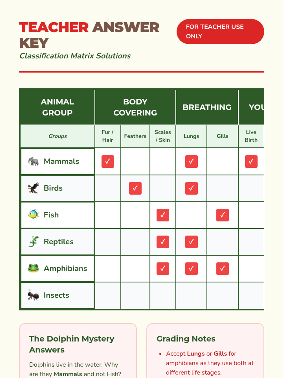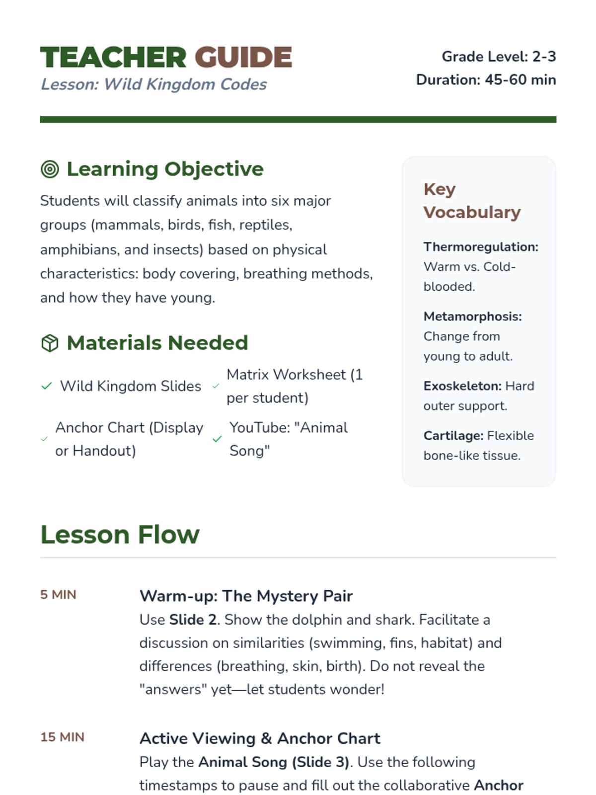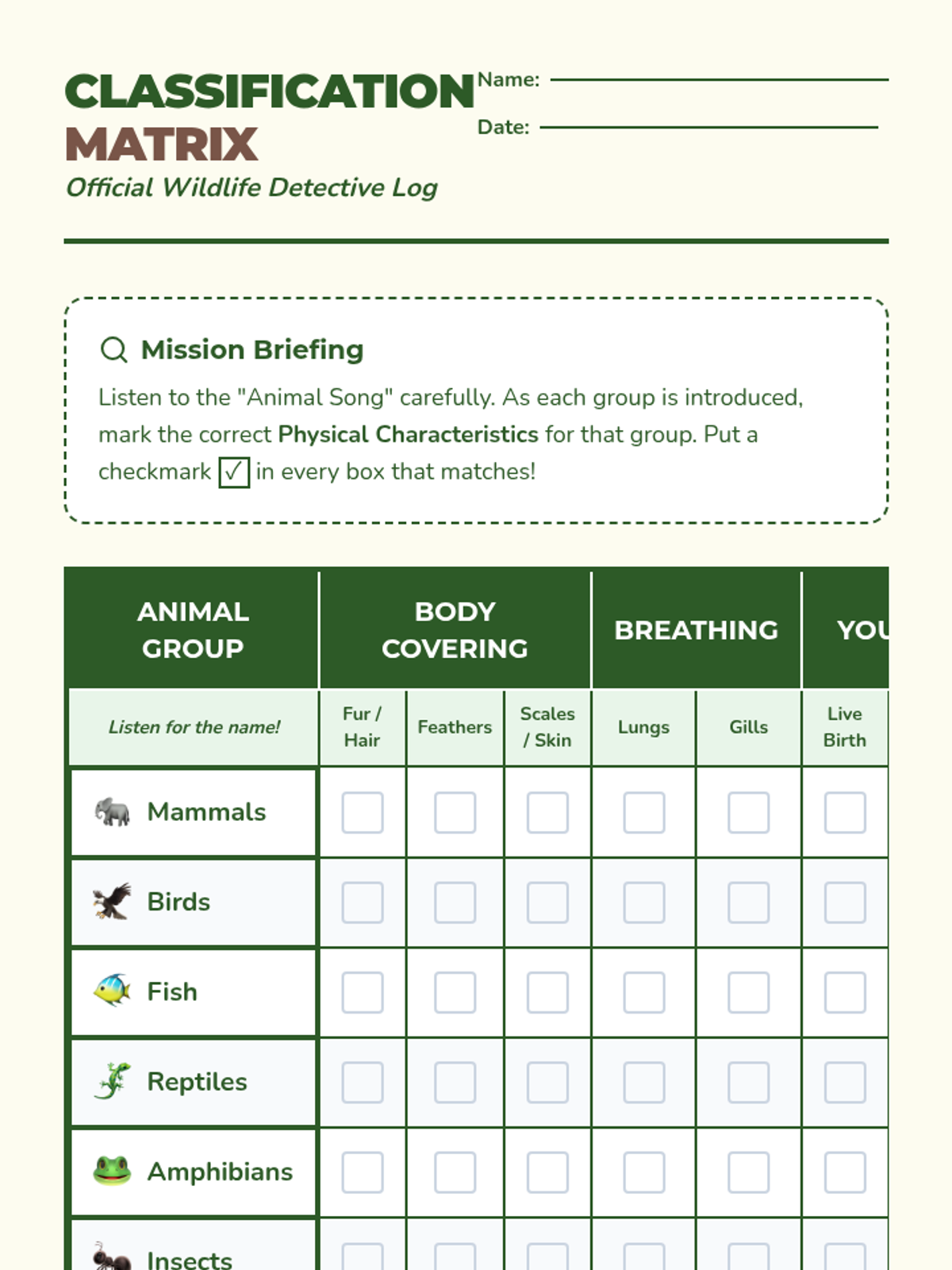 A lesson where students learn to classify animals into six major groups (mammals, birds, fish, reptiles, amphibians, and insects) based on their physical characteristics like body coverings, breathing methods, and how they have young.