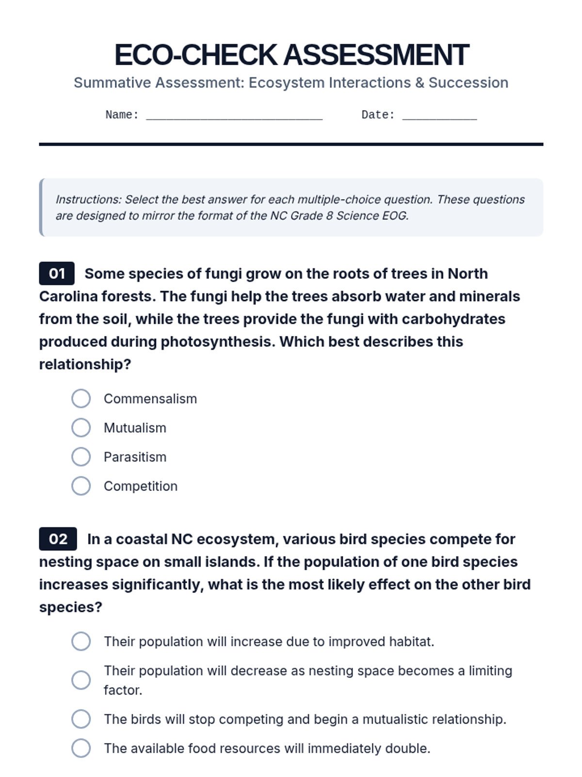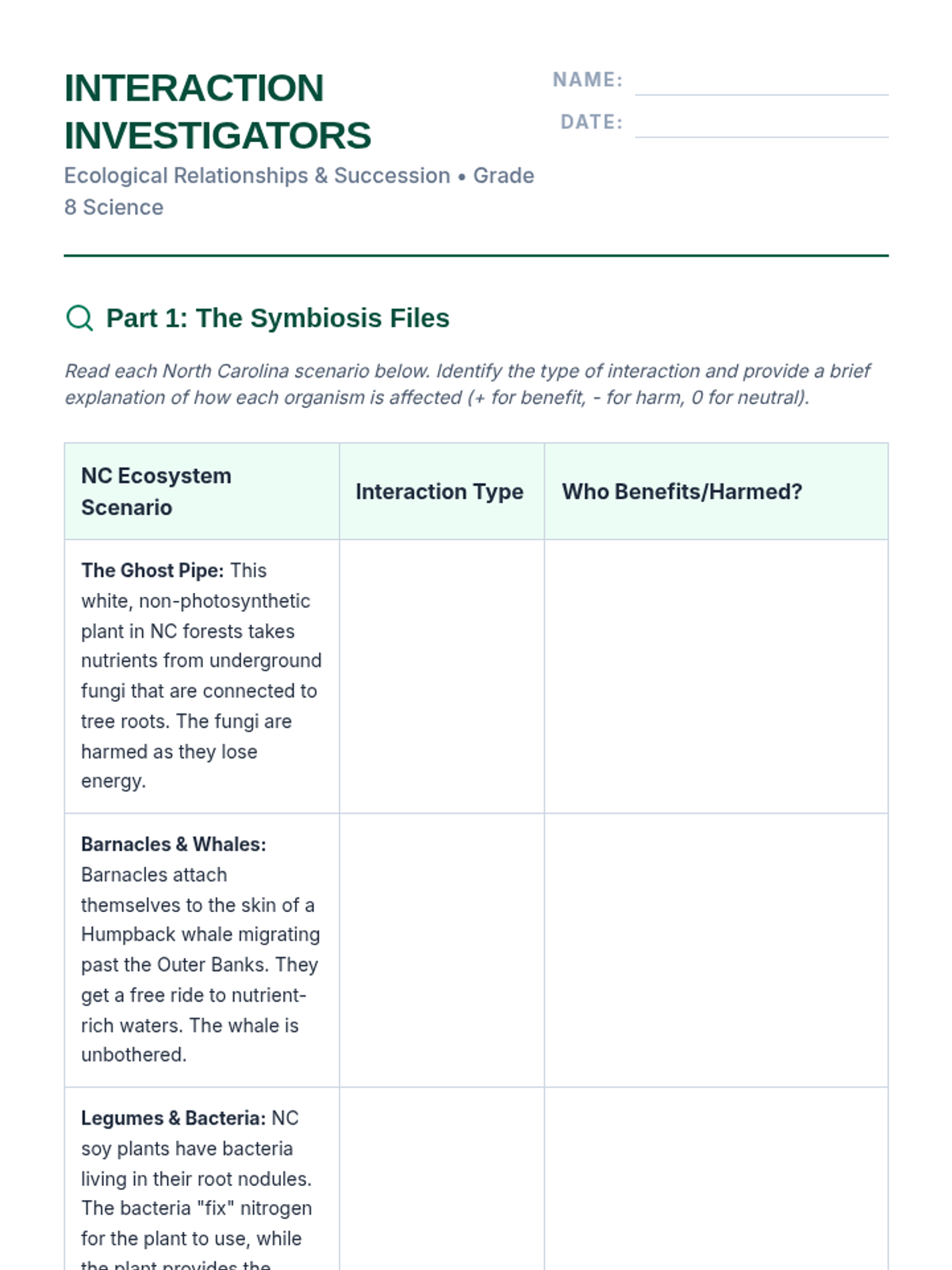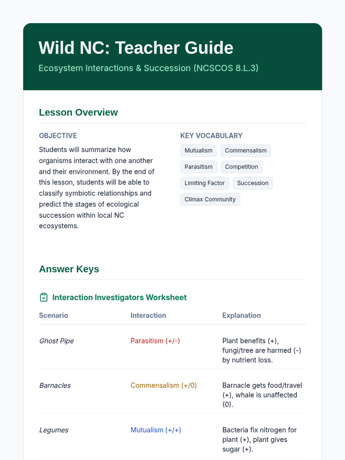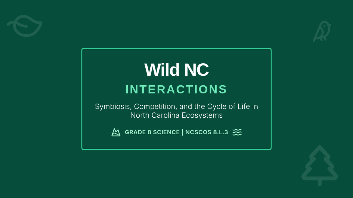 In this lesson, 8th-grade students explore how organisms interact within North Carolina ecosystems. They will classify symbiotic relationships, distinguish between types of competition, and analyze the stages of ecological succession through real-world local examples.