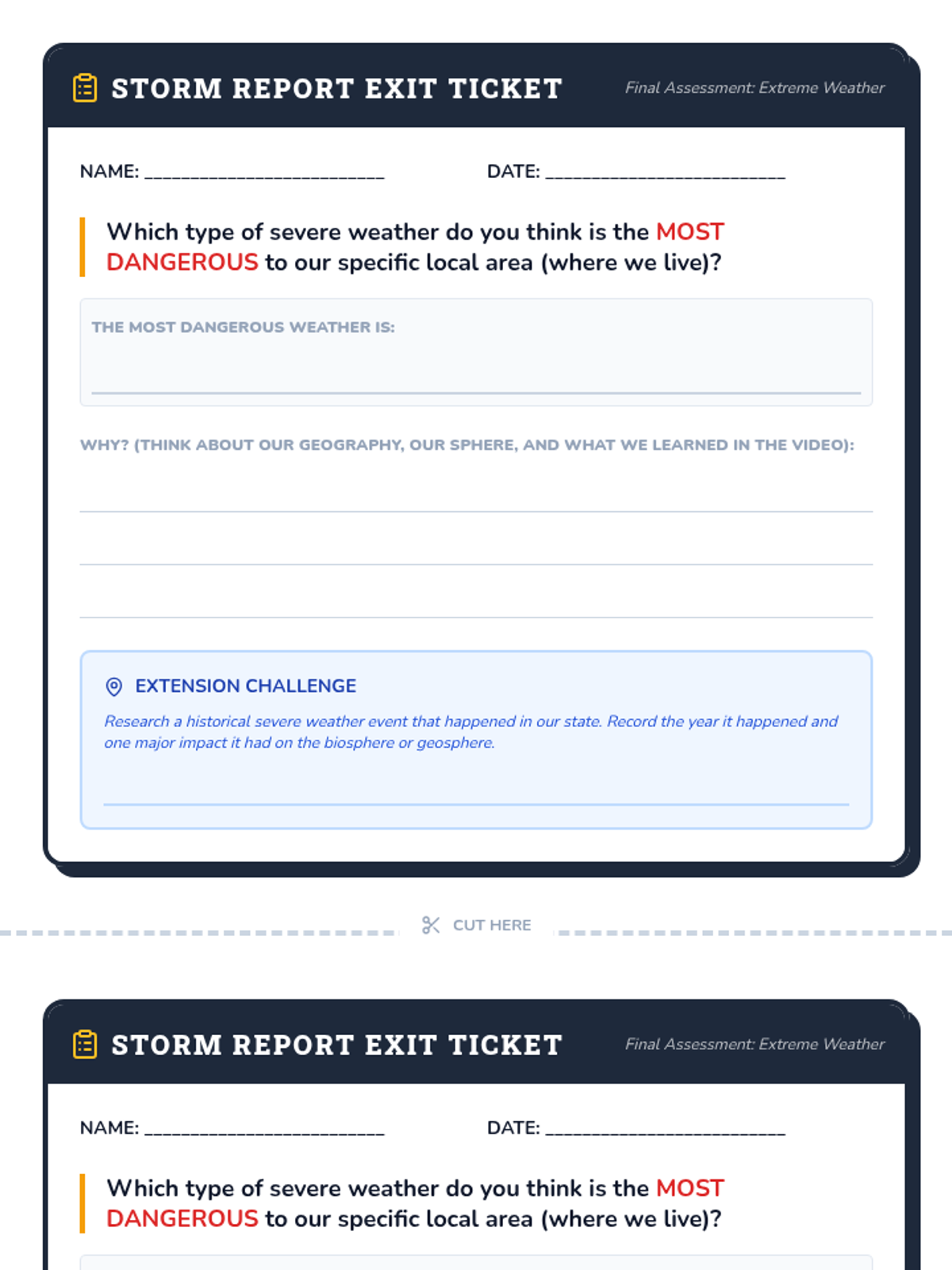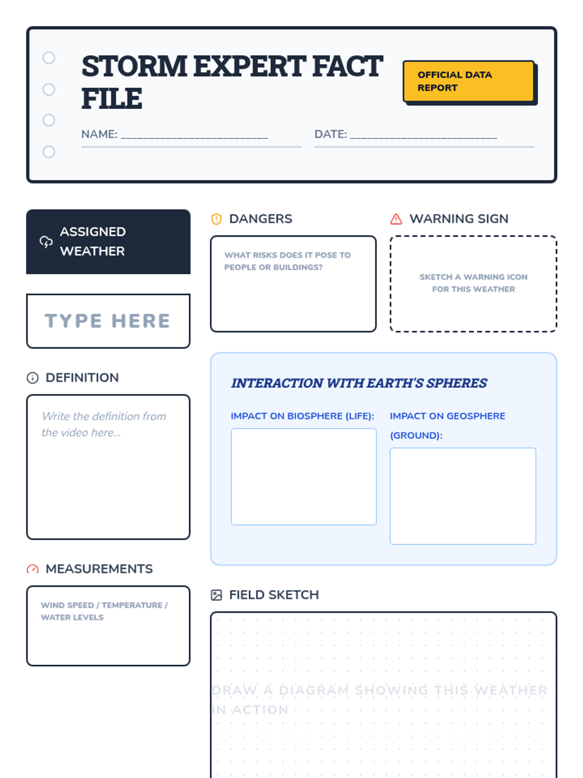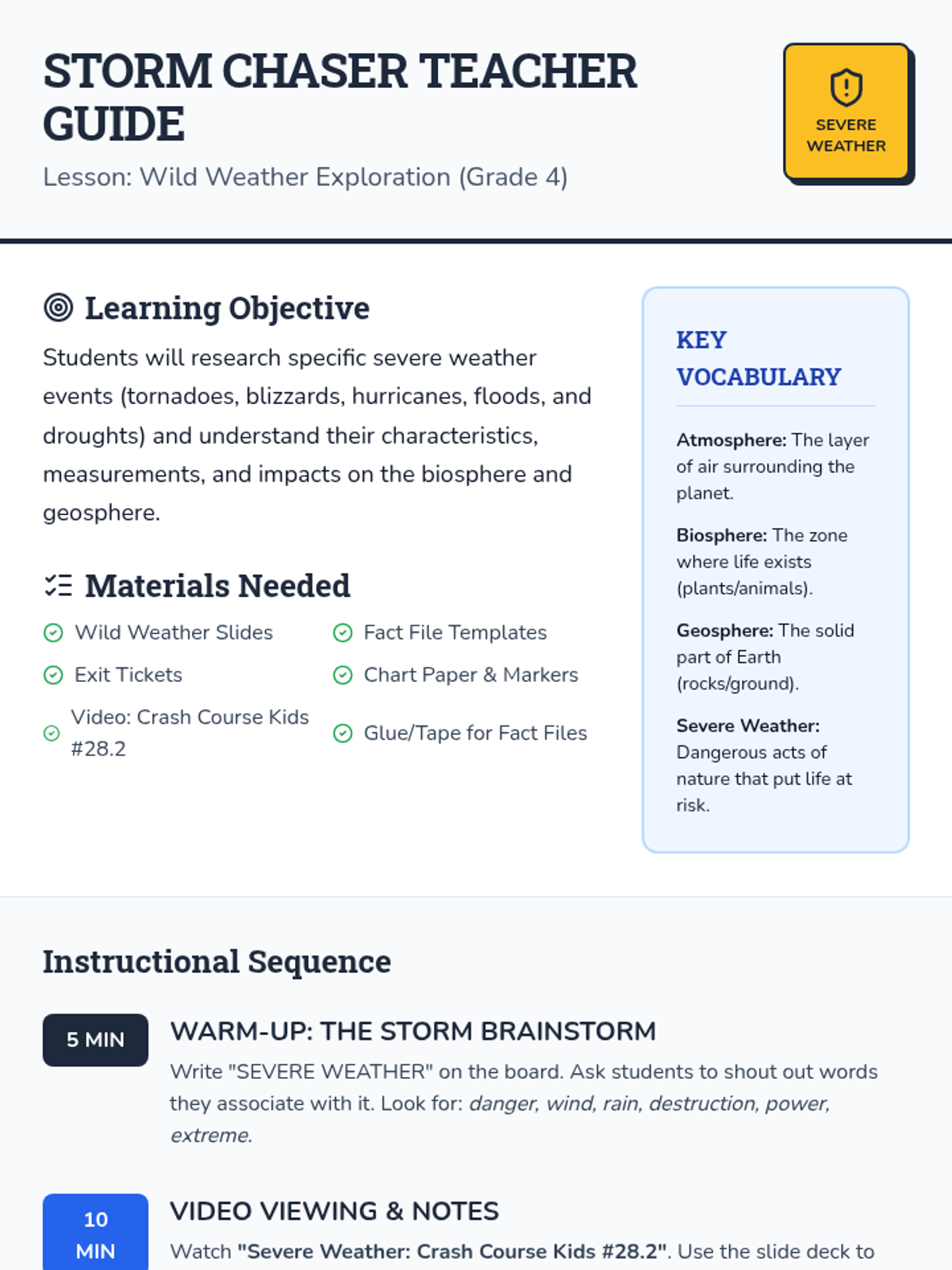 A comprehensive lesson for 4th graders on severe weather events (tornadoes, blizzards, hurricanes, floods, and droughts), focusing on their characteristics and impacts on Earth's spheres. Includes a video-based investigation, expert group research, and personal reflection.