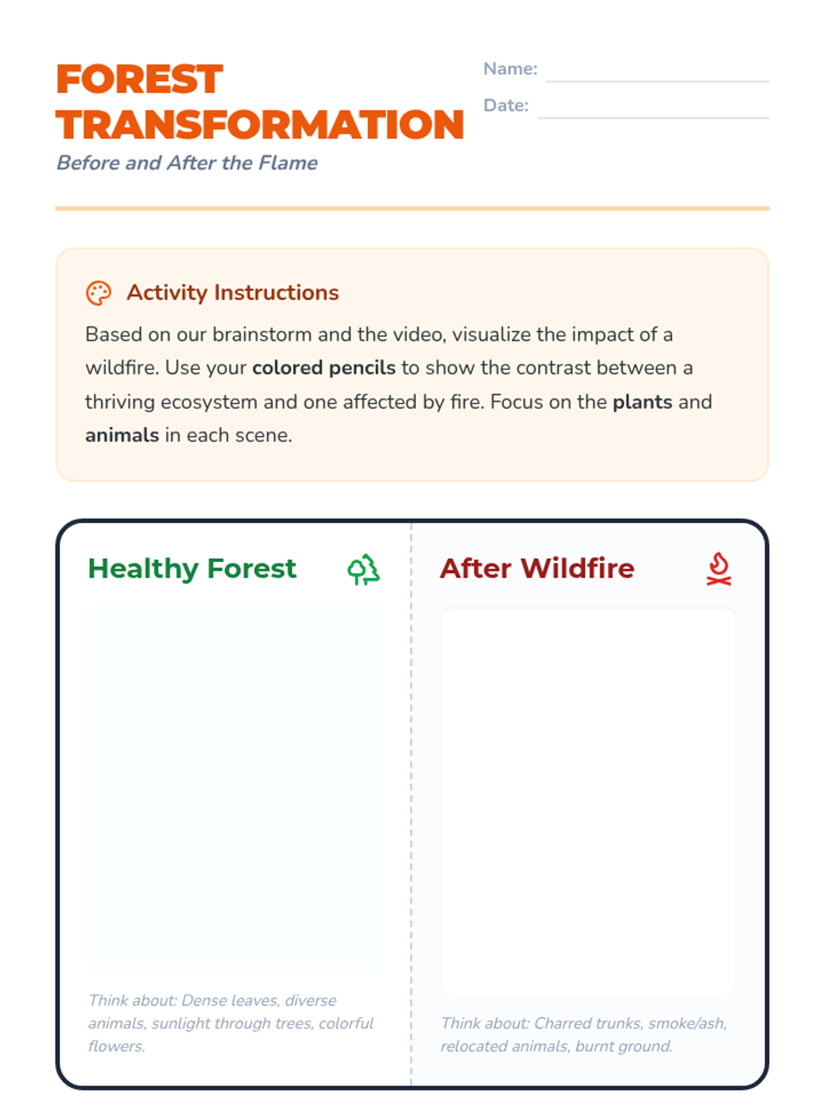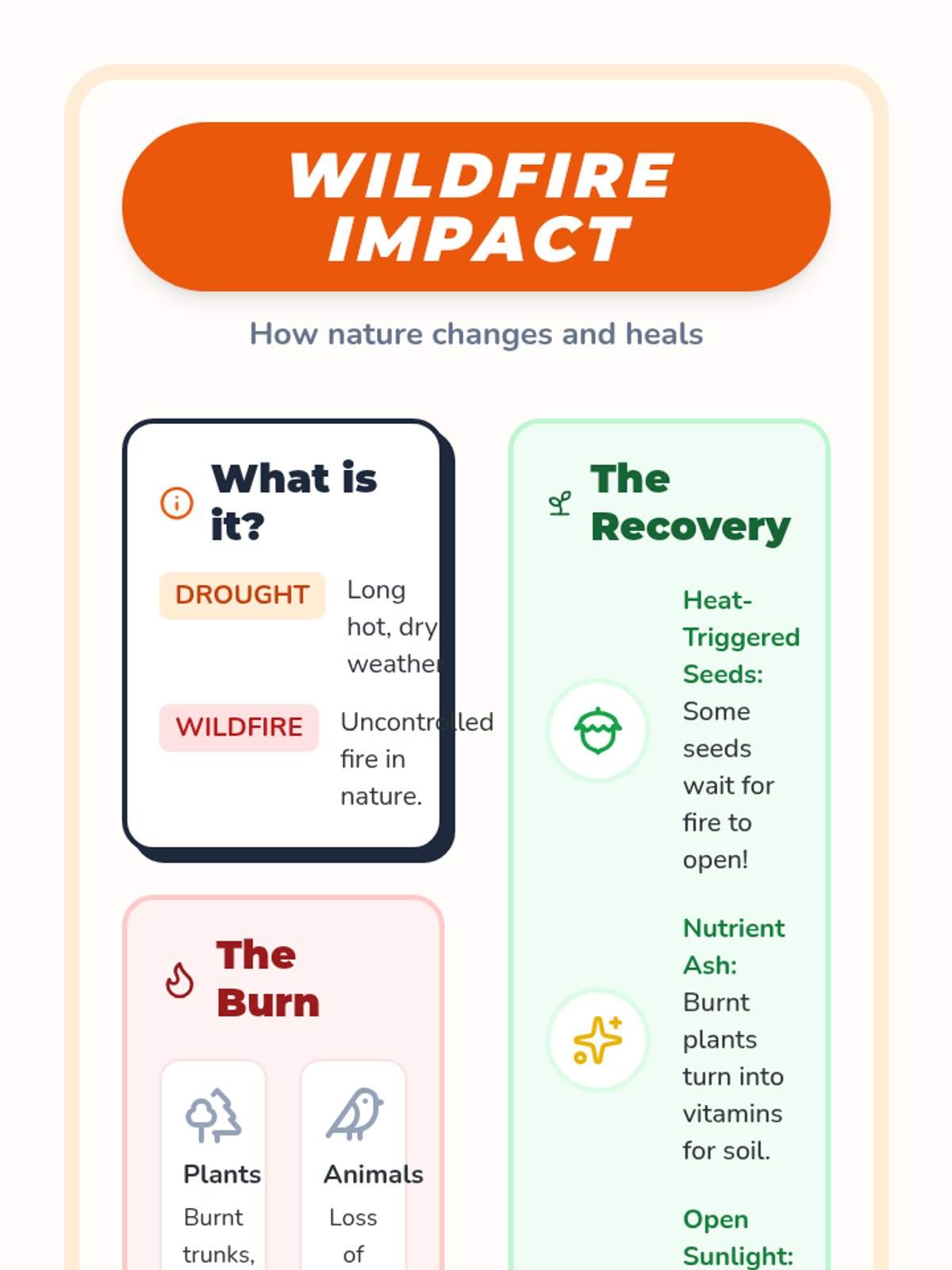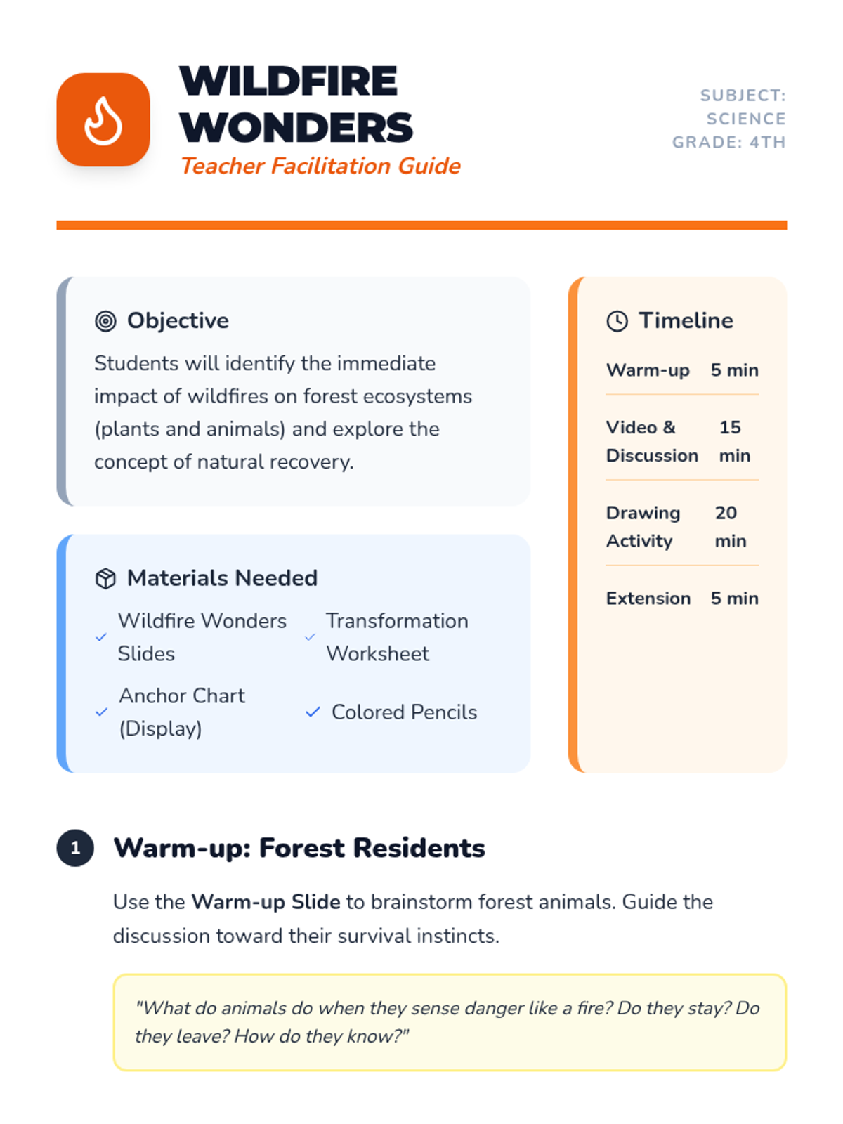 A 4th-grade science lesson exploring how wildfires impact forest ecosystems, focusing on the immediate effects on plants and animals and the process of natural recovery.