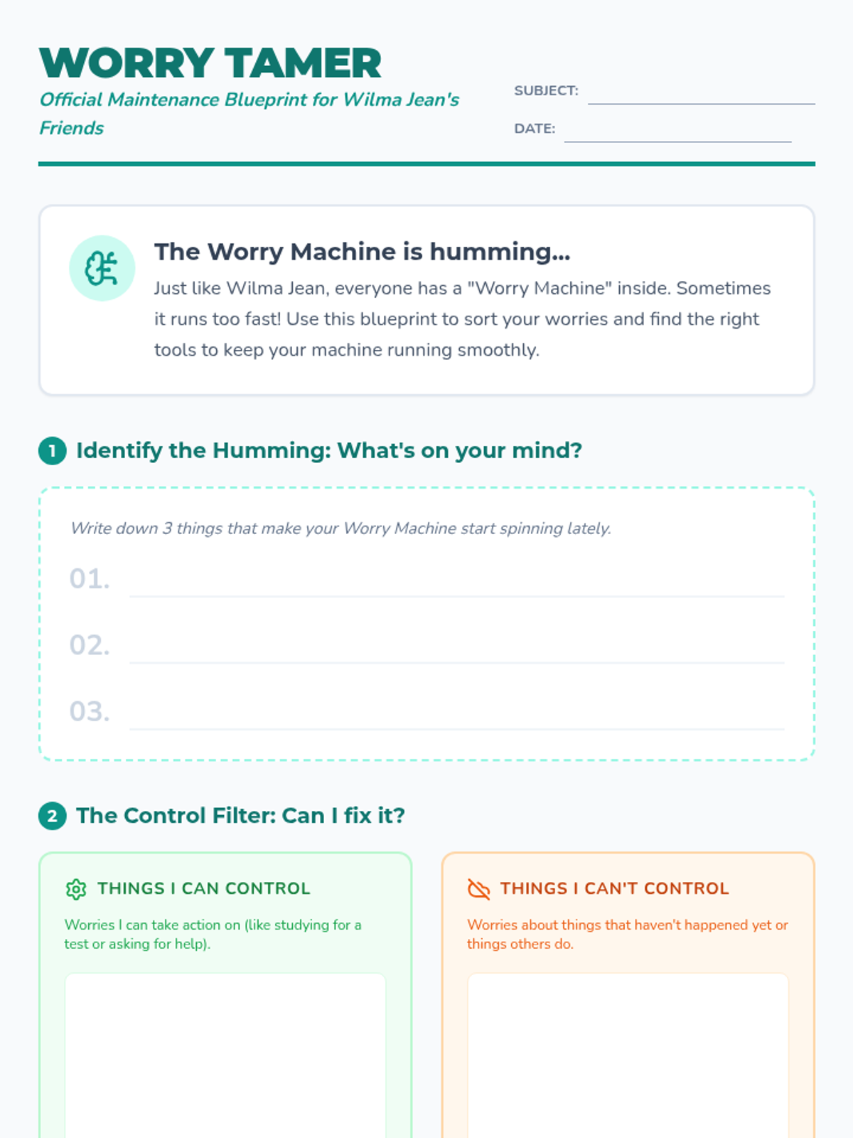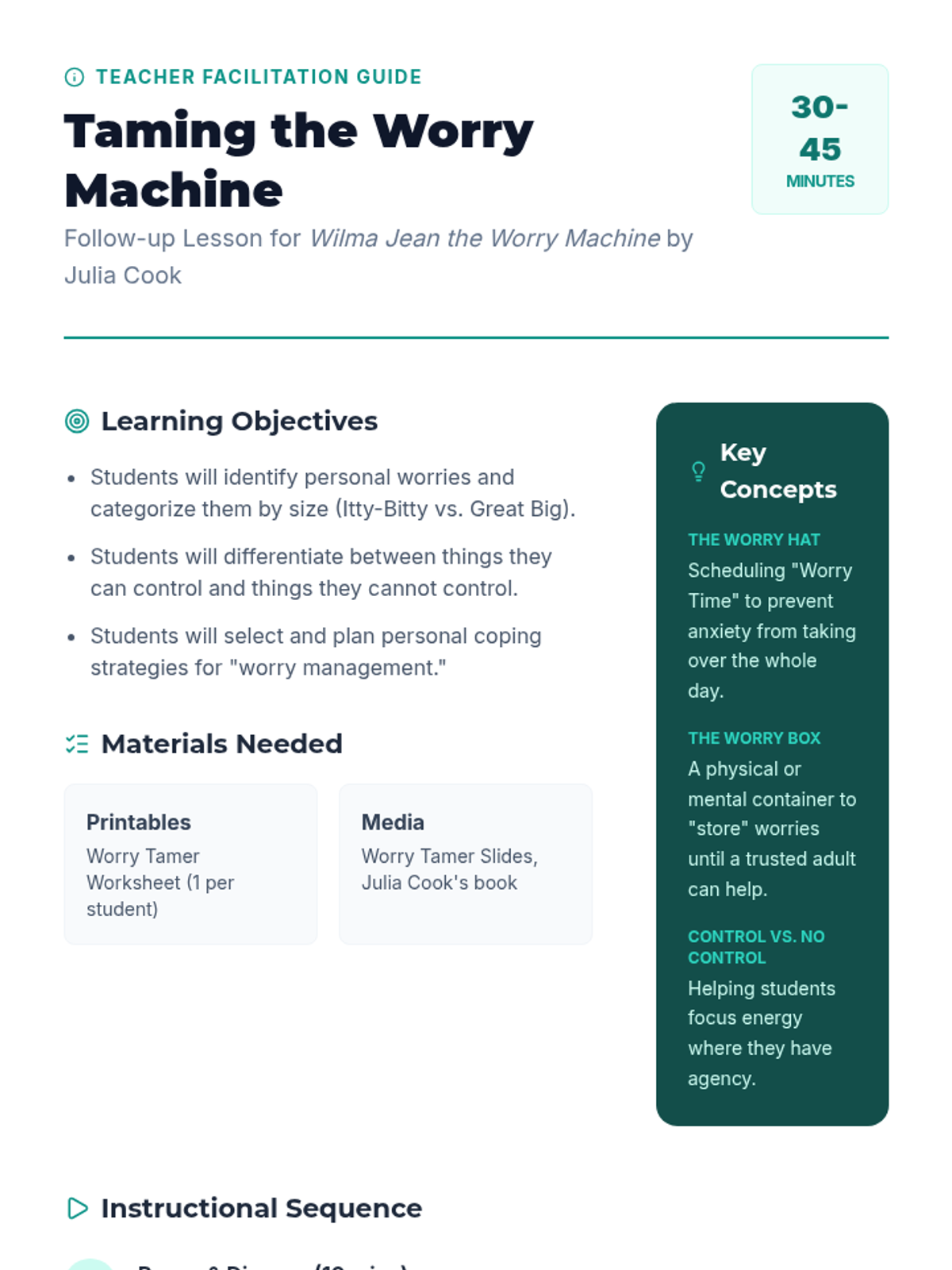 A follow-up lesson for Julia Cook's 'Wilma Jean the Worry Machine' focused on identifying worries, categorizing them by control, and developing personal coping strategies.