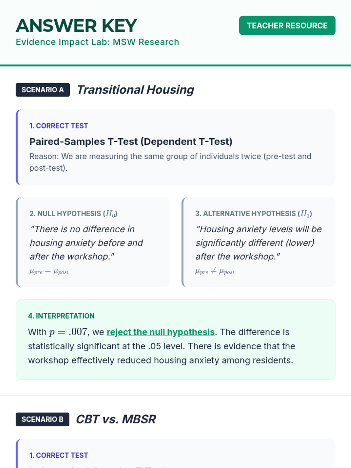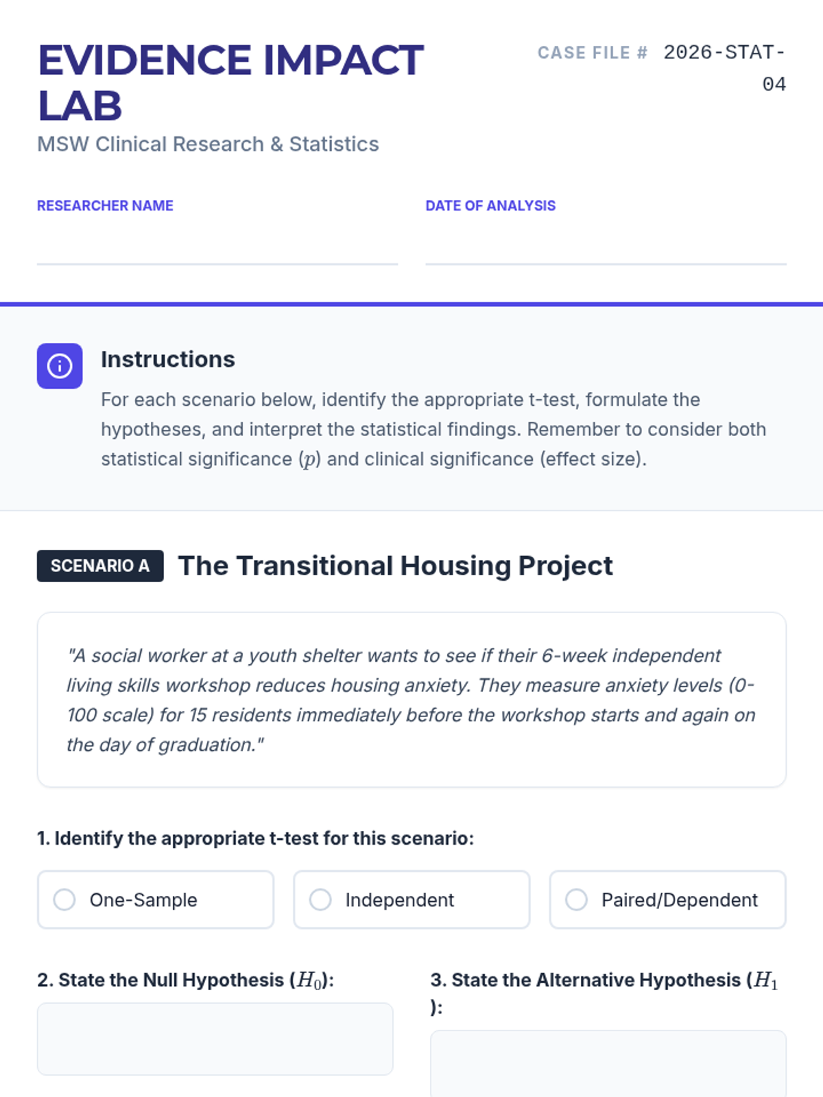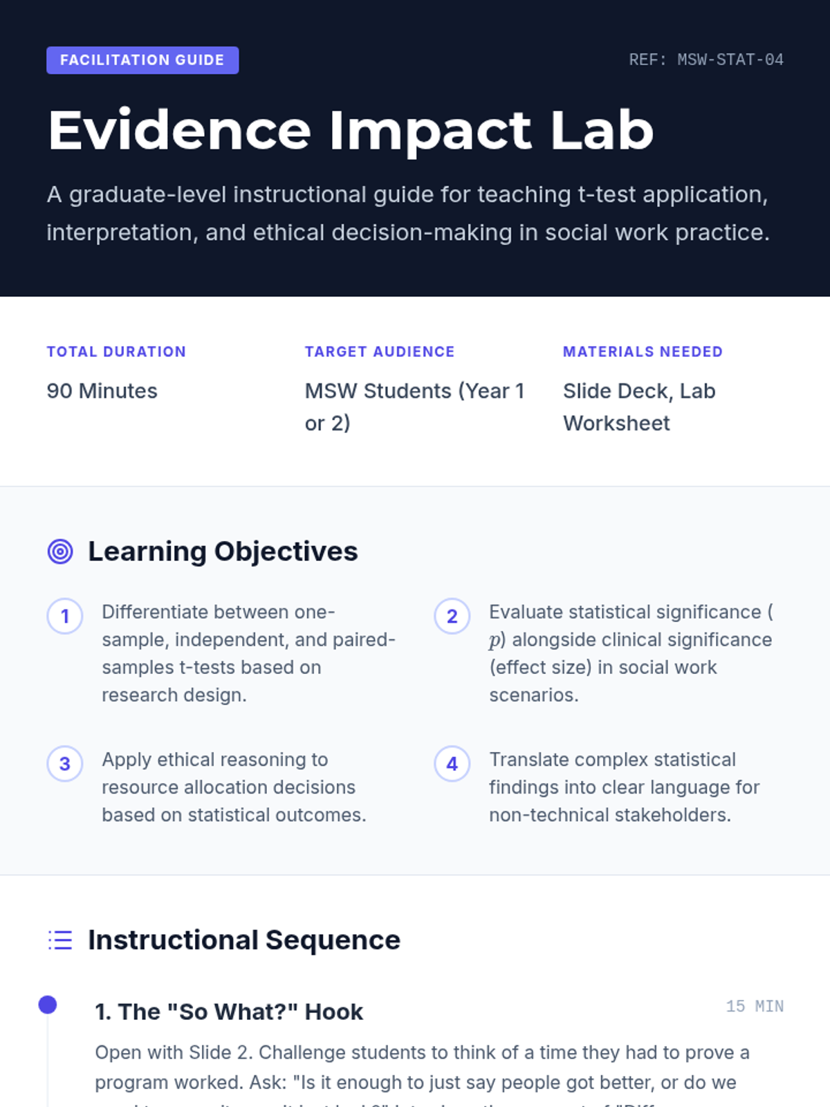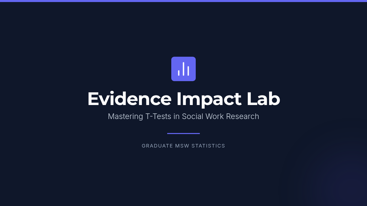 This lesson introduces graduate social work students to t-test statistics, focusing on practical application in evidence-based practice and program evaluation. Students will learn to select, calculate, and interpret independent, paired, and one-sample t-tests using real-world social work scenarios.