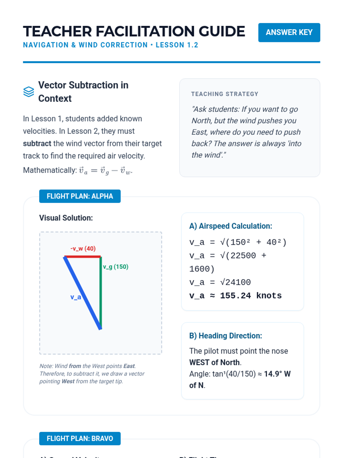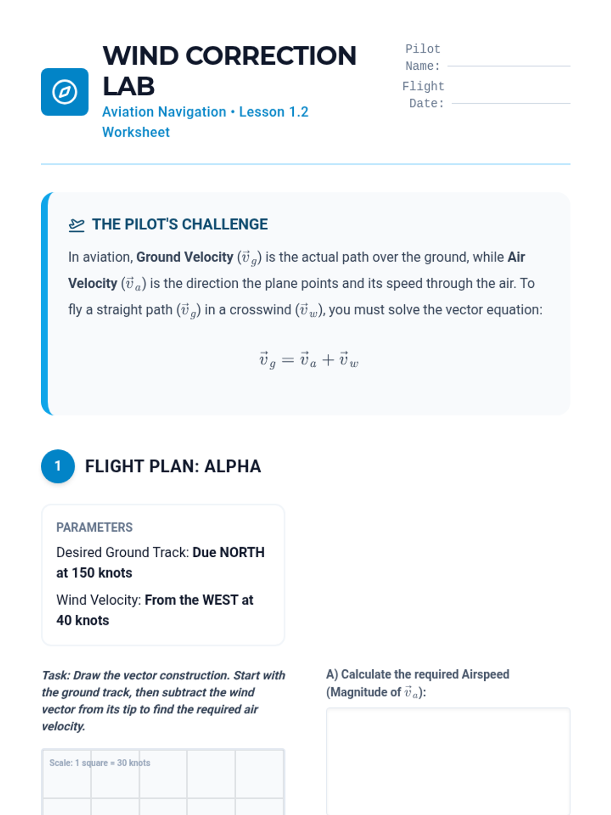 Students calculate the necessary heading to counteract crosswinds, applying vector subtraction and navigation concepts.