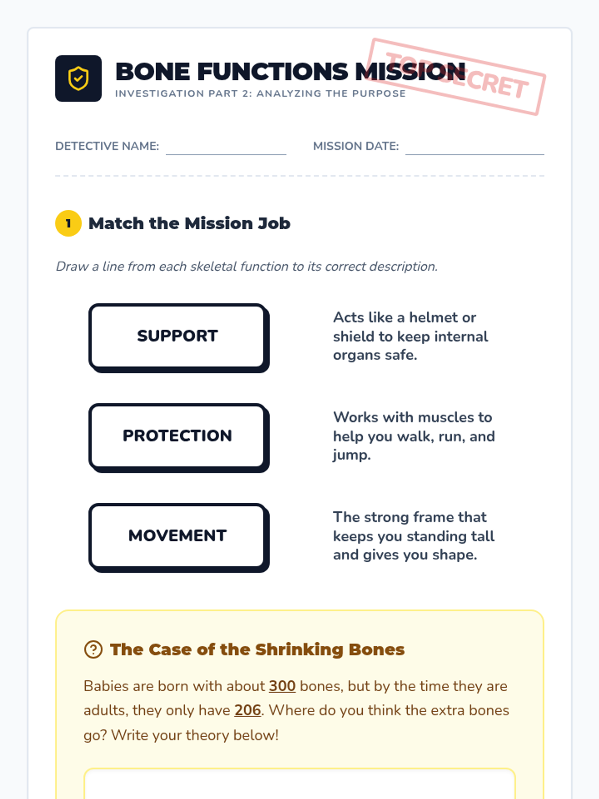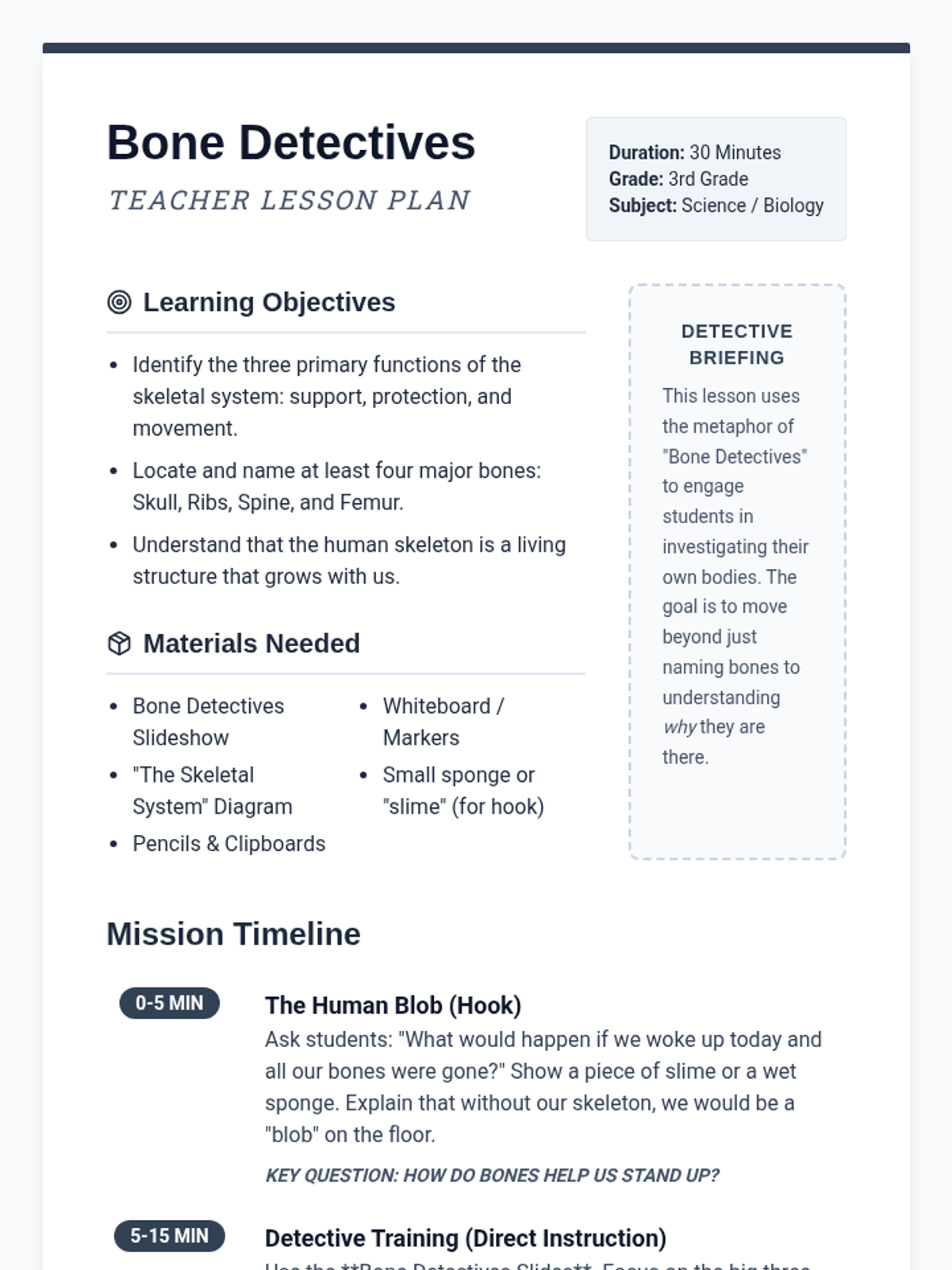 A 30-minute introductory lesson for 3rd graders about the skeletal system, focusing on major bones and their functions through the lens of being 'Bone Detectives'.