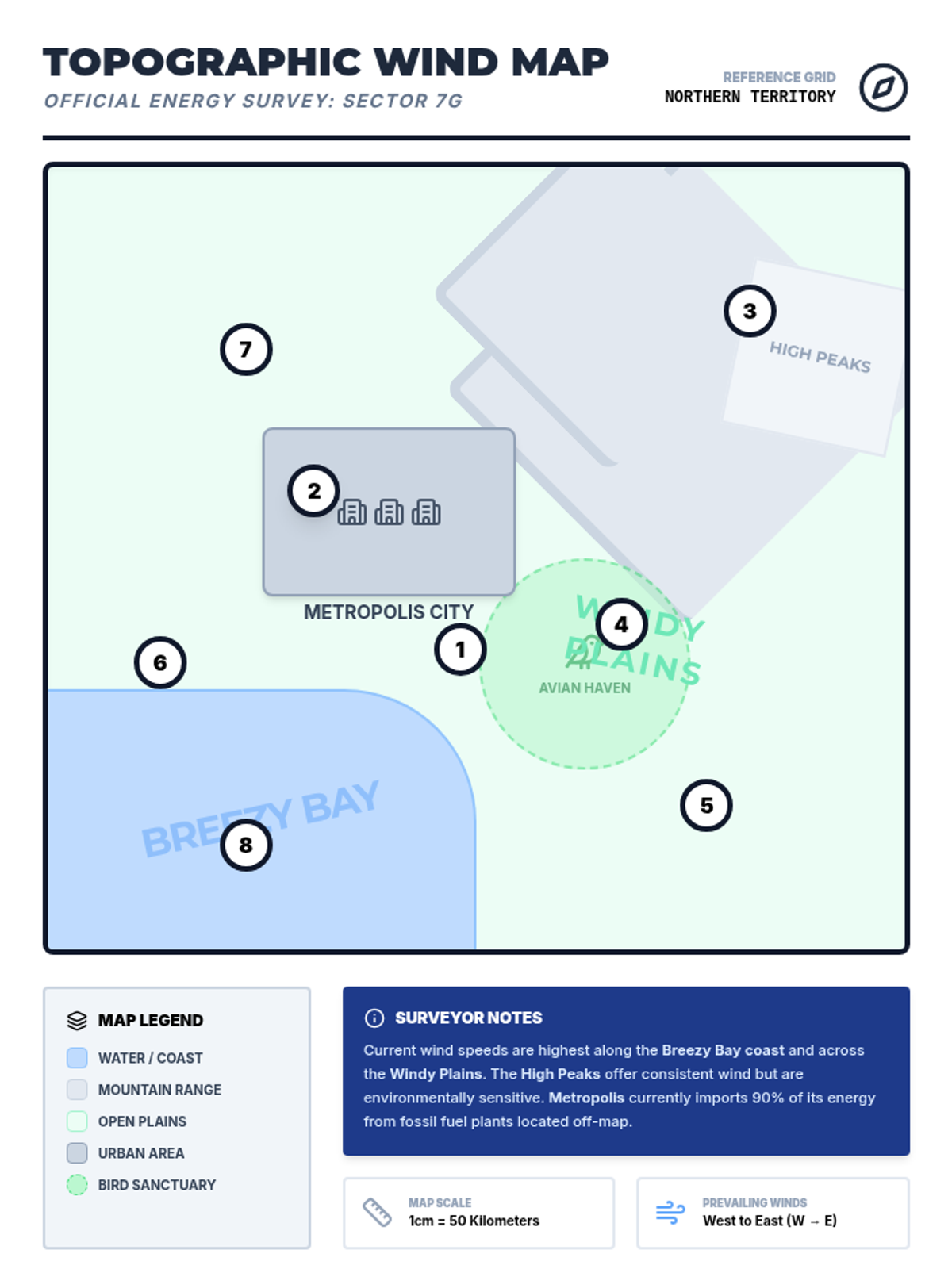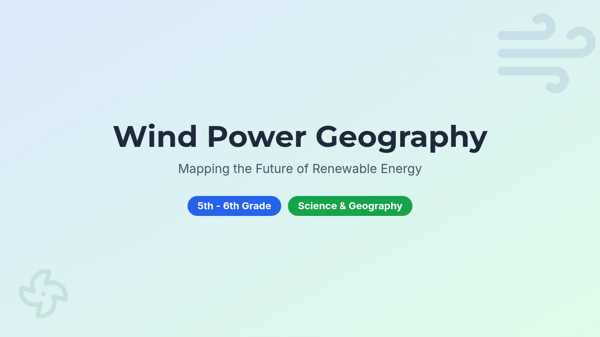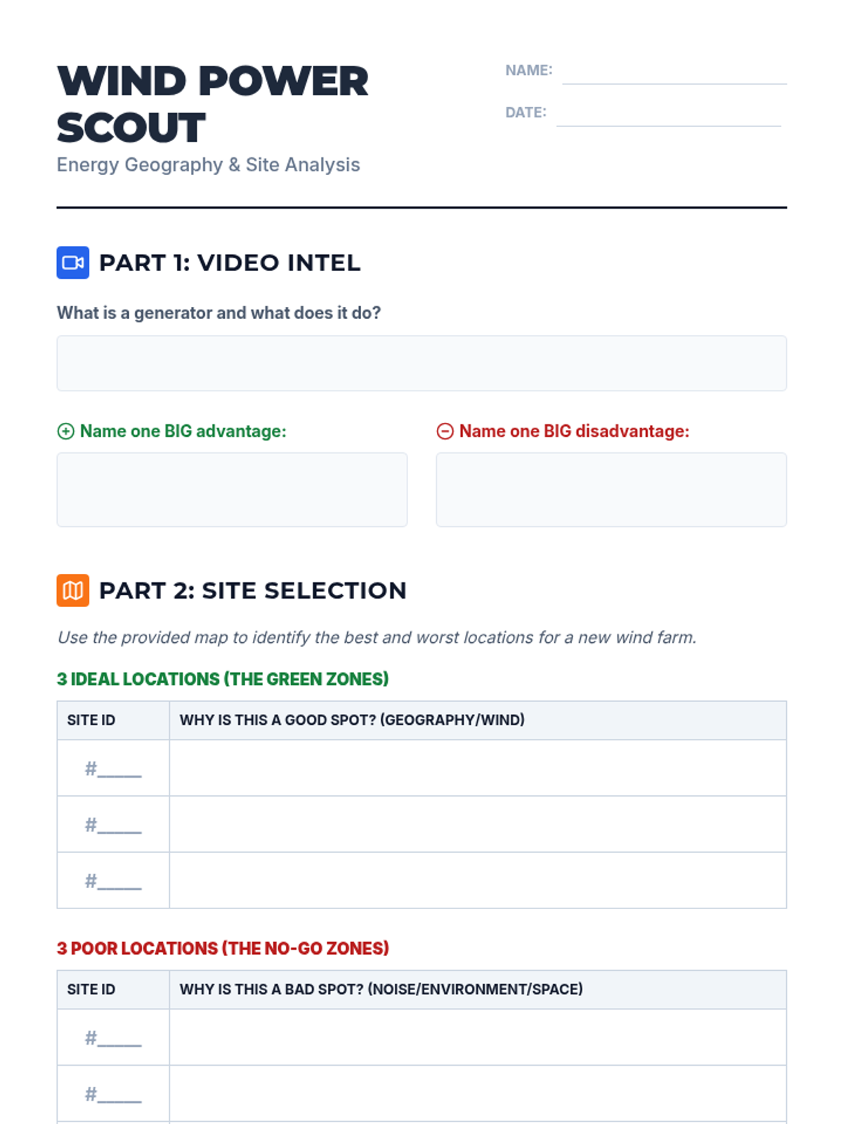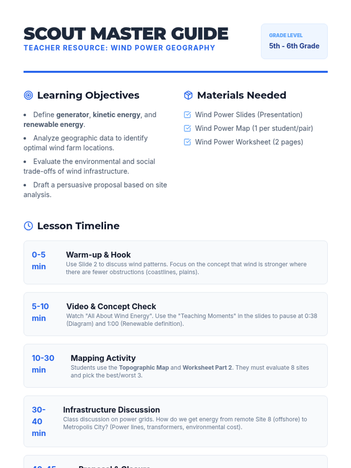 A lesson where students analyze the geography of wind energy production, identify ideal wind farm locations, and weigh the pros and cons of renewable energy infrastructure.