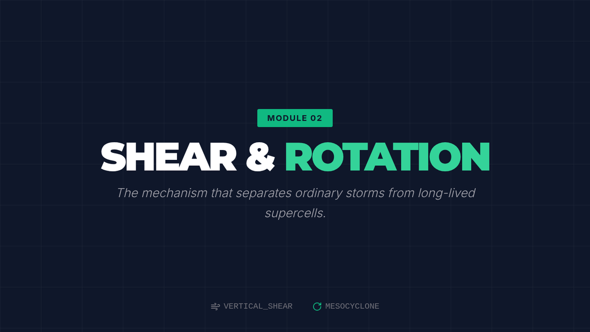 Introduces vertical wind shear as the mechanism that creates rotation in updrafts, transforming ordinary storms into supercells.