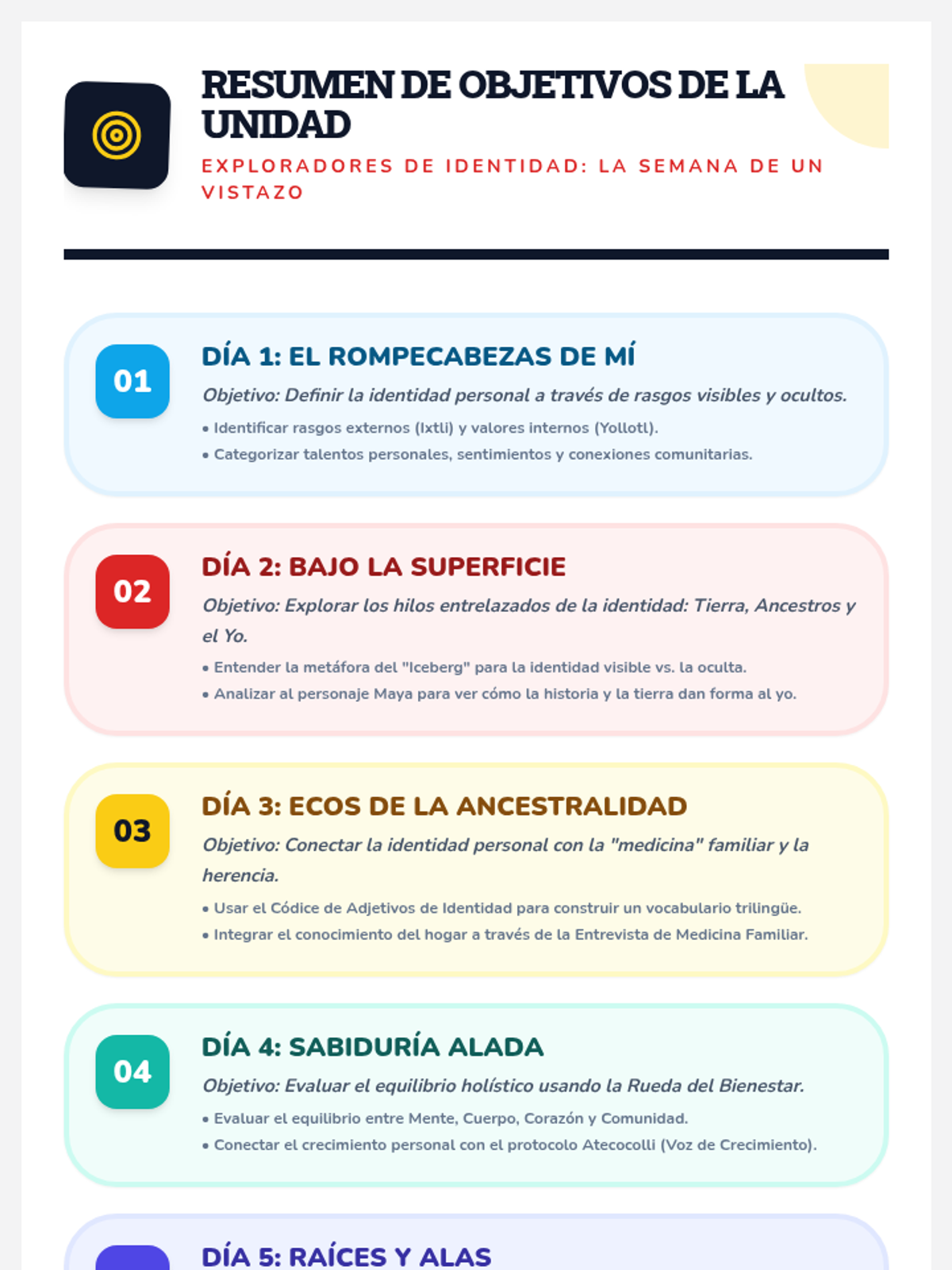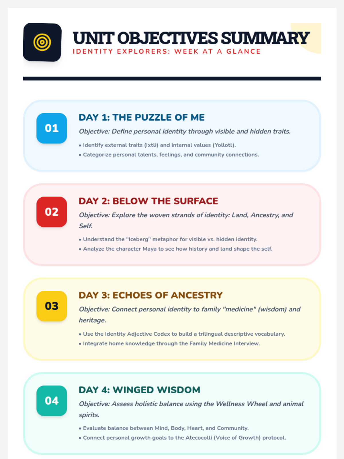 Day 5: Synthesizing all identity concepts into a personal "I Come From" poem and evaluating success with the unit rubric.