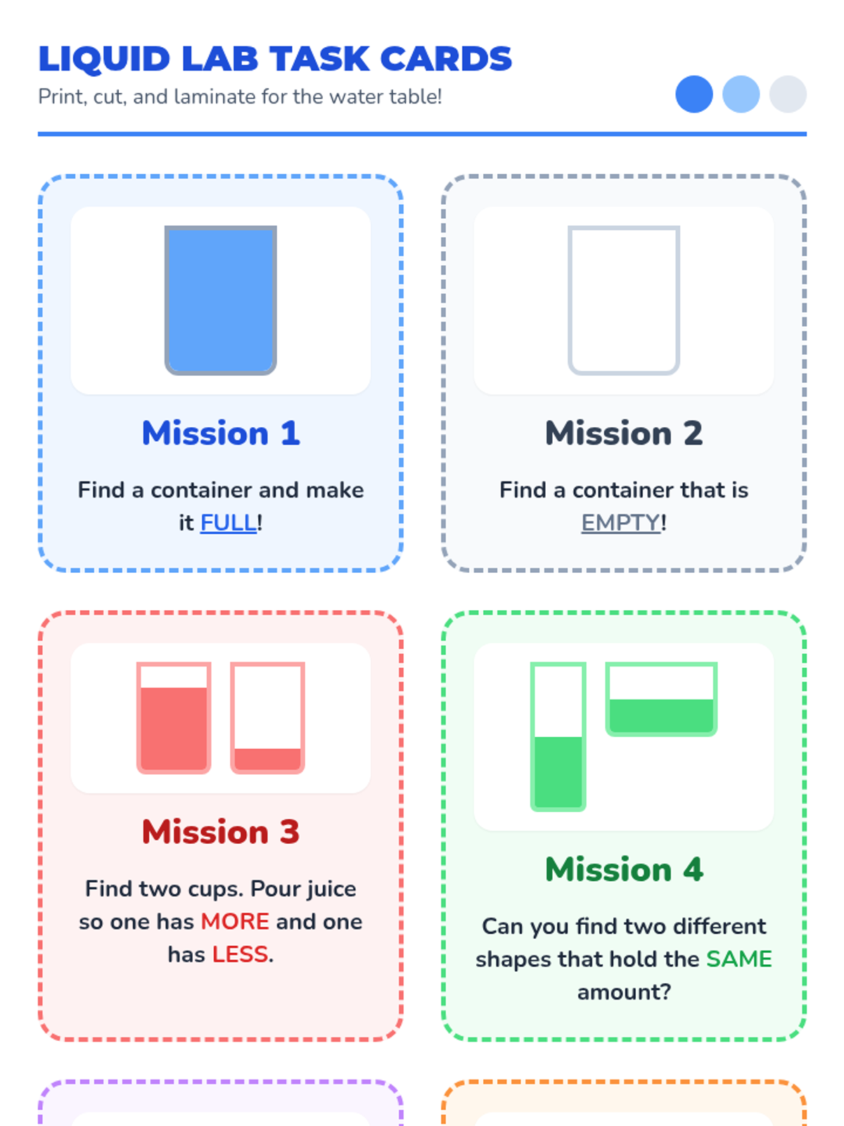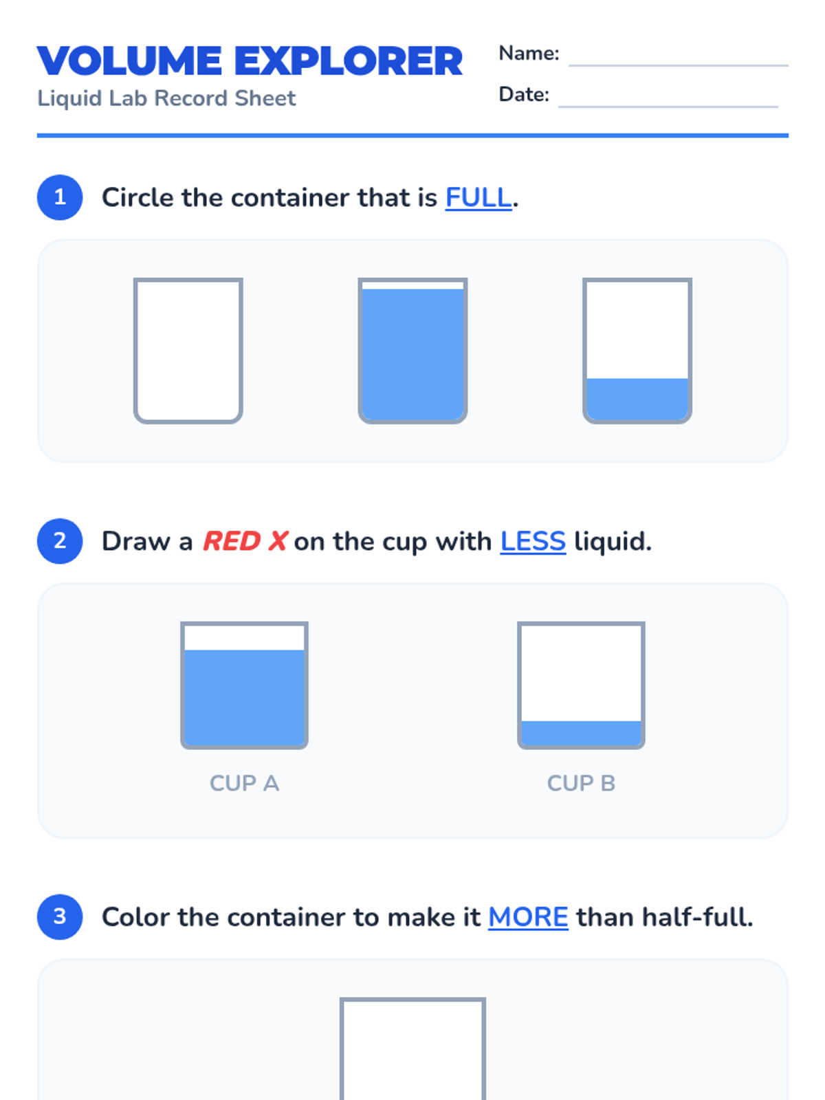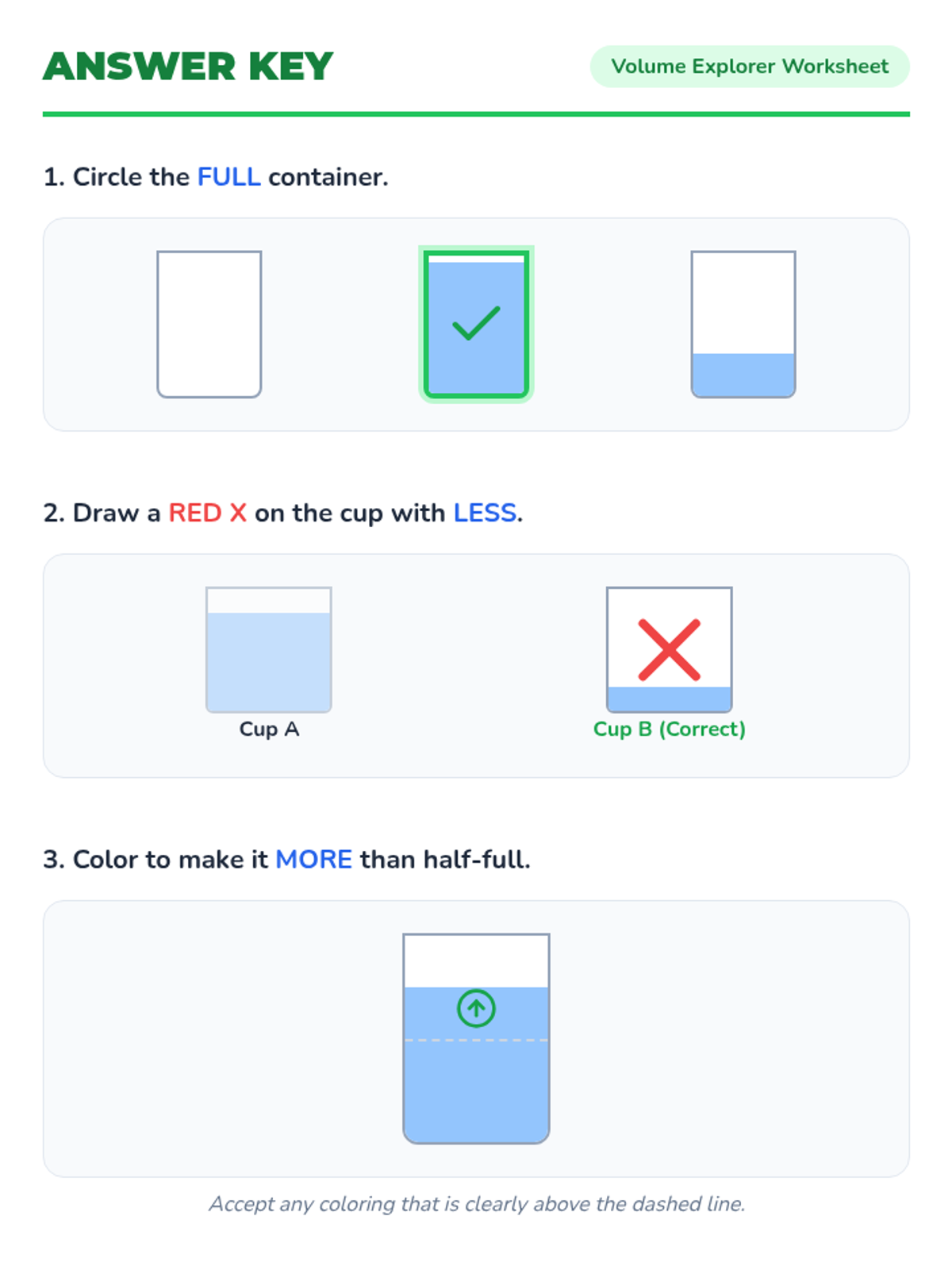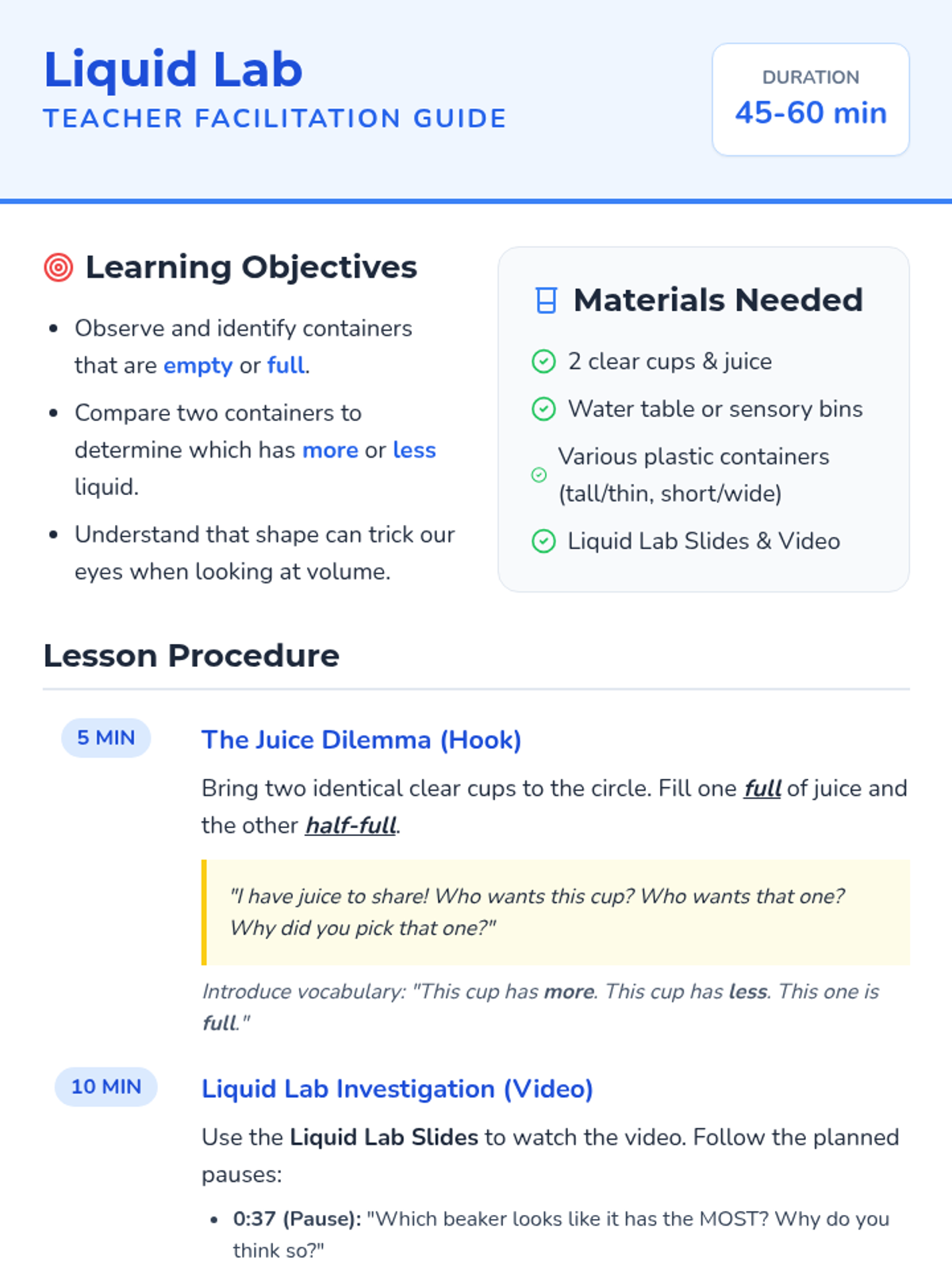 A hands-on kindergarten lesson exploring the concept of volume through direct comparison, video observation, and sensory play. Students learn to use the terms empty, full, more, and less while investigating how different containers hold liquids.