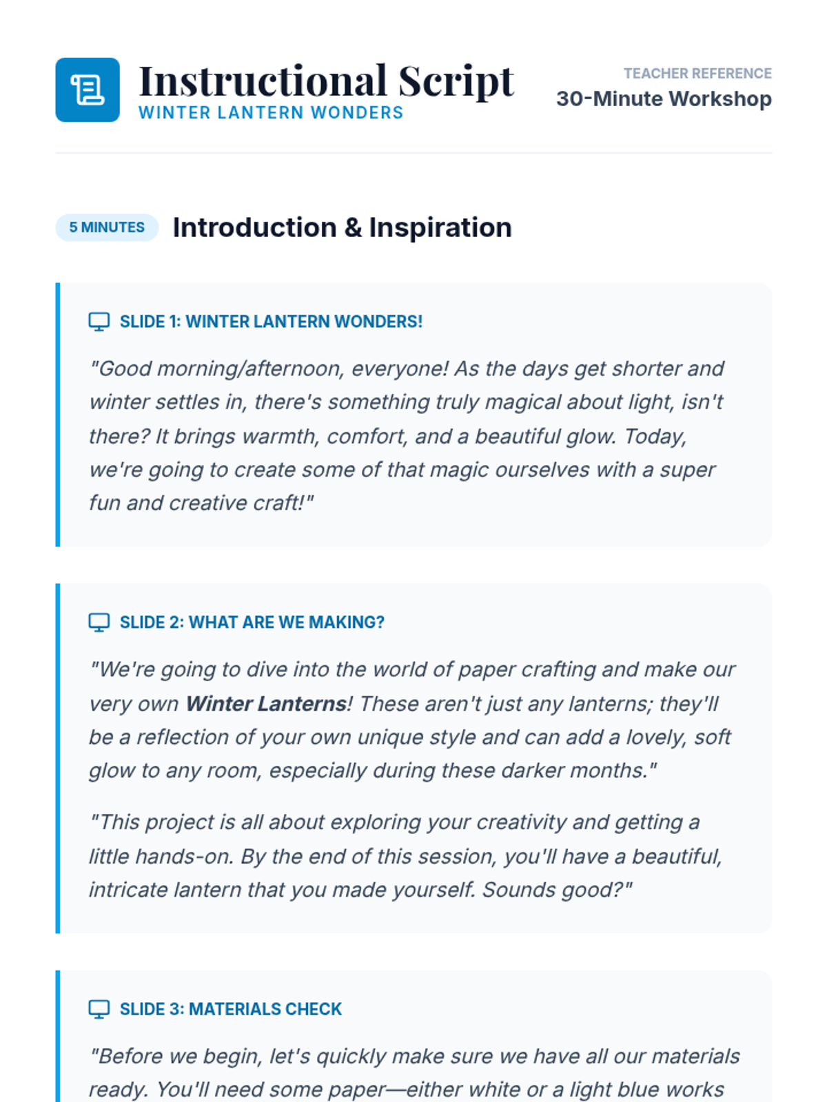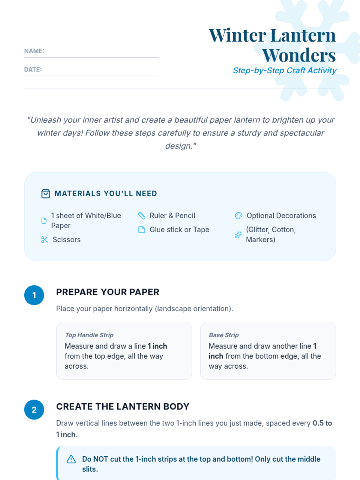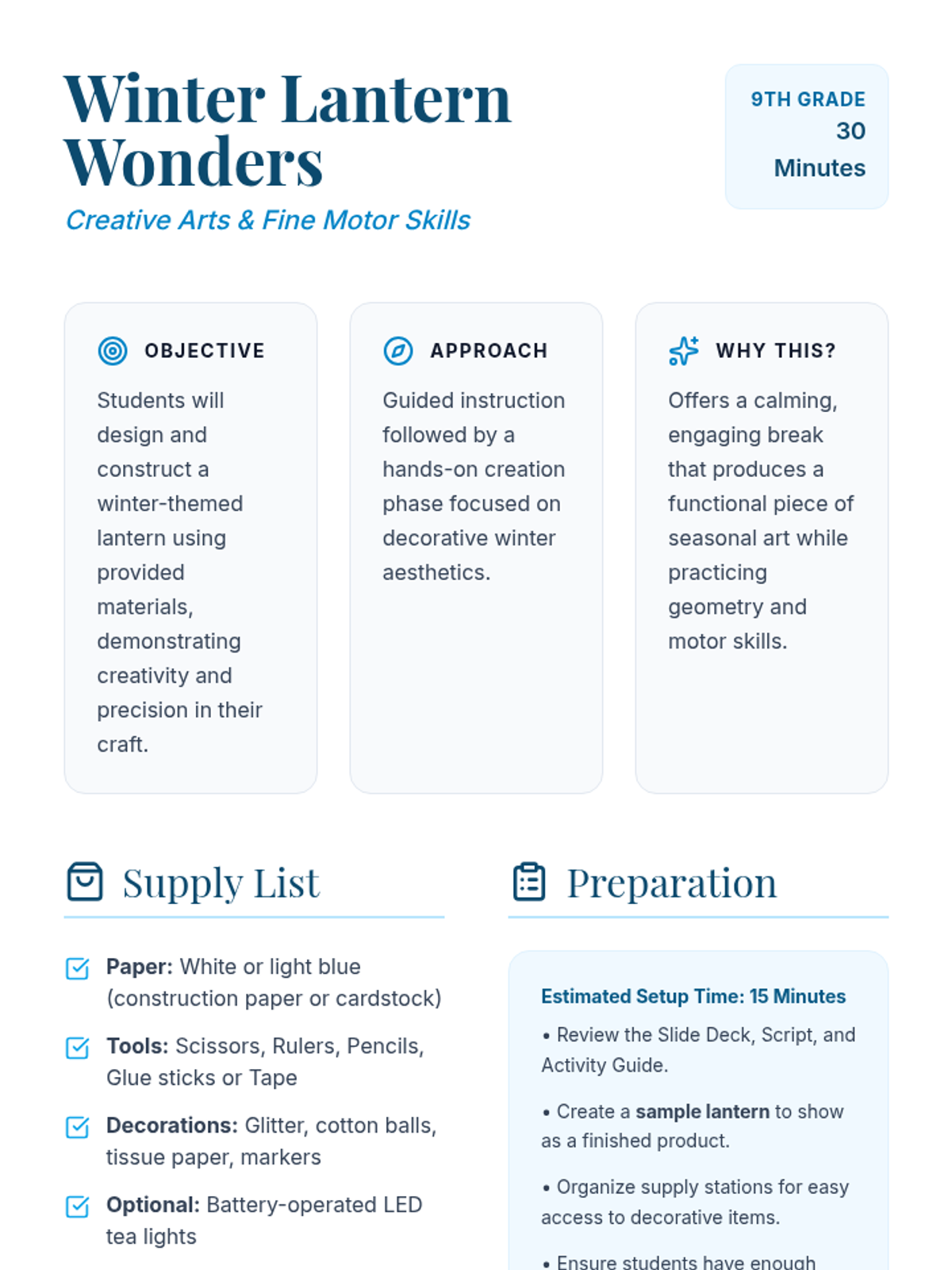 A 30-minute hands-on art activity for 9th-grade students where they design and construct intricate paper lanterns with a winter theme, fostering creativity and fine motor skills.