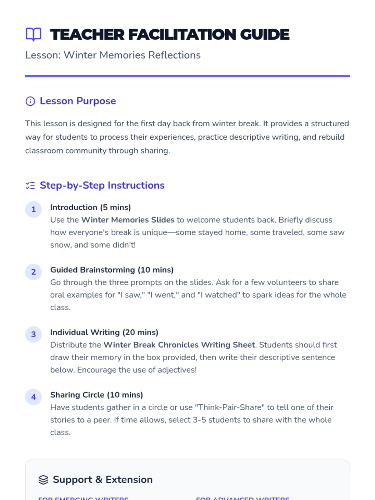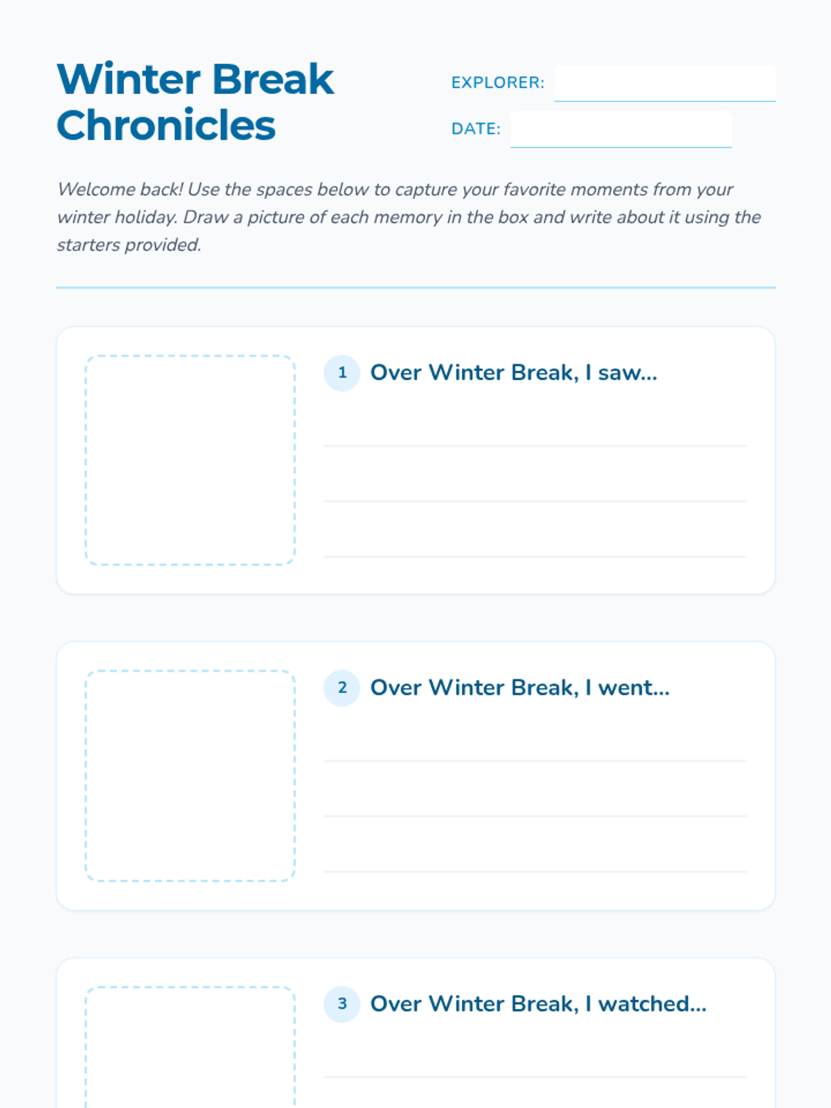 A reflective writing lesson designed to help students share their experiences from winter break through guided prompts and descriptive storytelling.