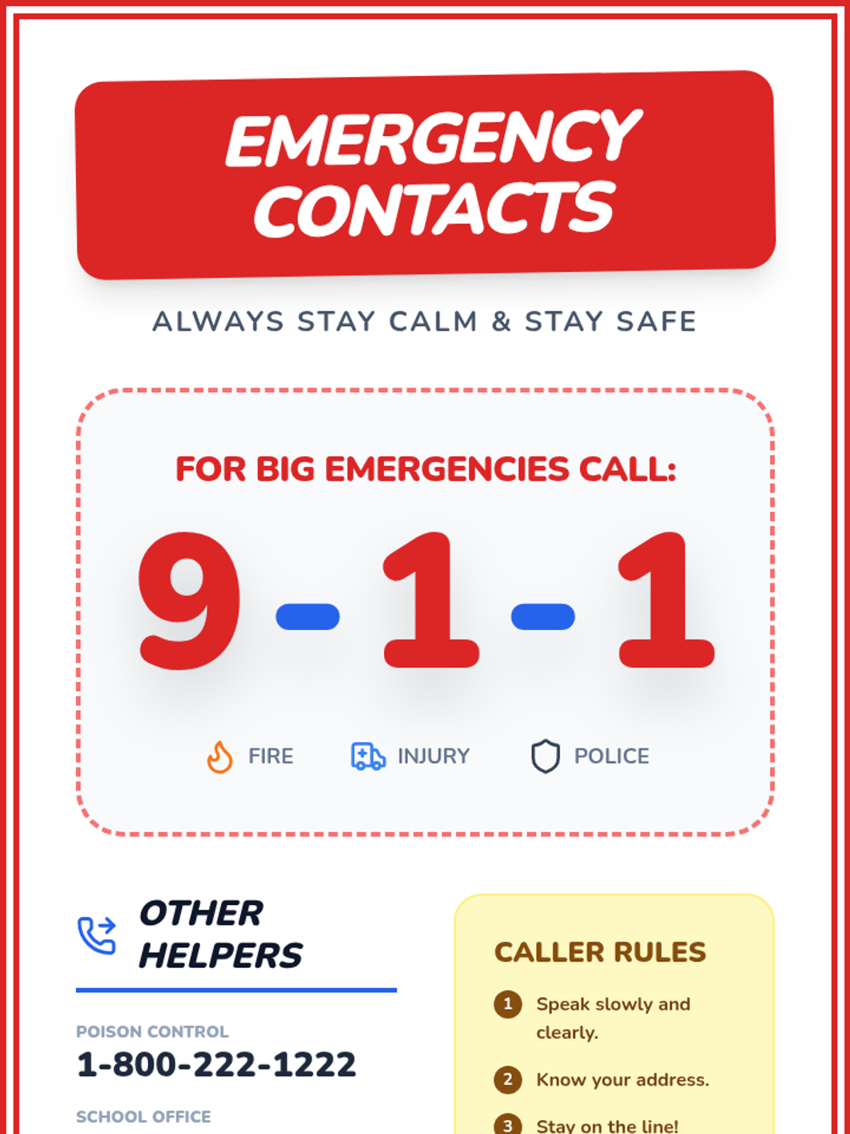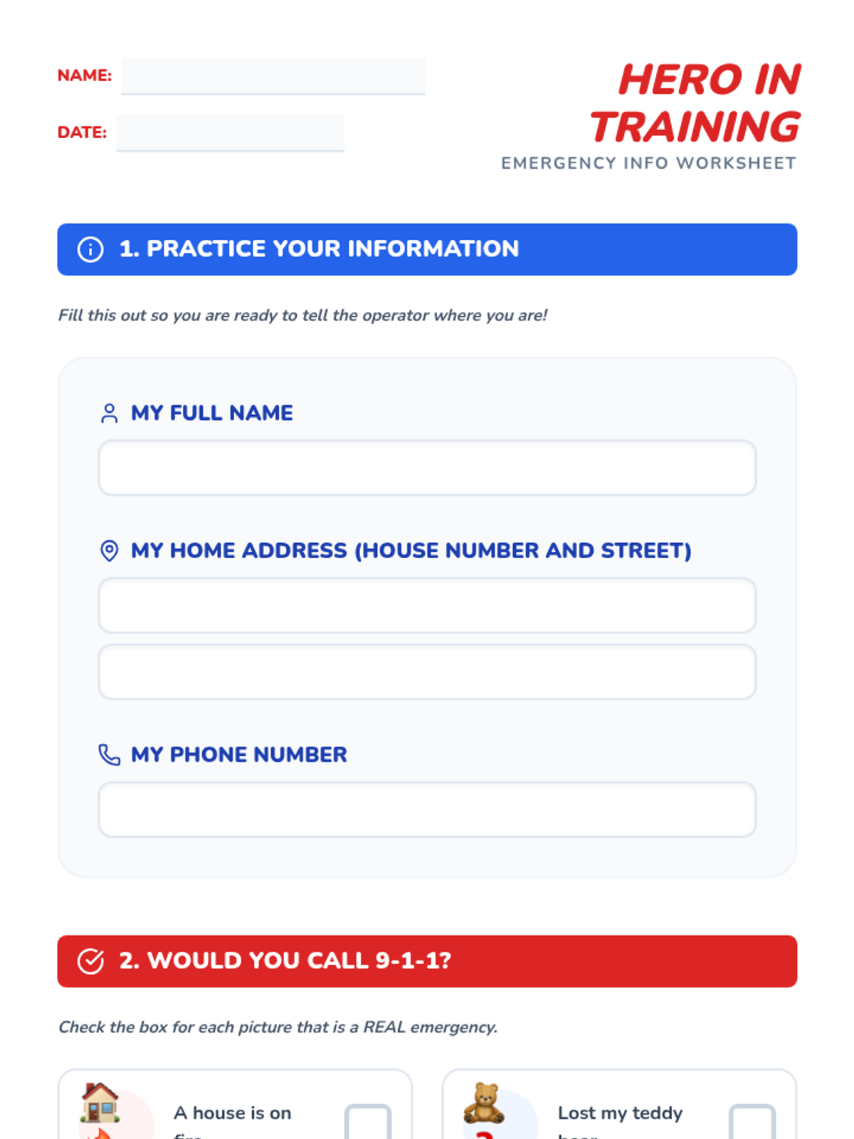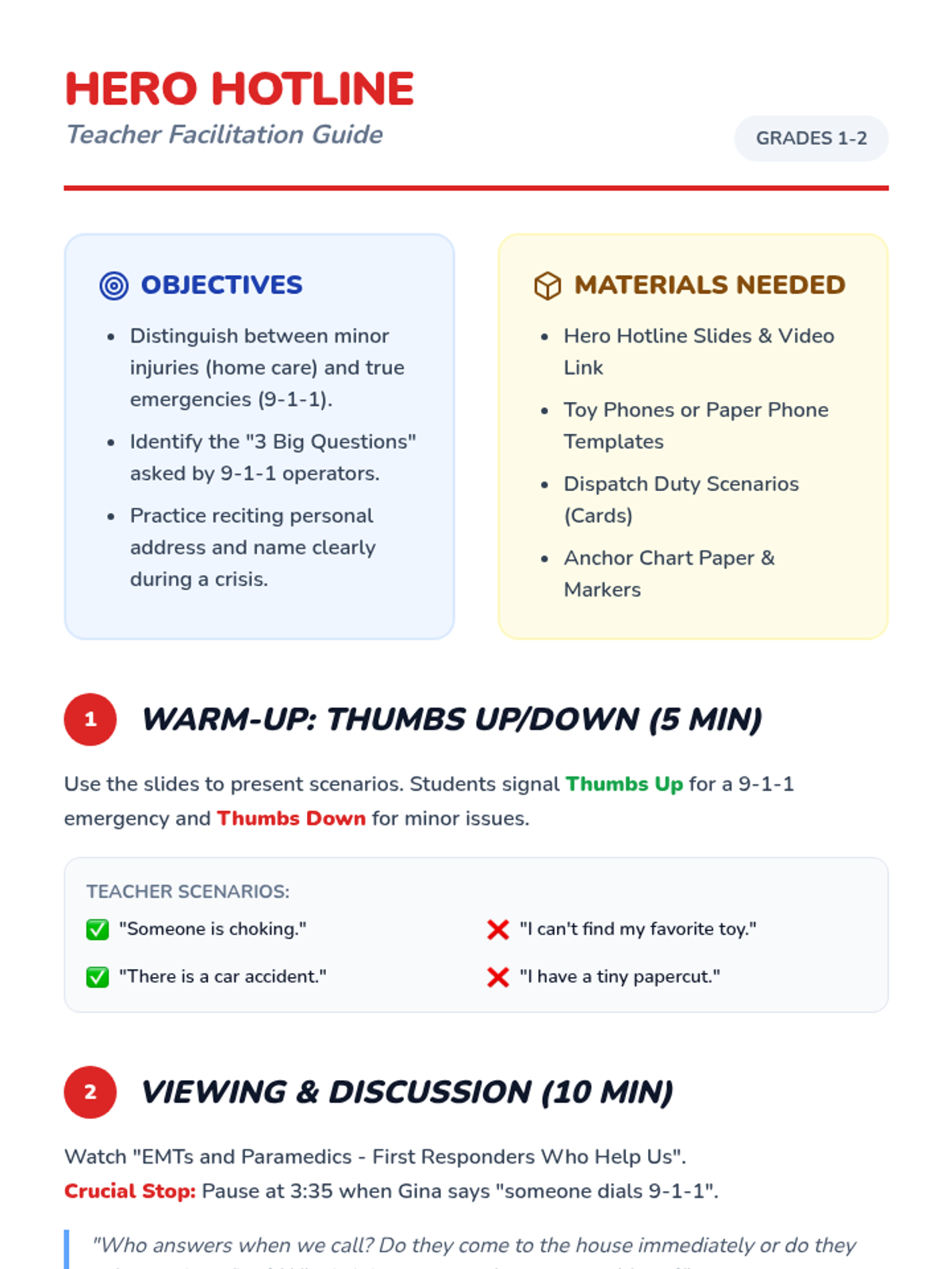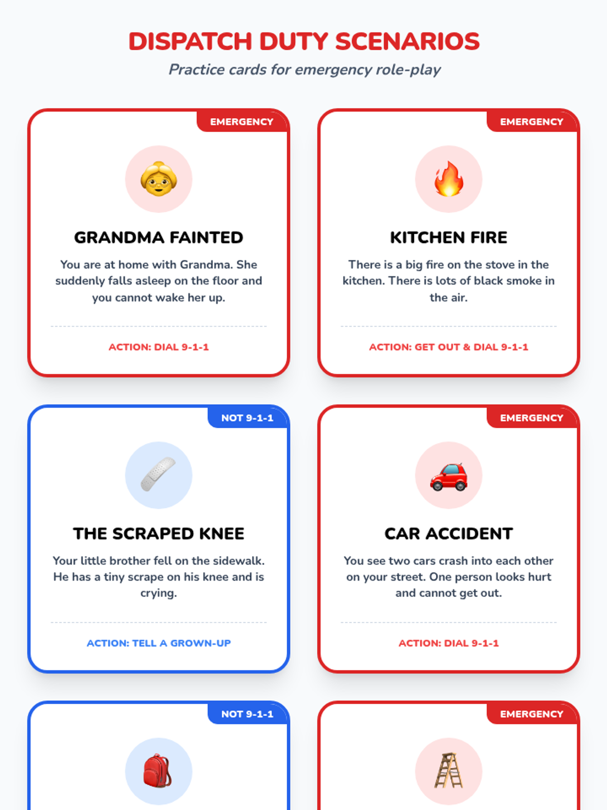 A lesson for 1st and 2nd graders to distinguish between minor injuries and real emergencies, and to practice the essential skills of calling 9-1-1.