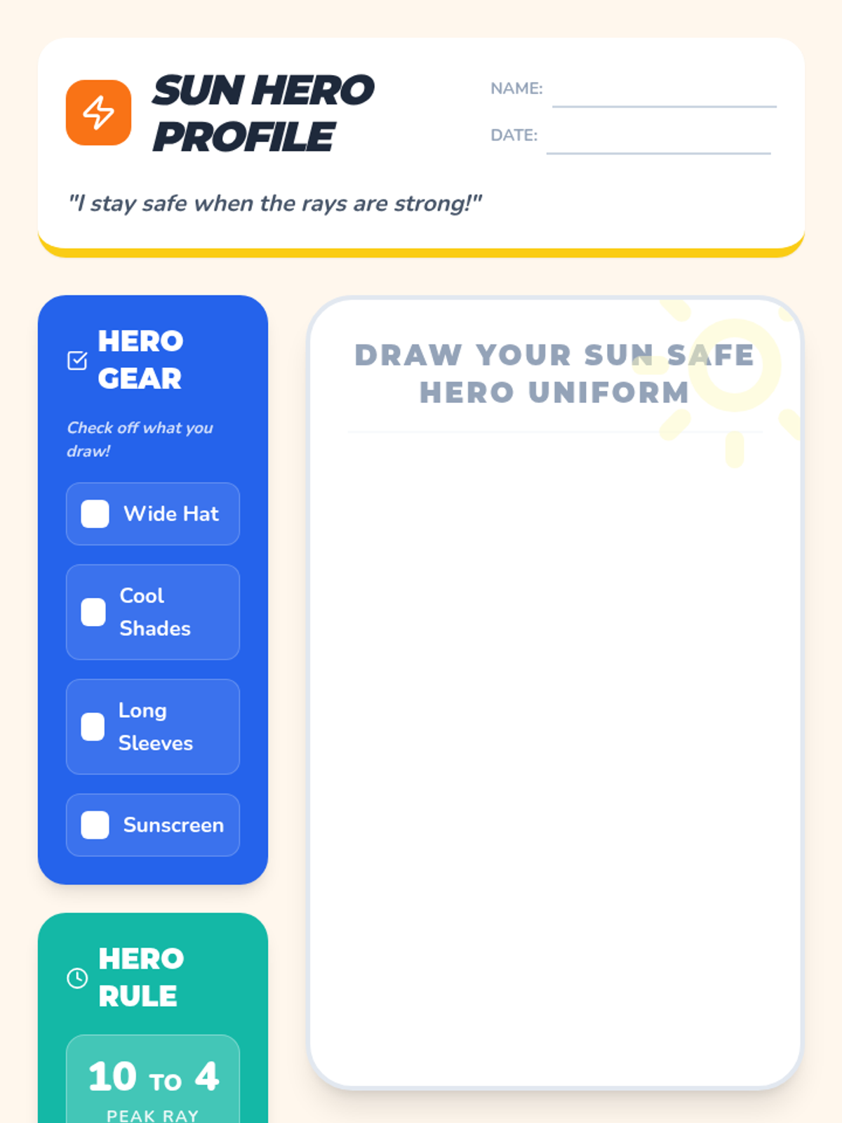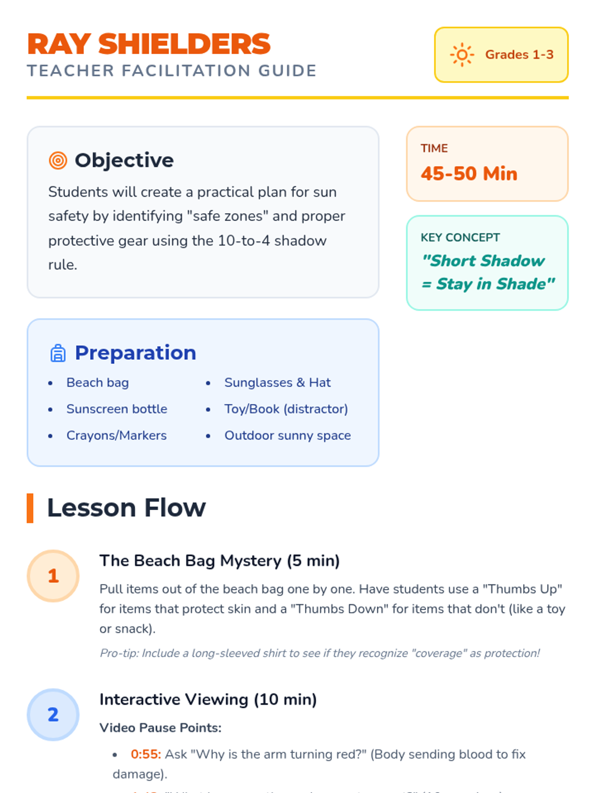 A high-energy sun safety lesson where students learn the '10-to-4 rule', identify peak sun hours through shadow observation, and design their own 'Sun Safe Hero' persona to practice real-world prevention strategies.
