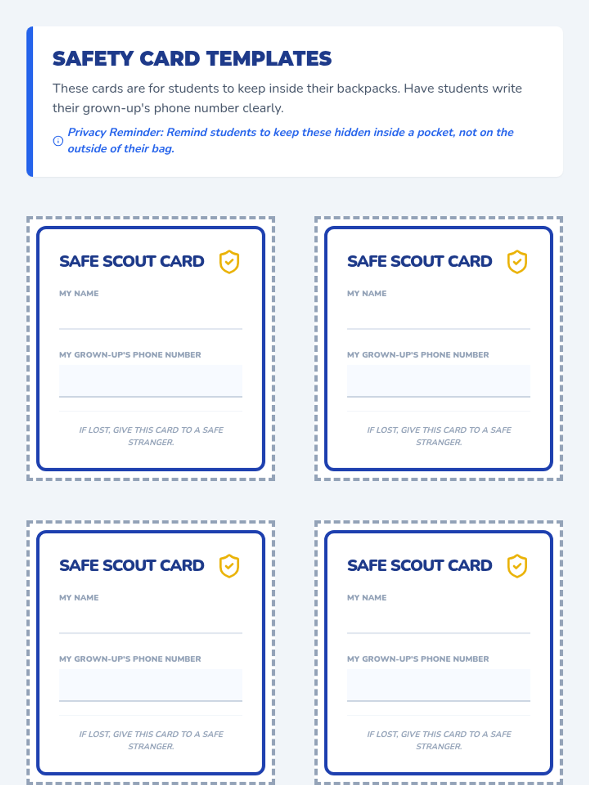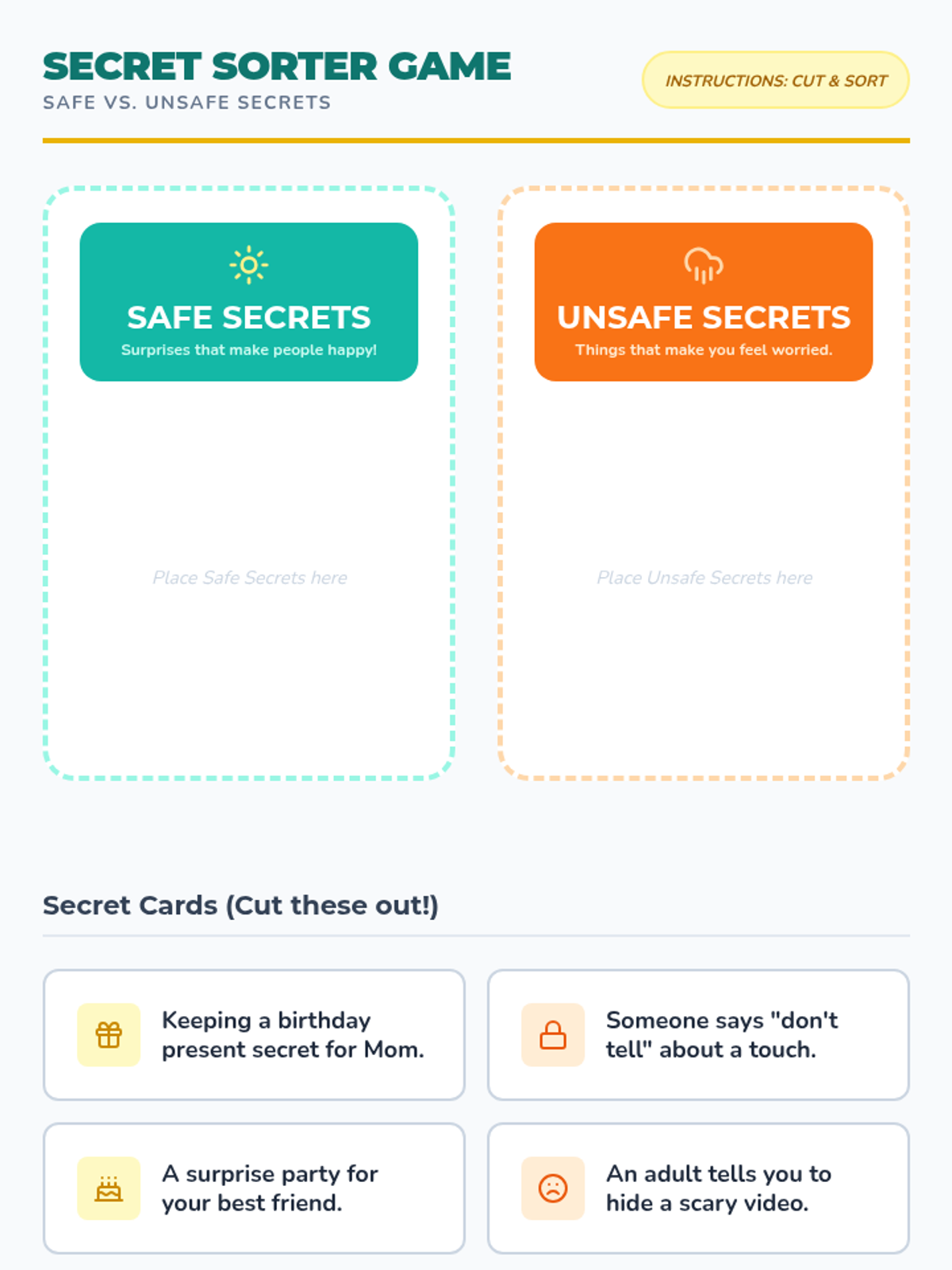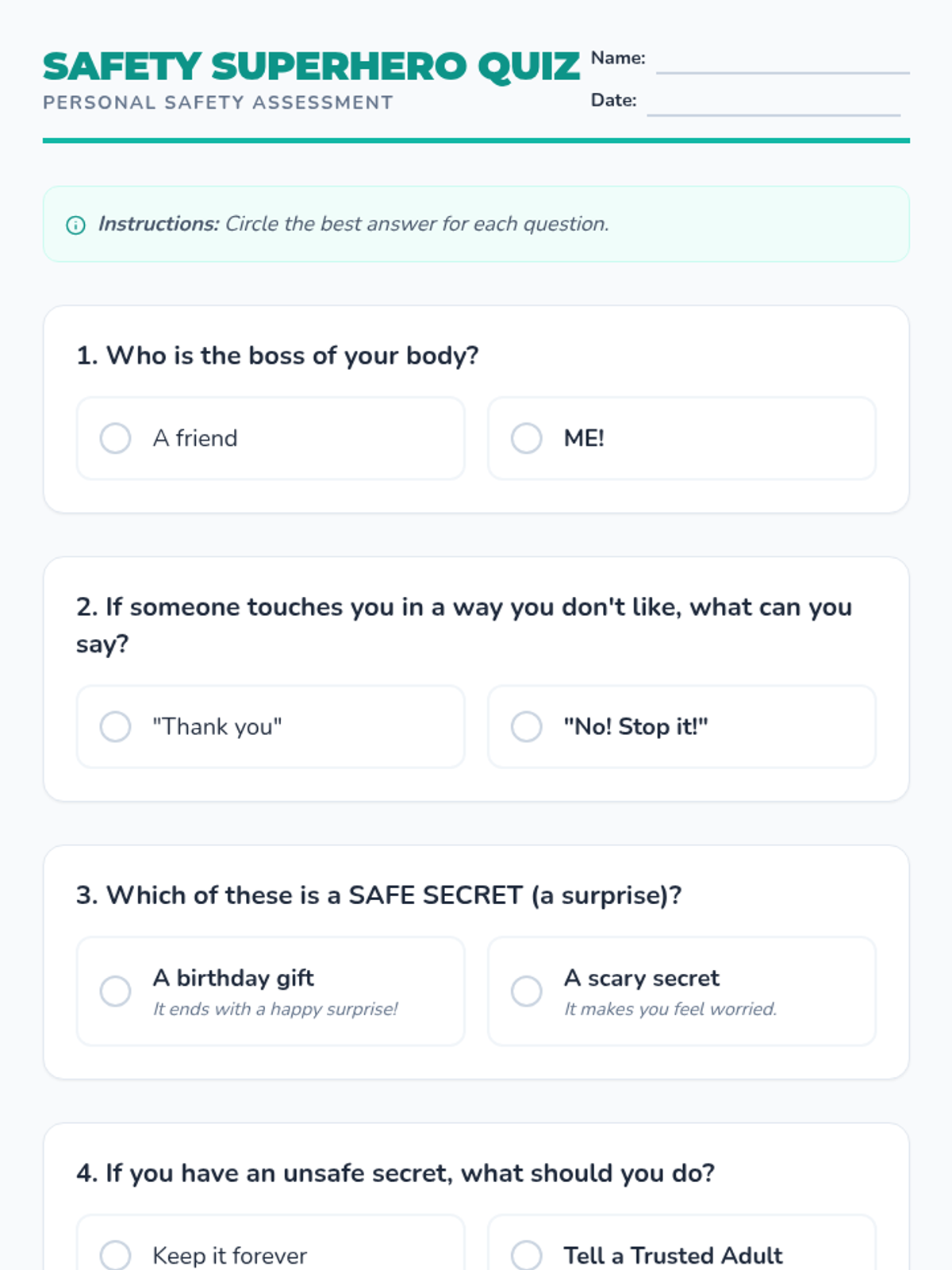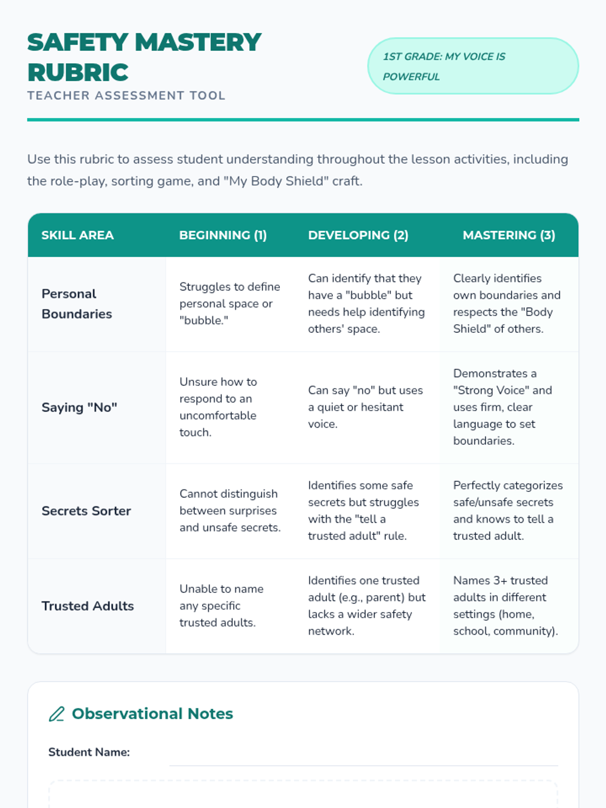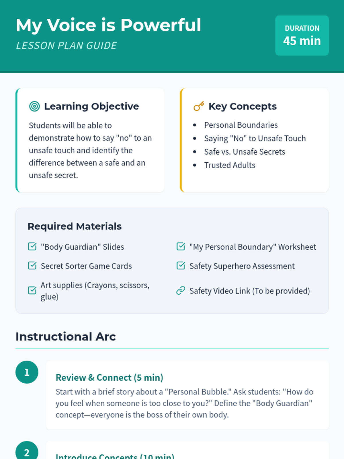 A 1st-grade lesson focused on personal safety, empowering students to set physical boundaries, say 'no' to unsafe touches, and distinguish between safe and unsafe secrets.