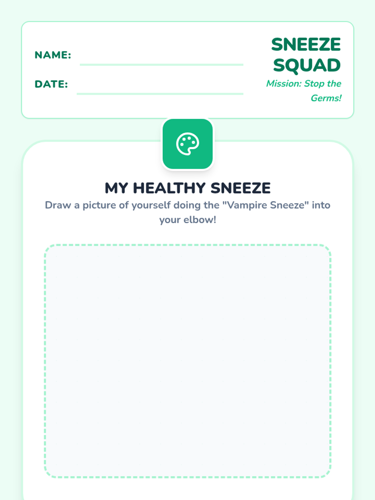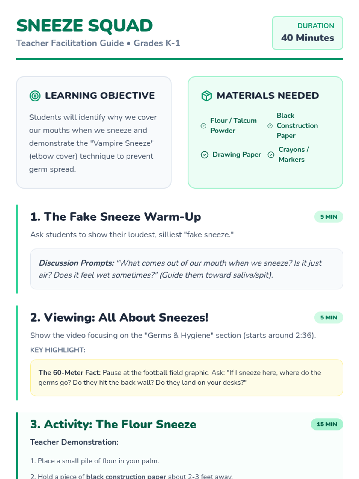 A fun, interactive lesson for K-1 students to understand the importance of covering their sneezes using a visual flour demonstration and the 'Vampire Sneeze' technique.