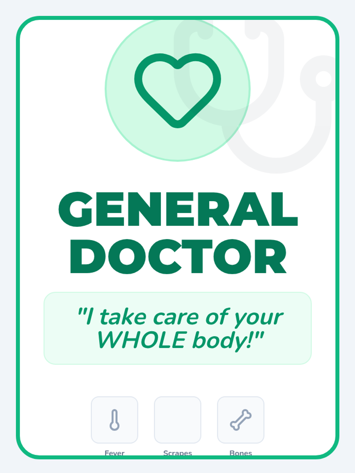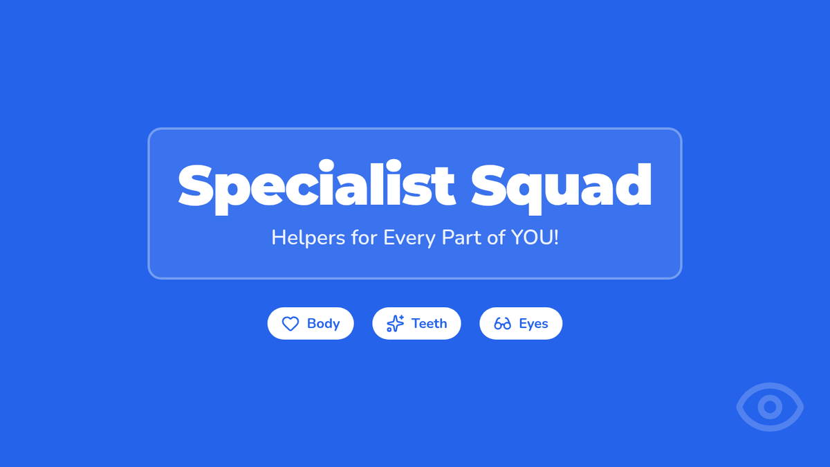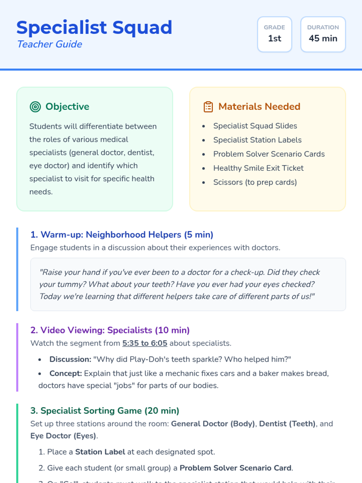 A 1st-grade health and social studies lesson exploring the different roles of medical specialists, including general doctors, dentists, and eye doctors, featuring a community helper video and interactive sorting game.