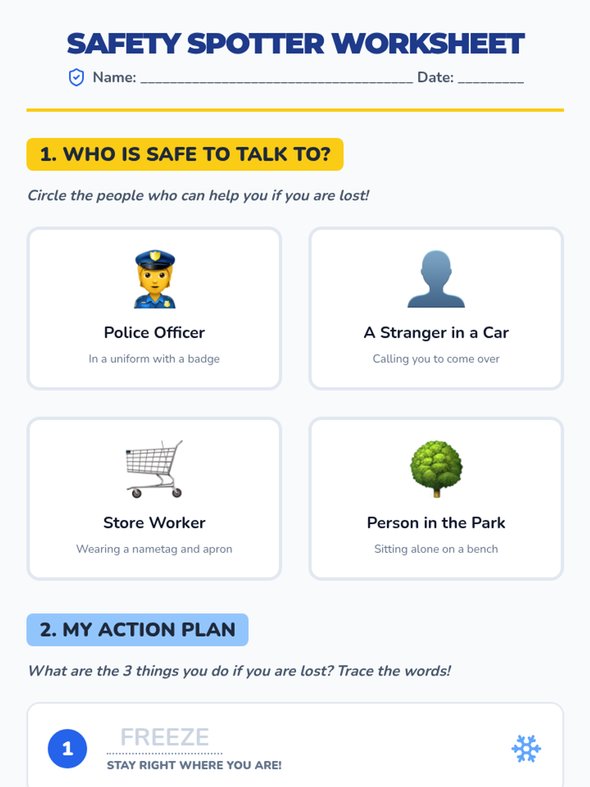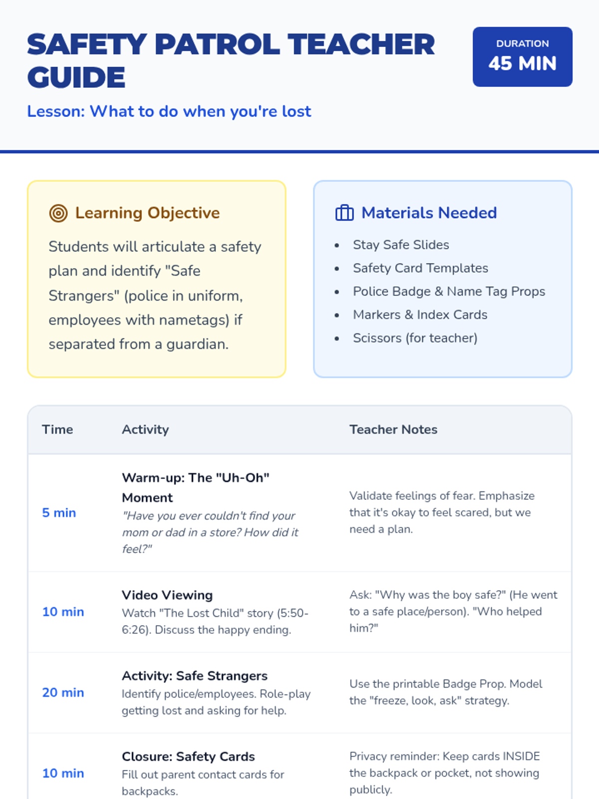 A safety-focused lesson for 1st and 2nd graders about what to do if they get lost in public, featuring a video about police officers and role-playing with 'Safe Strangers'.