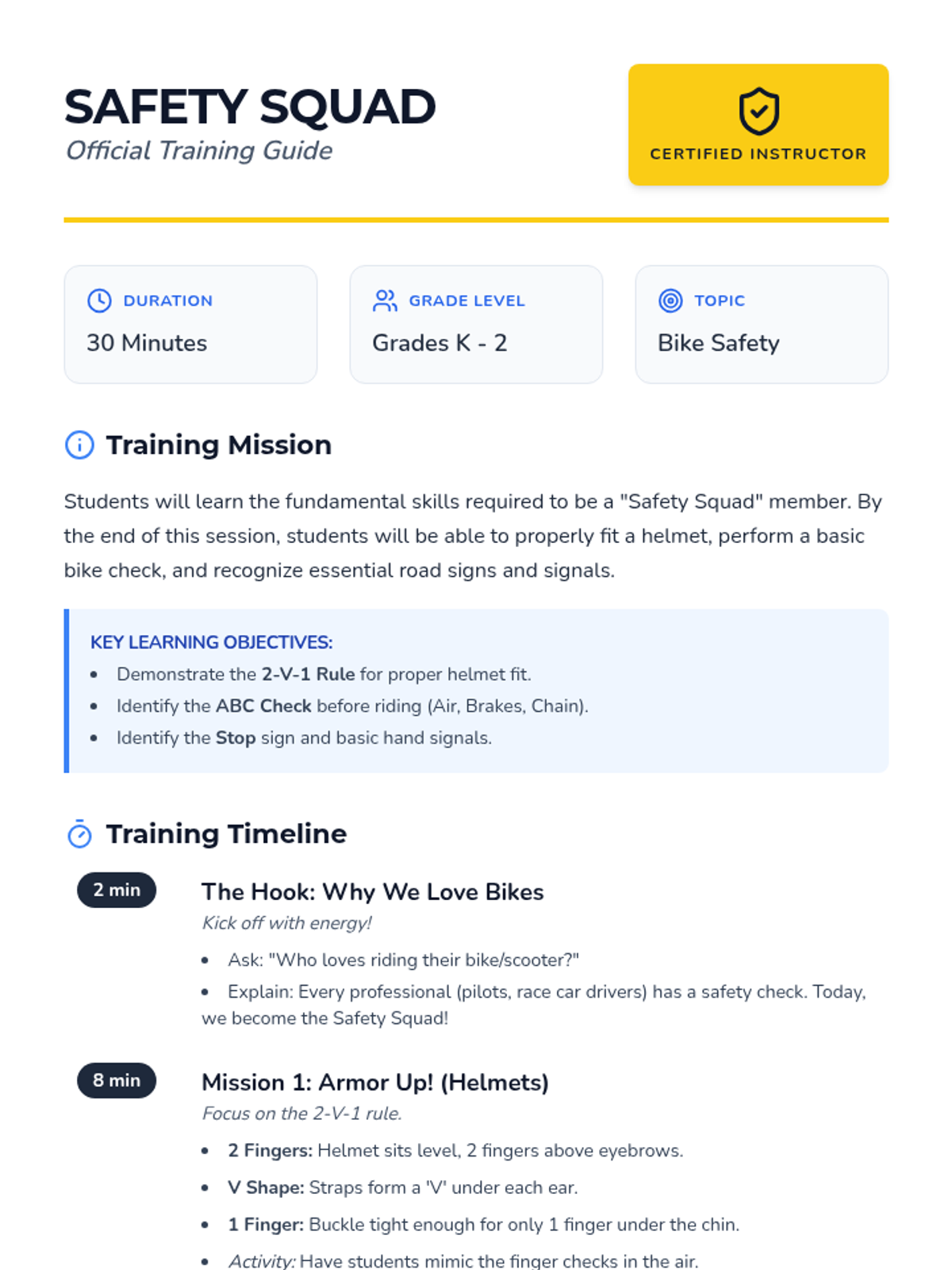 A 30-minute introductory lesson on bike safety for K-2 students, covering helmet fit, the ABC bike check, and basic road rules.