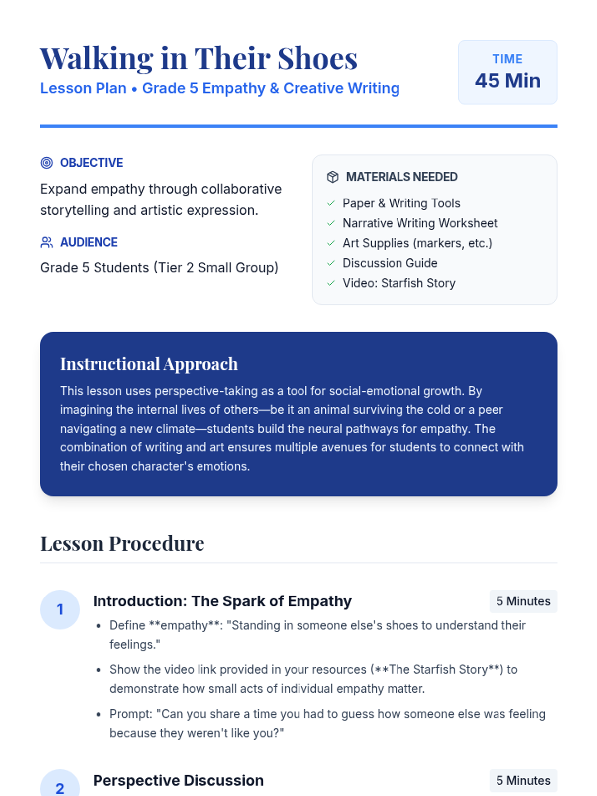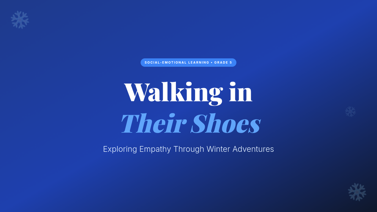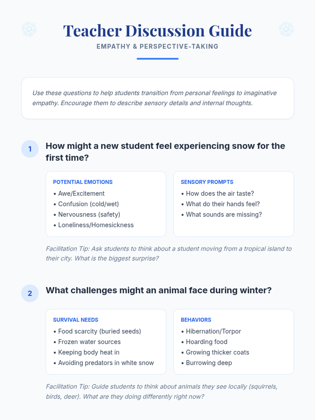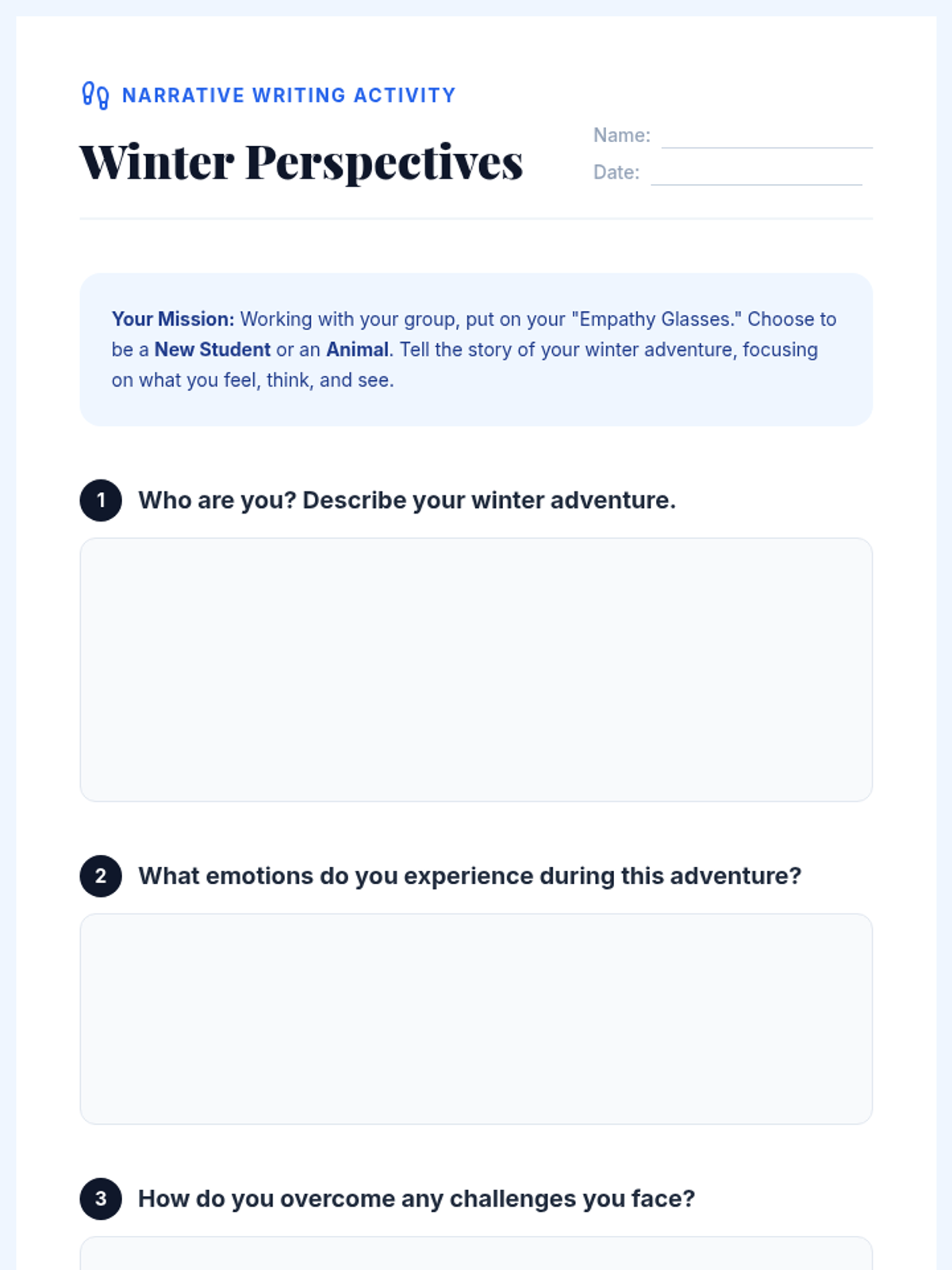 Students explore empathy by writing narratives and creating art from the perspective of animals or peers experiencing winter for the first time.