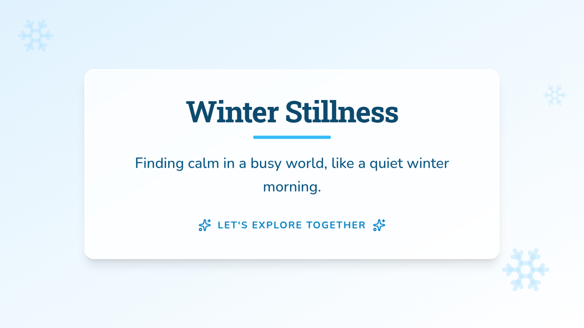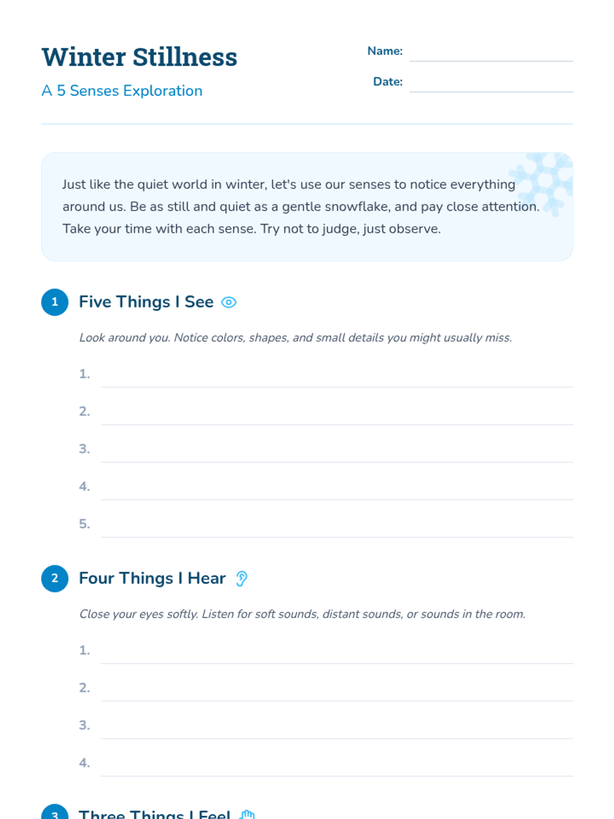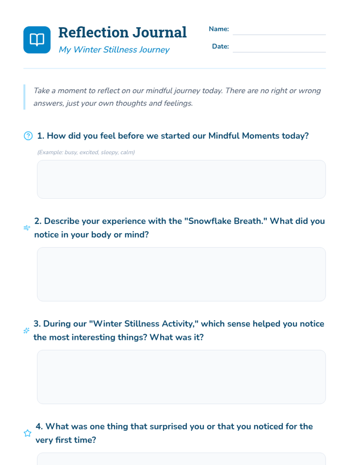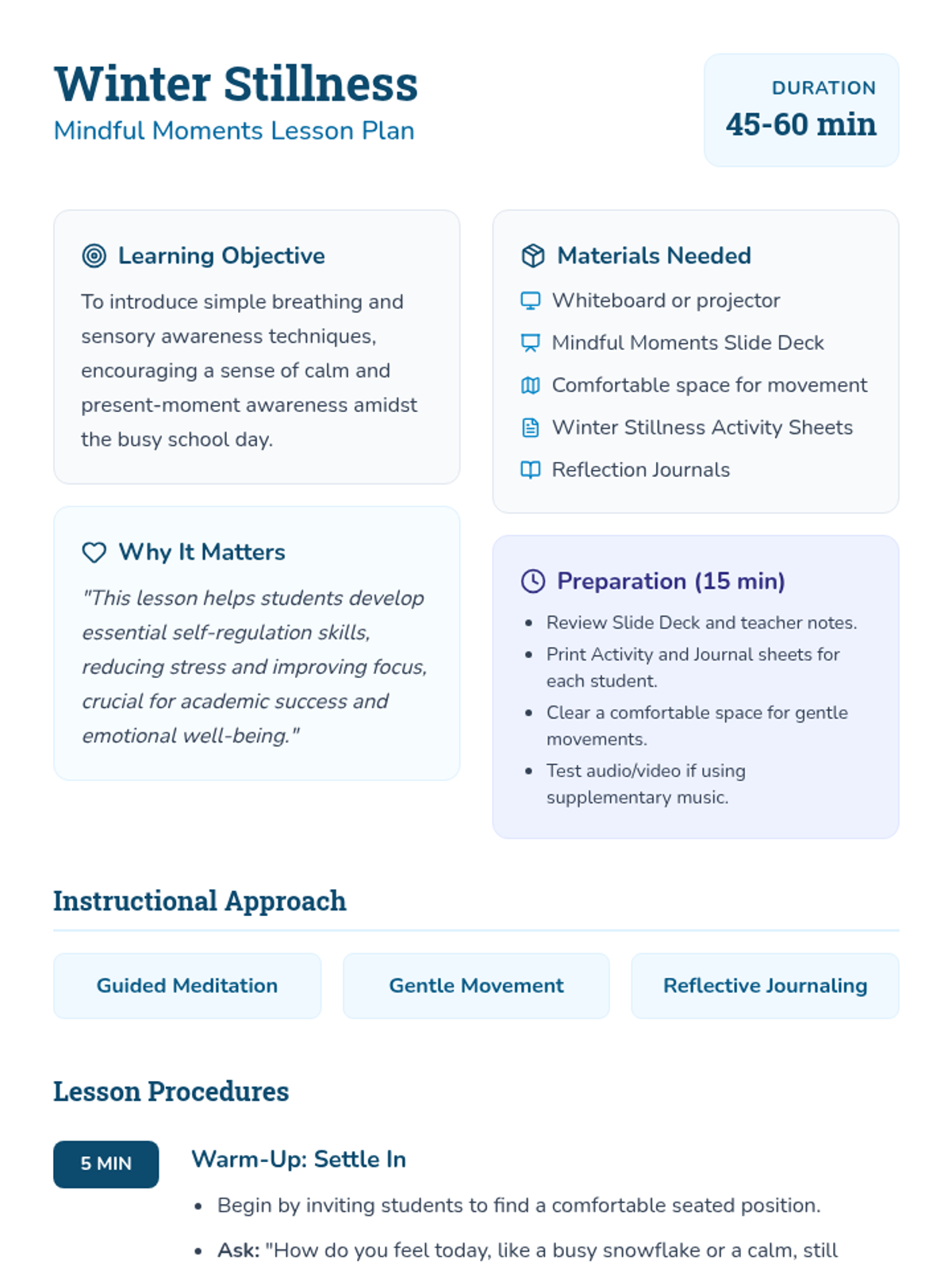 A mindfulness lesson for elementary students using winter-themed metaphors to teach breathing and sensory awareness. Students explore the concept of 'winter stillness' through guided meditation, gentle movement, and reflective journaling.