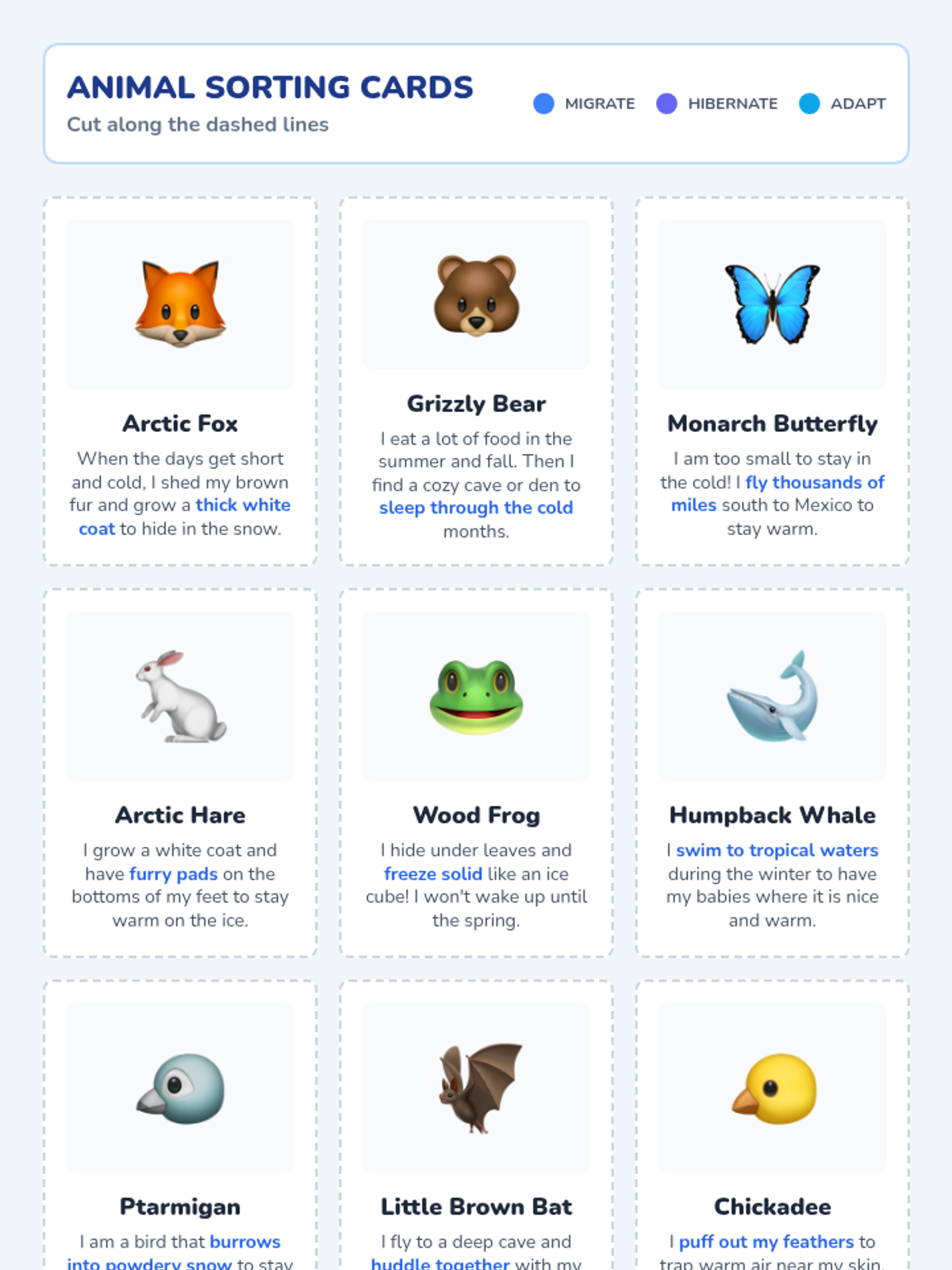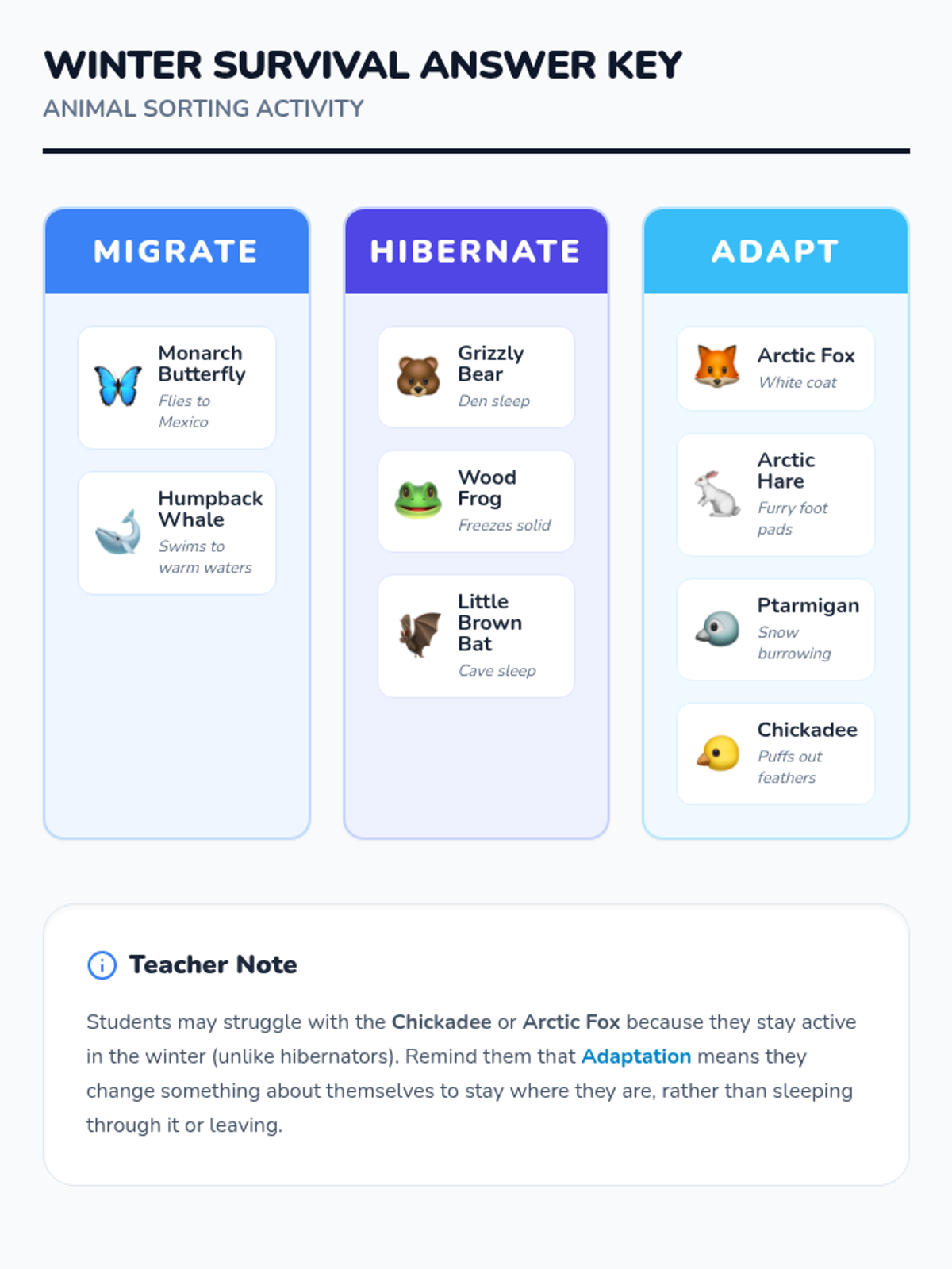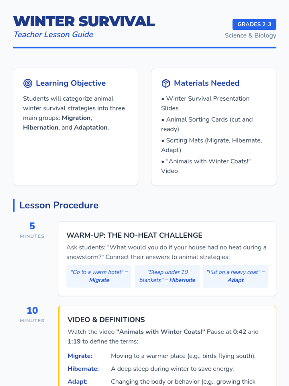 Students will learn to categorize animal winter survival strategies into Migration, Hibernation, and Adaptation through a warm-up discussion, a video exploration of Arctic animals, and a collaborative sorting activity.