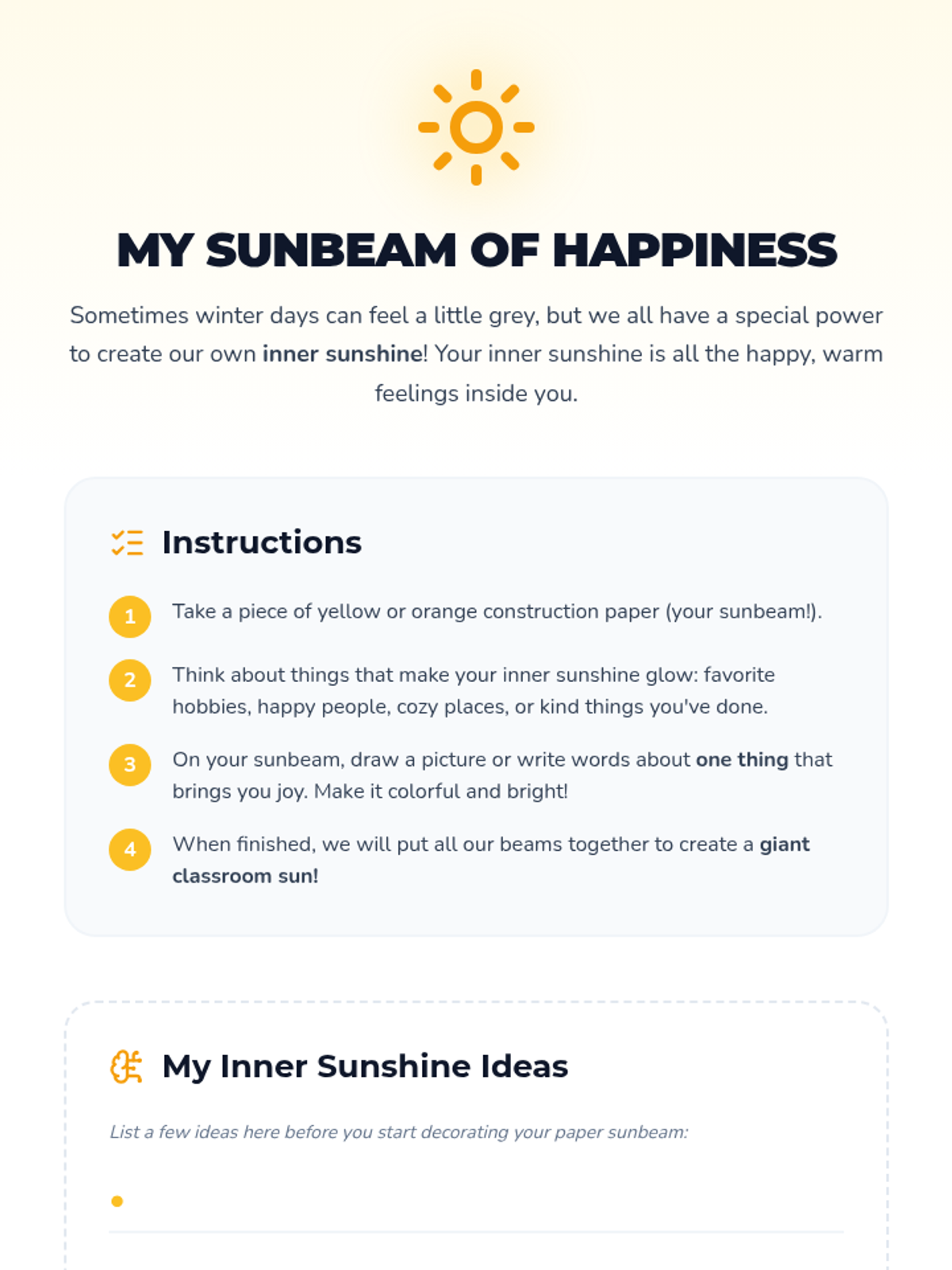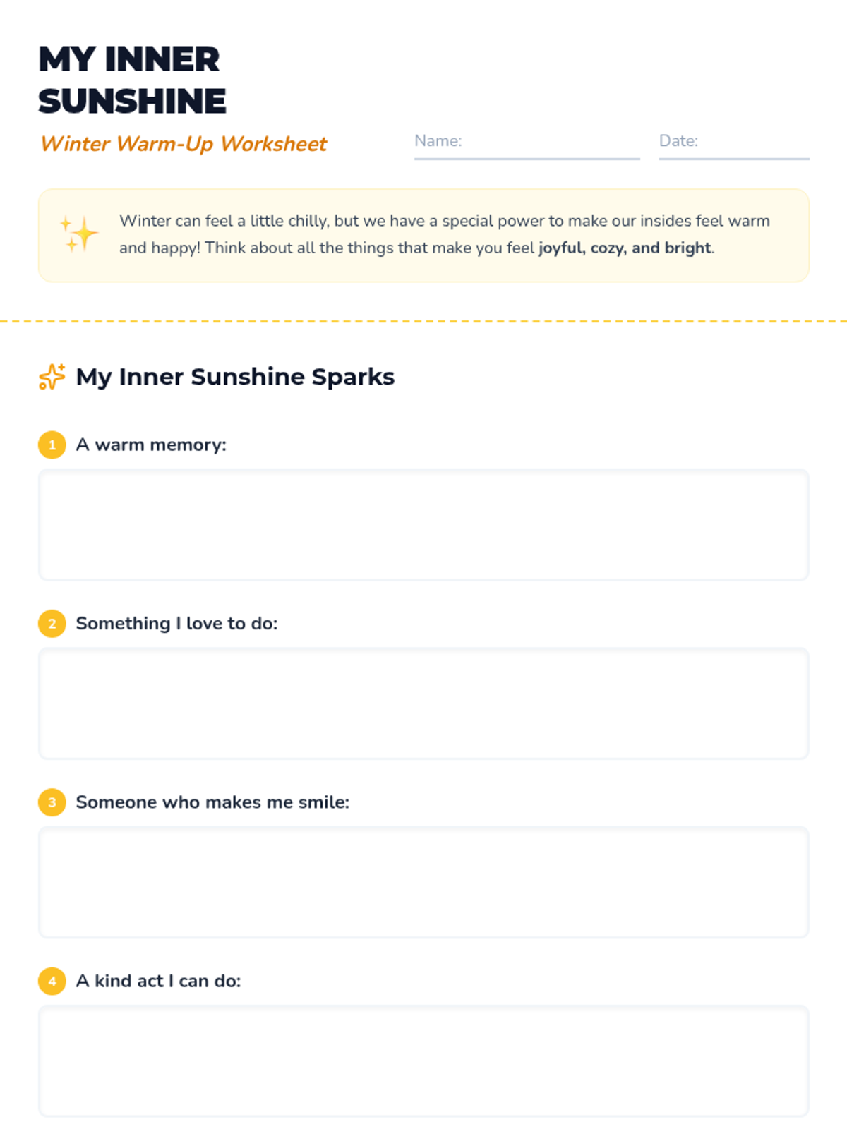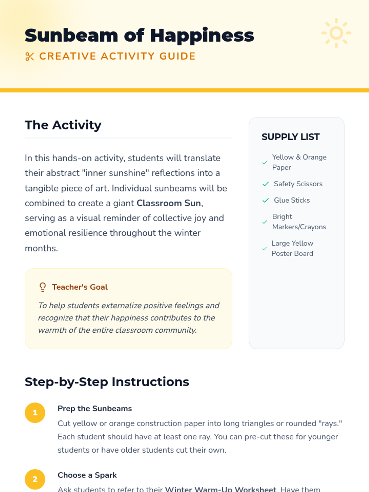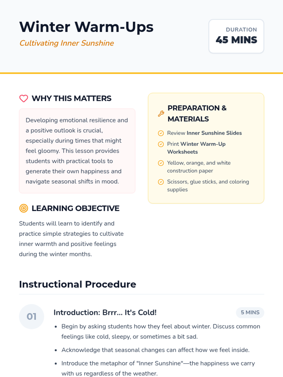 A heartwarming social-emotional learning lesson for elementary students focused on building emotional resilience and finding happiness during the cold winter months through the concept of 'inner sunshine'.