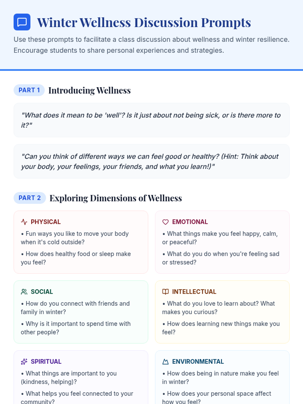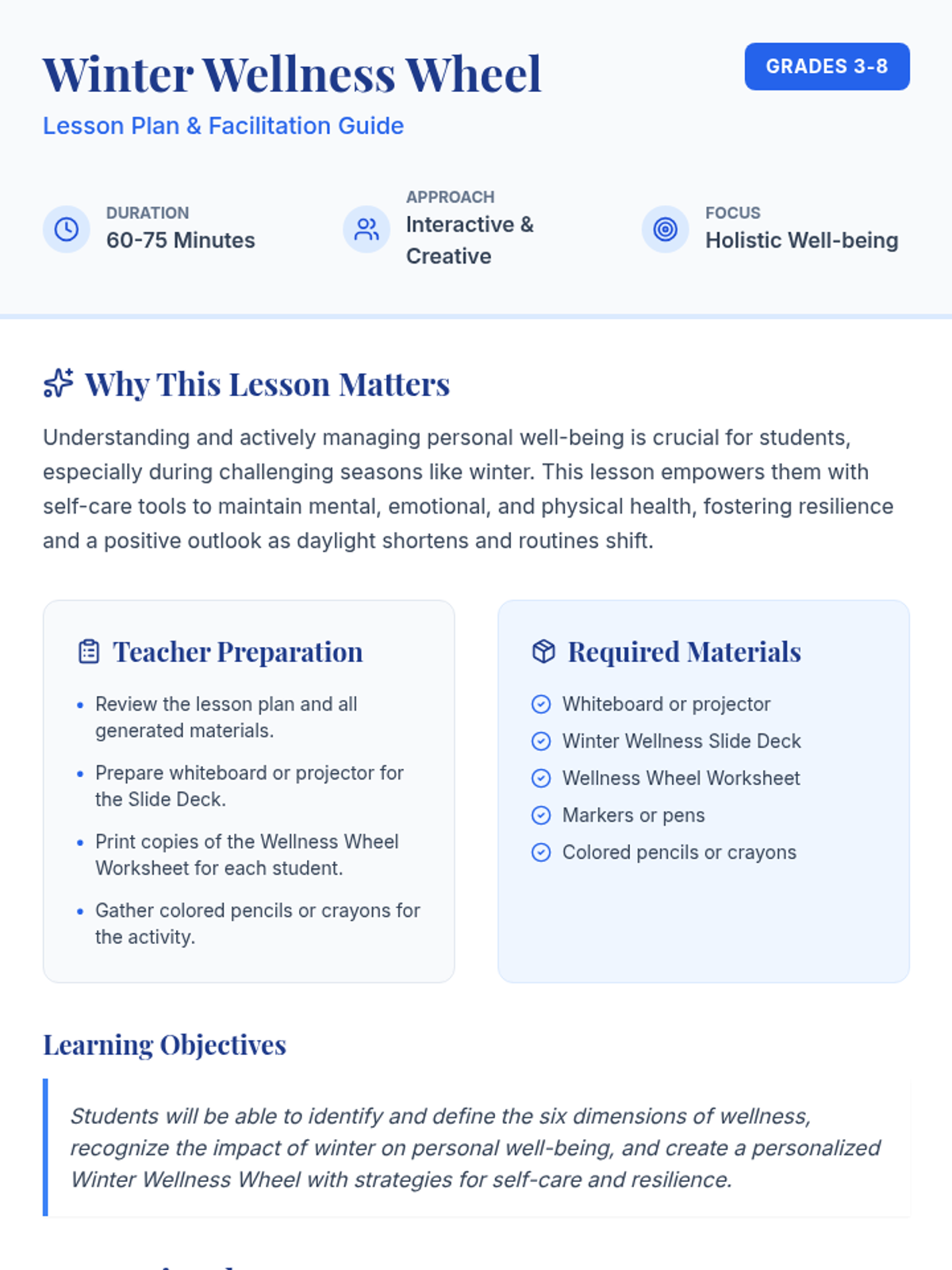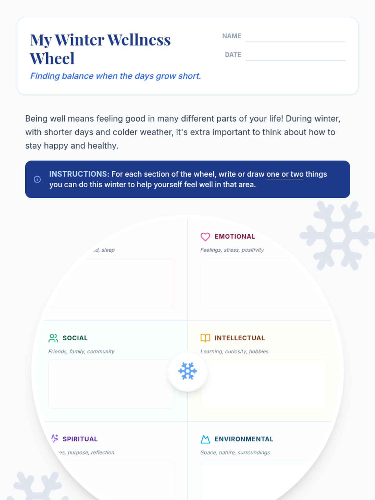 This lesson helps students in Grades 3-8 recognize and balance various dimensions of their well-being specifically during the winter months through the creation of a personalized 'wellness wheel.'