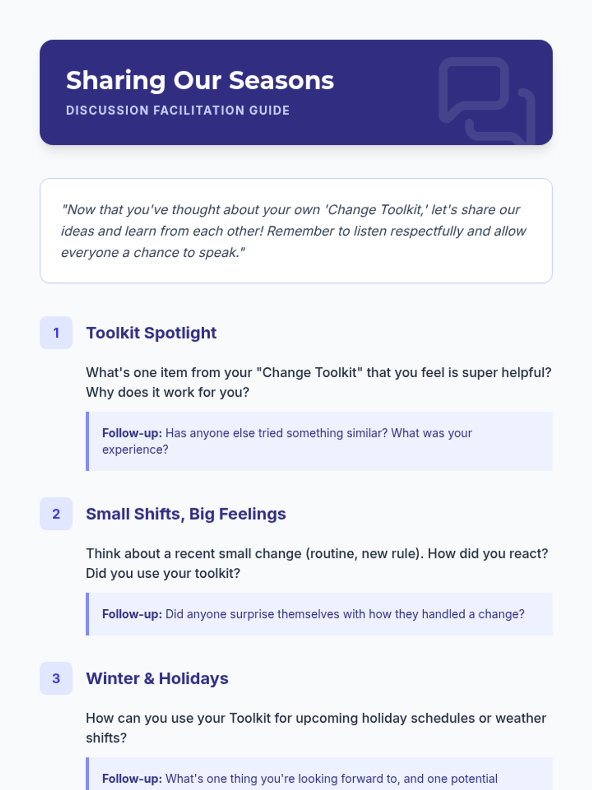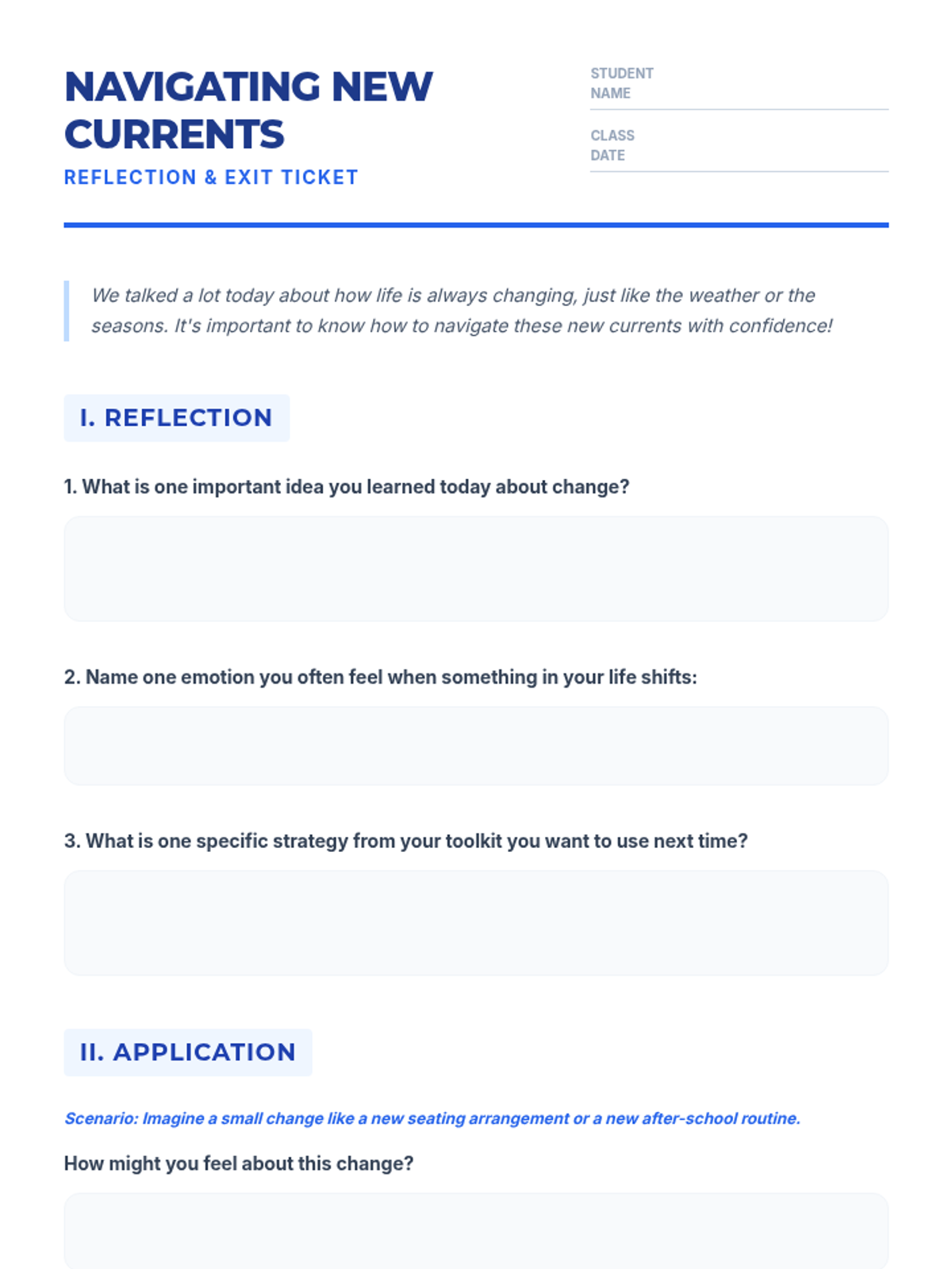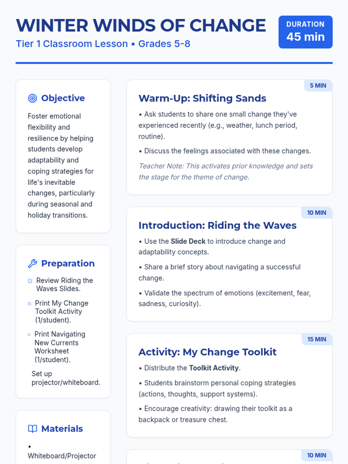This lesson equips students in grades 5-8 with emotional flexibility and coping strategies for life's changes, particularly during seasonal shifts and holiday transitions. Through storytelling, reflective activities, and group discussions, students build a personal 'Change Toolkit' to navigate transitions with confidence.