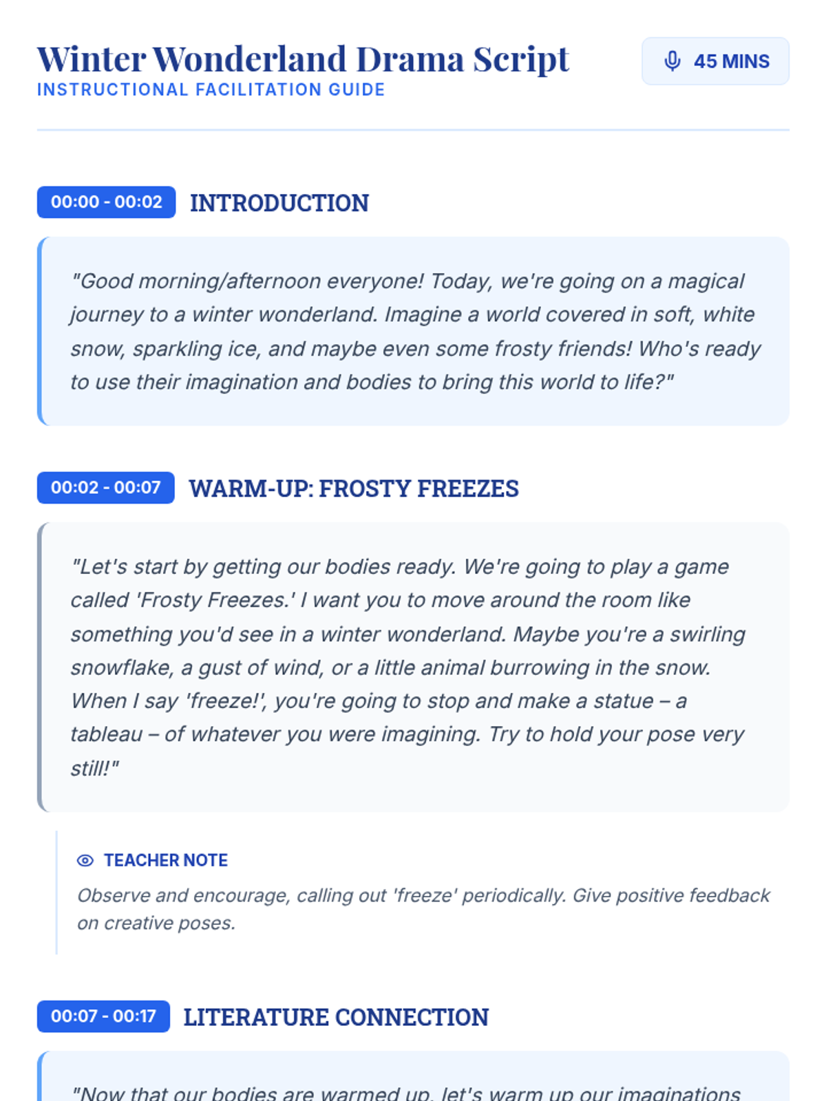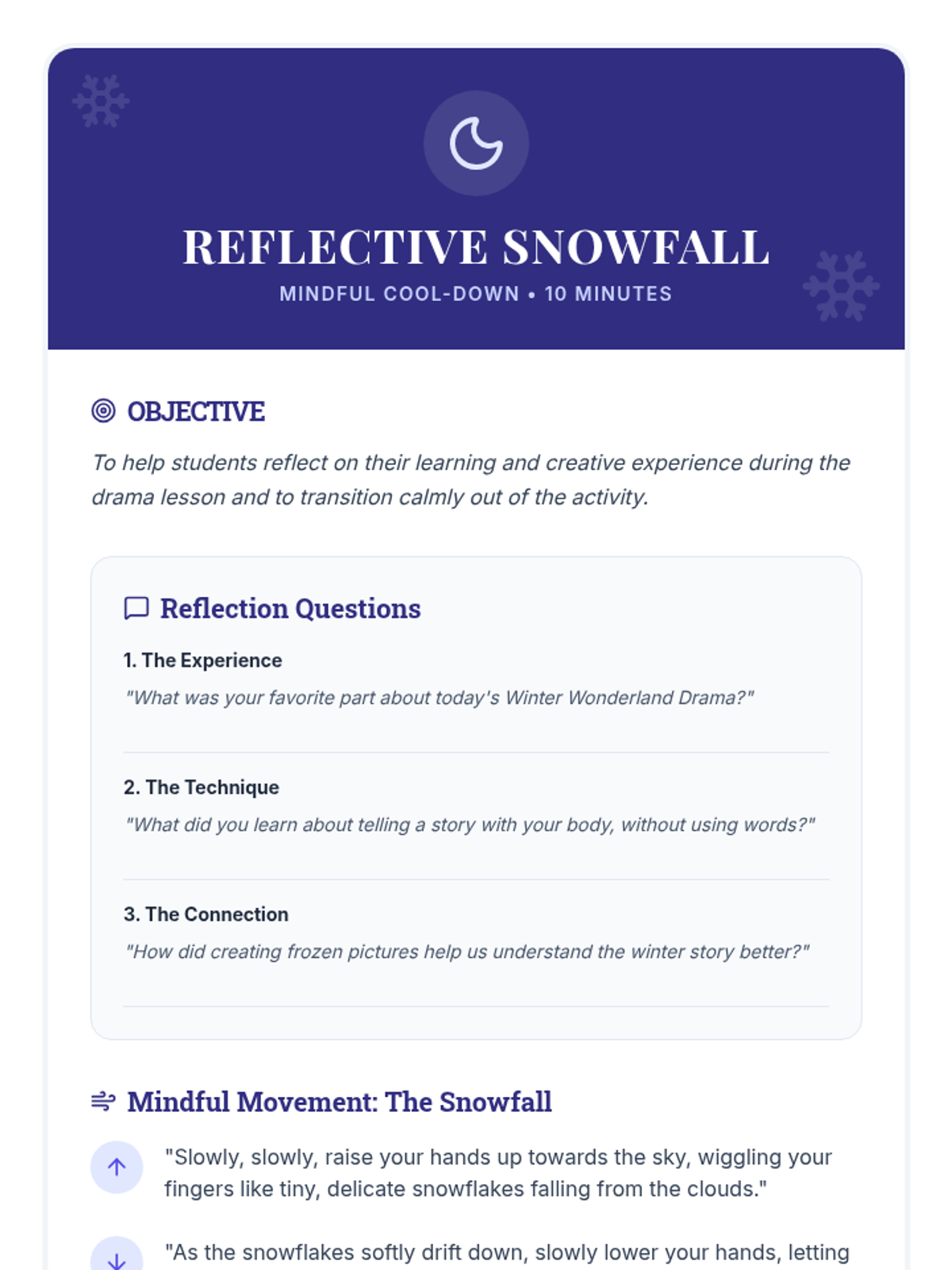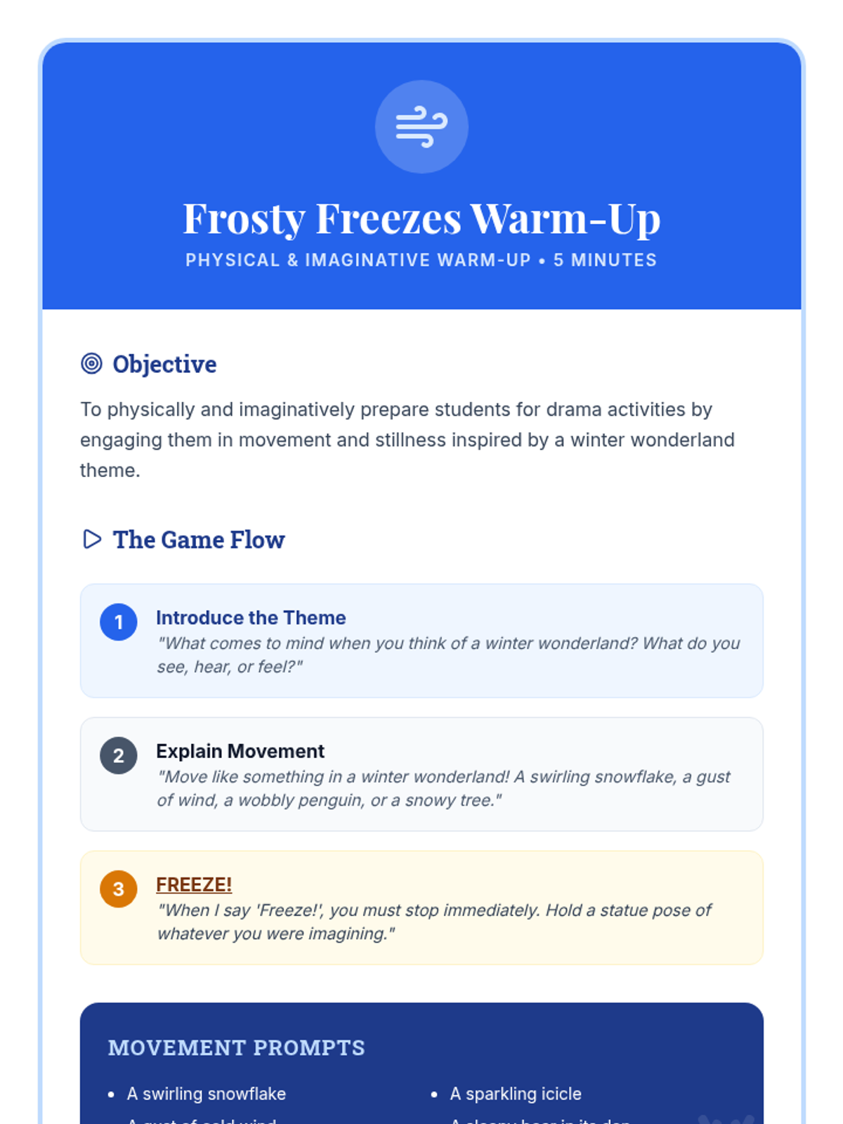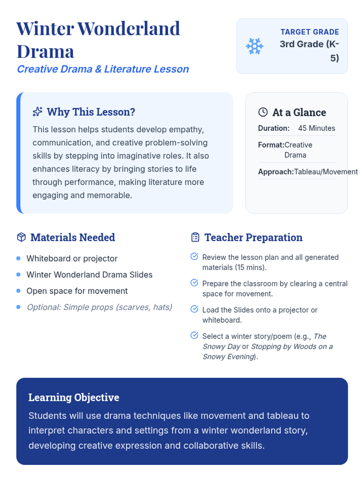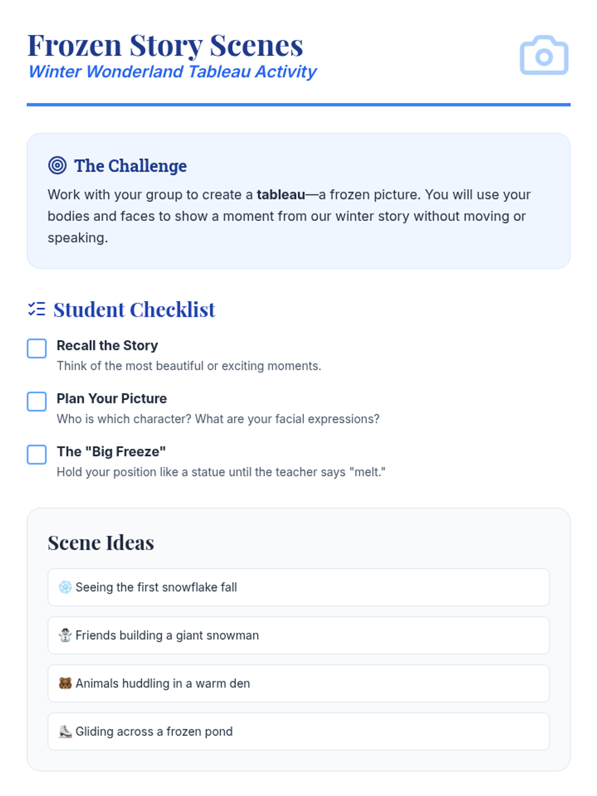 This 45-minute drama lesson engages 3rd-grade students in a creative exploration of winter themes and literature. Through movement, visualization, and group tableau, students develop performance skills and deepen their understanding of story elements in a collaborative setting.