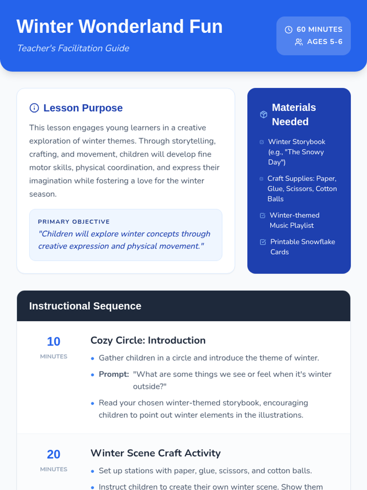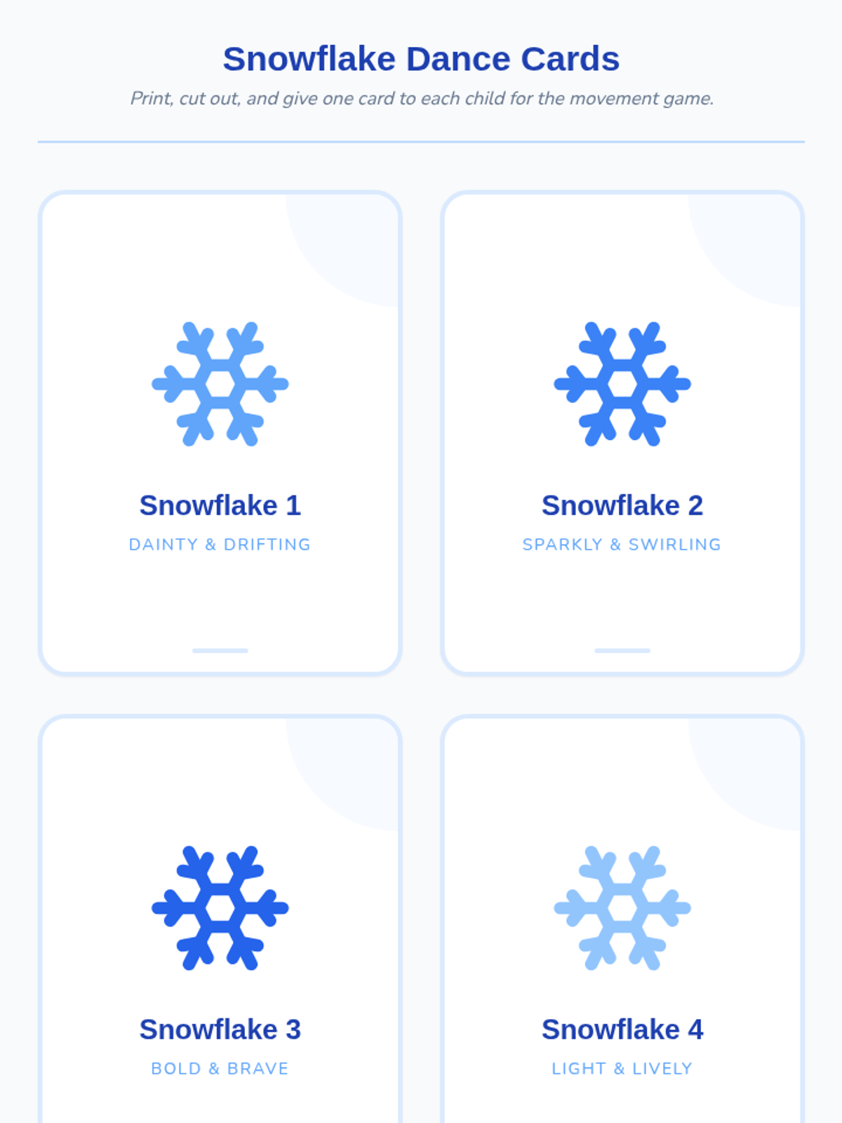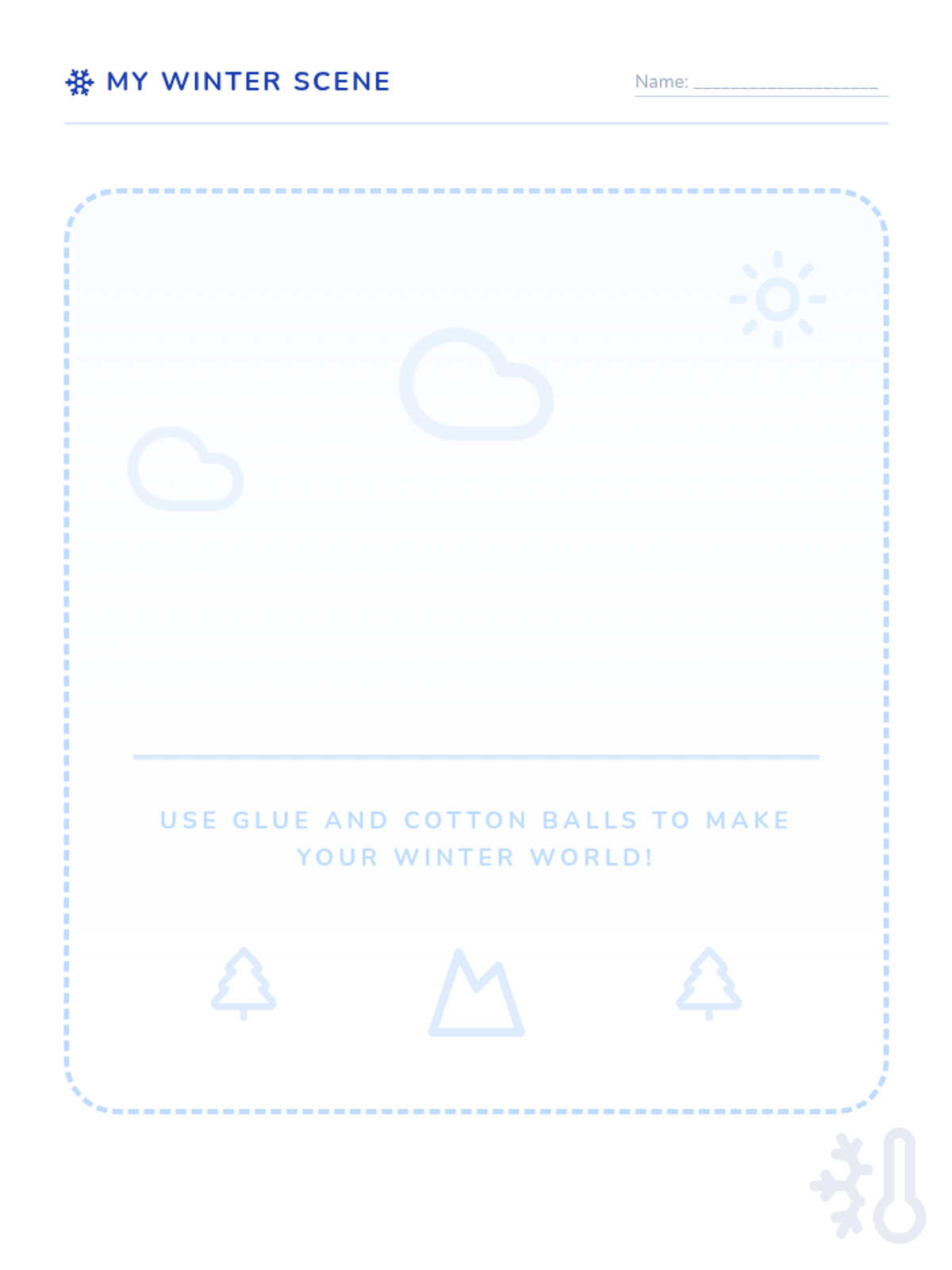 A creative exploration of winter for 5-6 year olds, featuring storytelling, a cotton ball winter scene craft, and an active Snowflake Dance movement game.