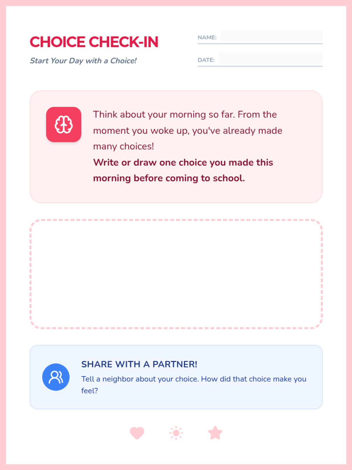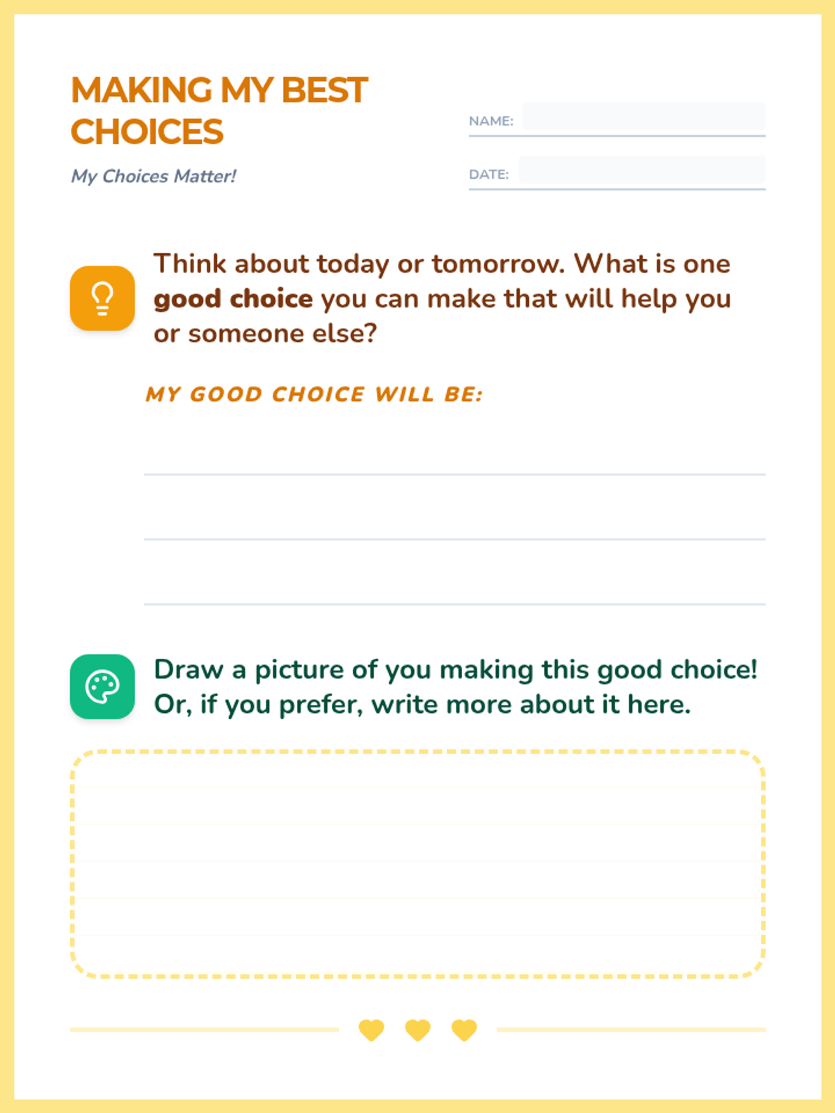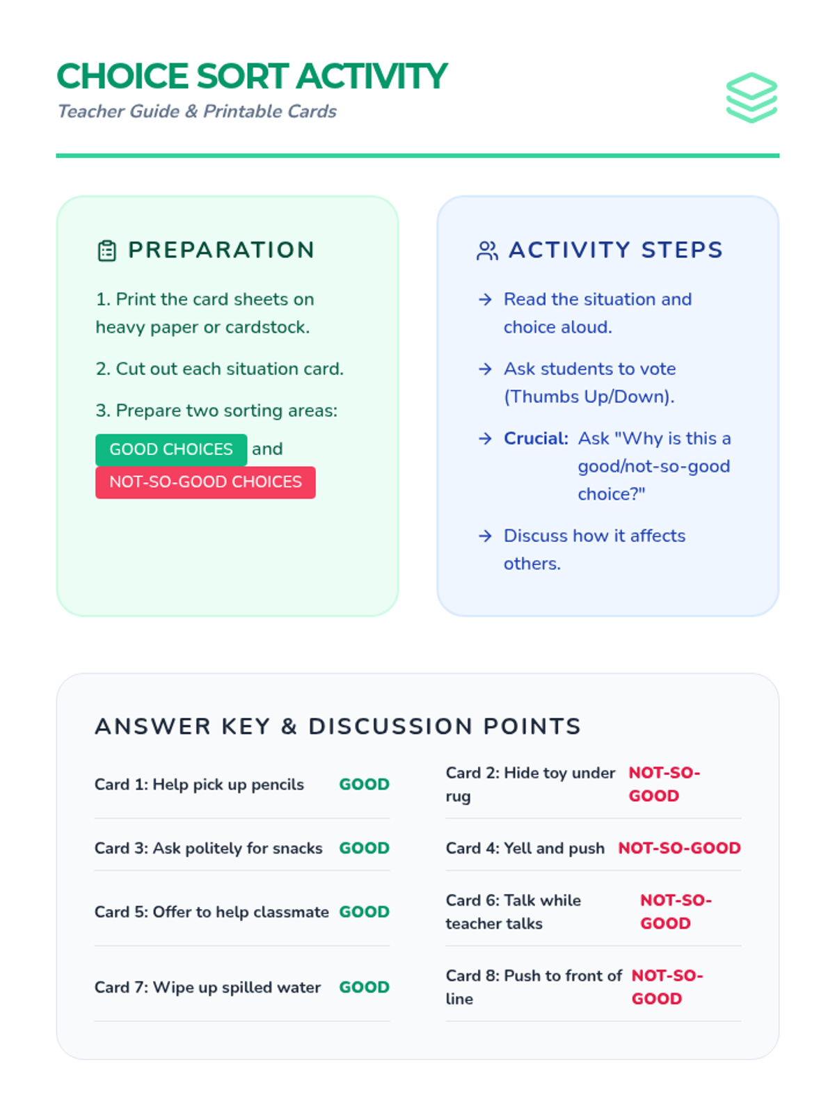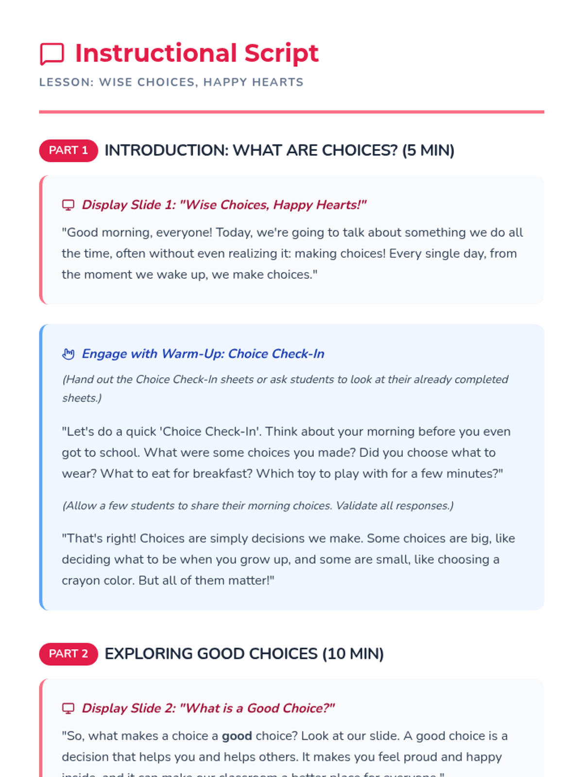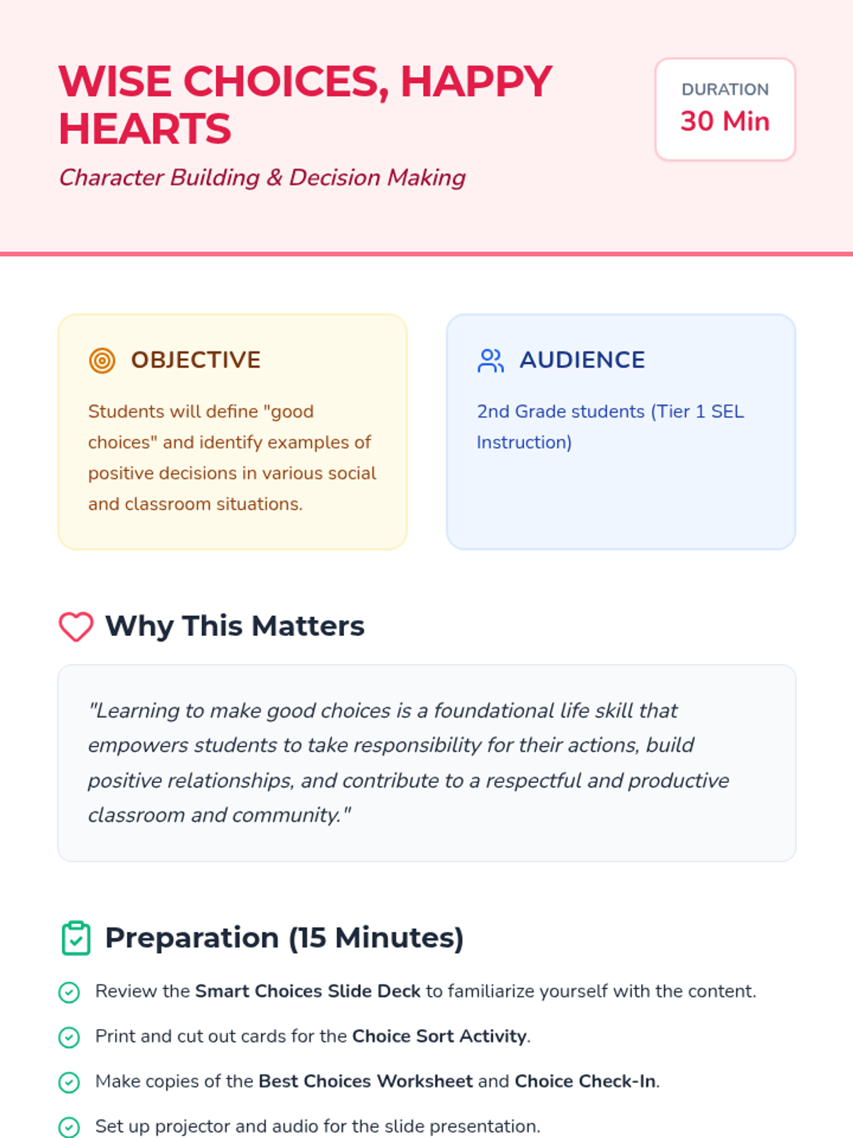 This 30-minute SEL lesson for 2nd graders explores the impact of daily choices. Students will learn to identify 'good choices' that help themselves and others, practice categorizing scenarios through a sorting activity, and reflect on a positive choice they can make today.