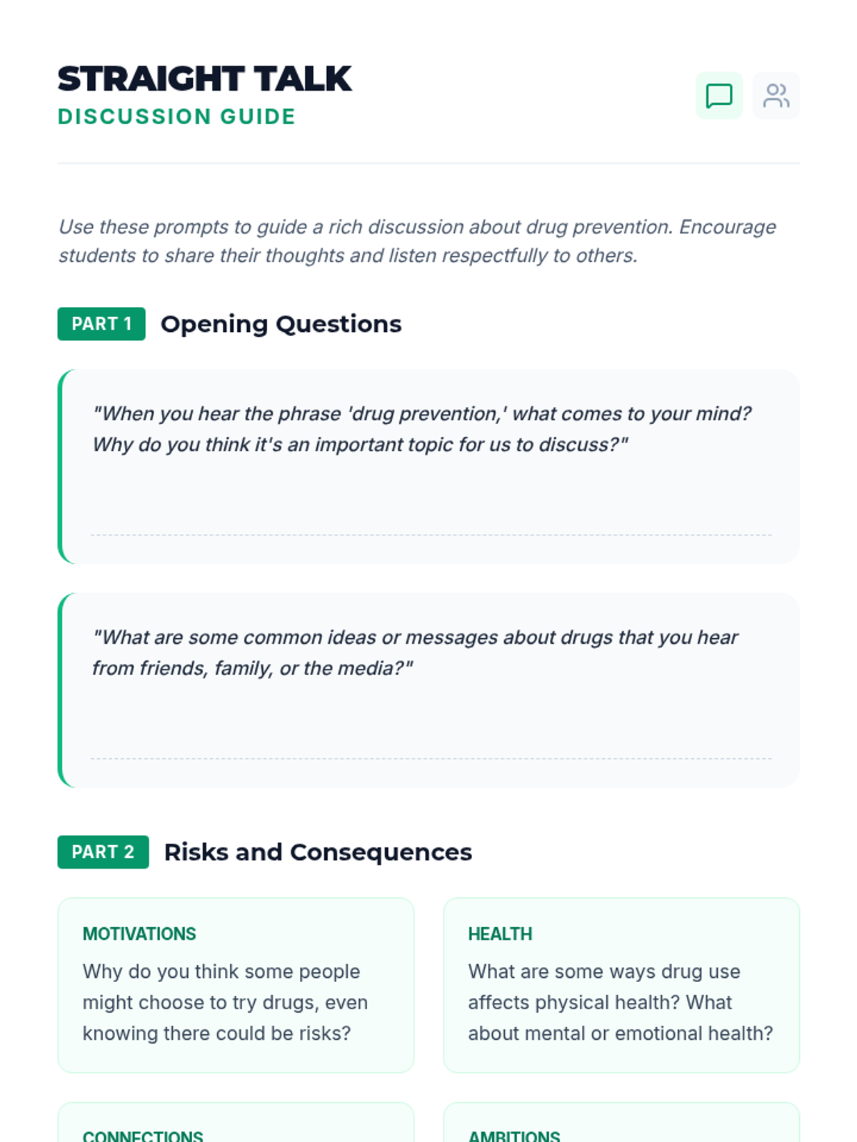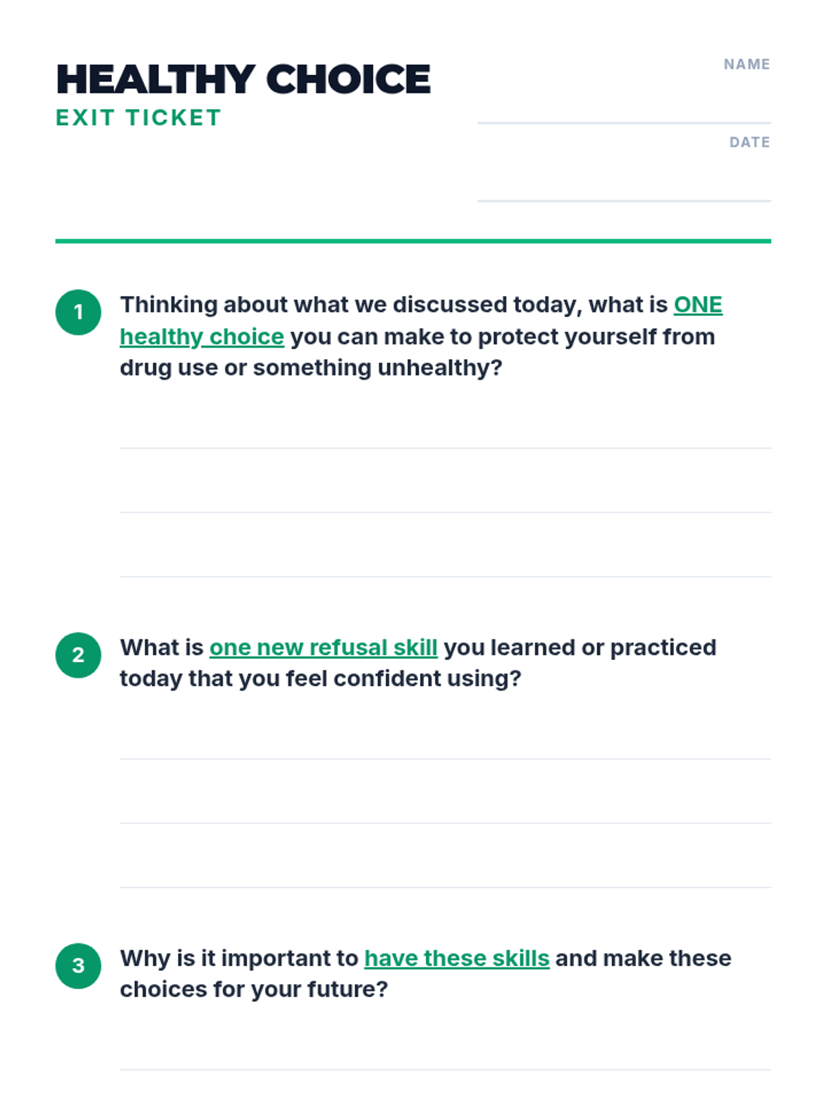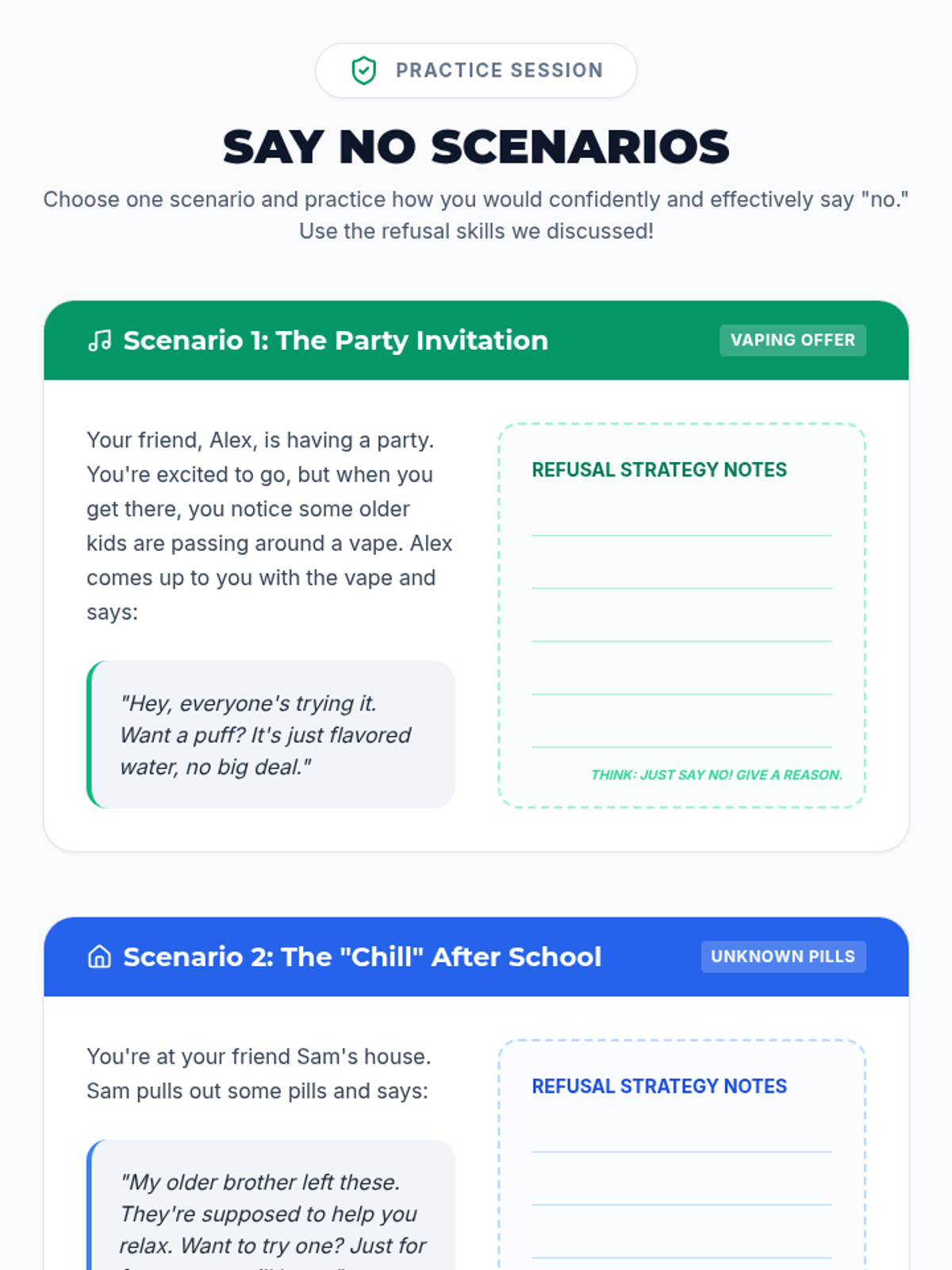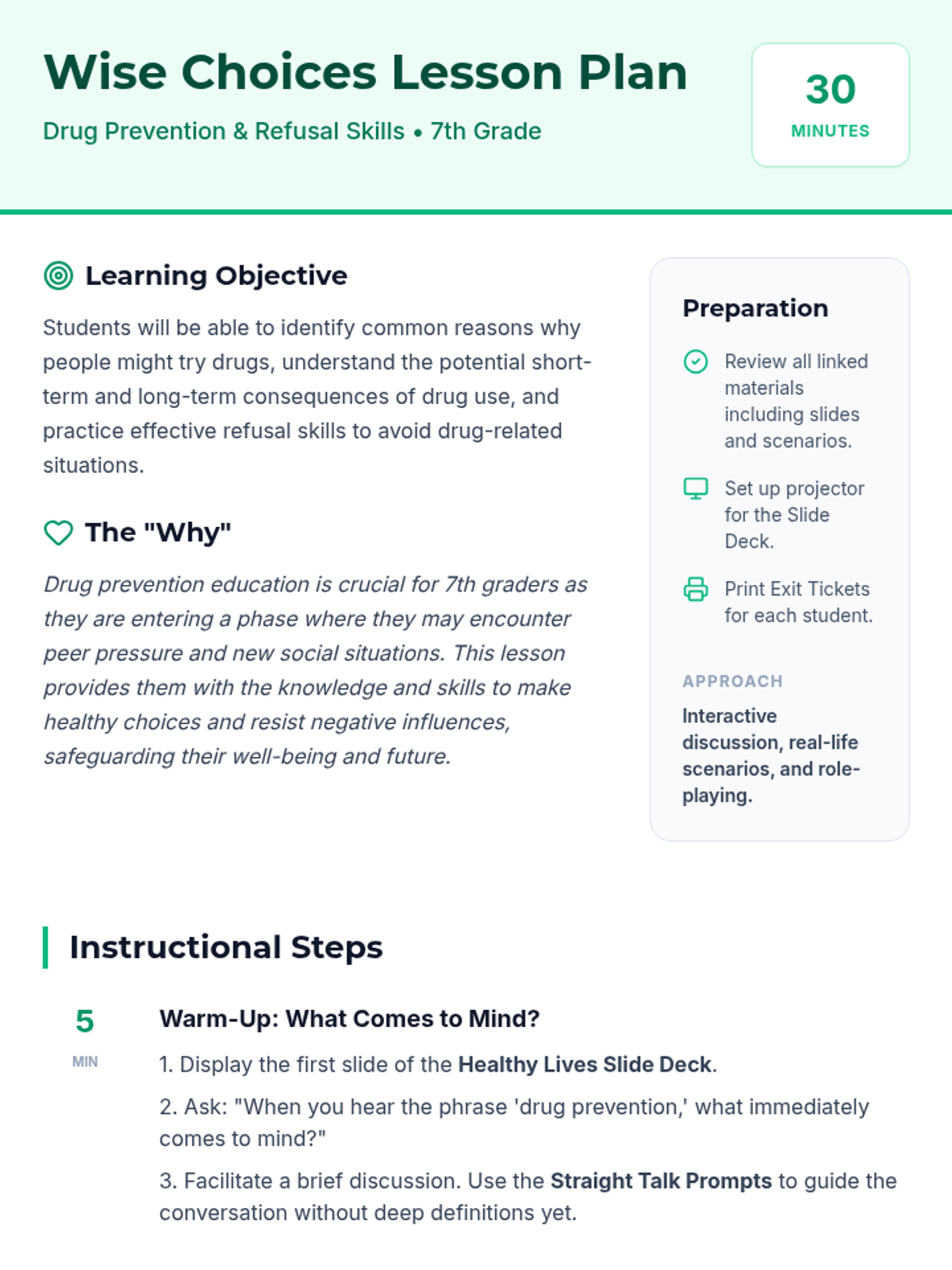 A 30-minute lesson for 7th graders focused on drug prevention, risk awareness, and building confident refusal skills.