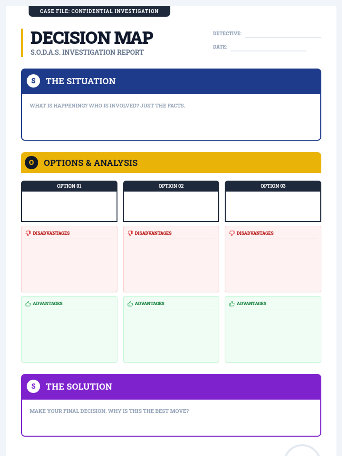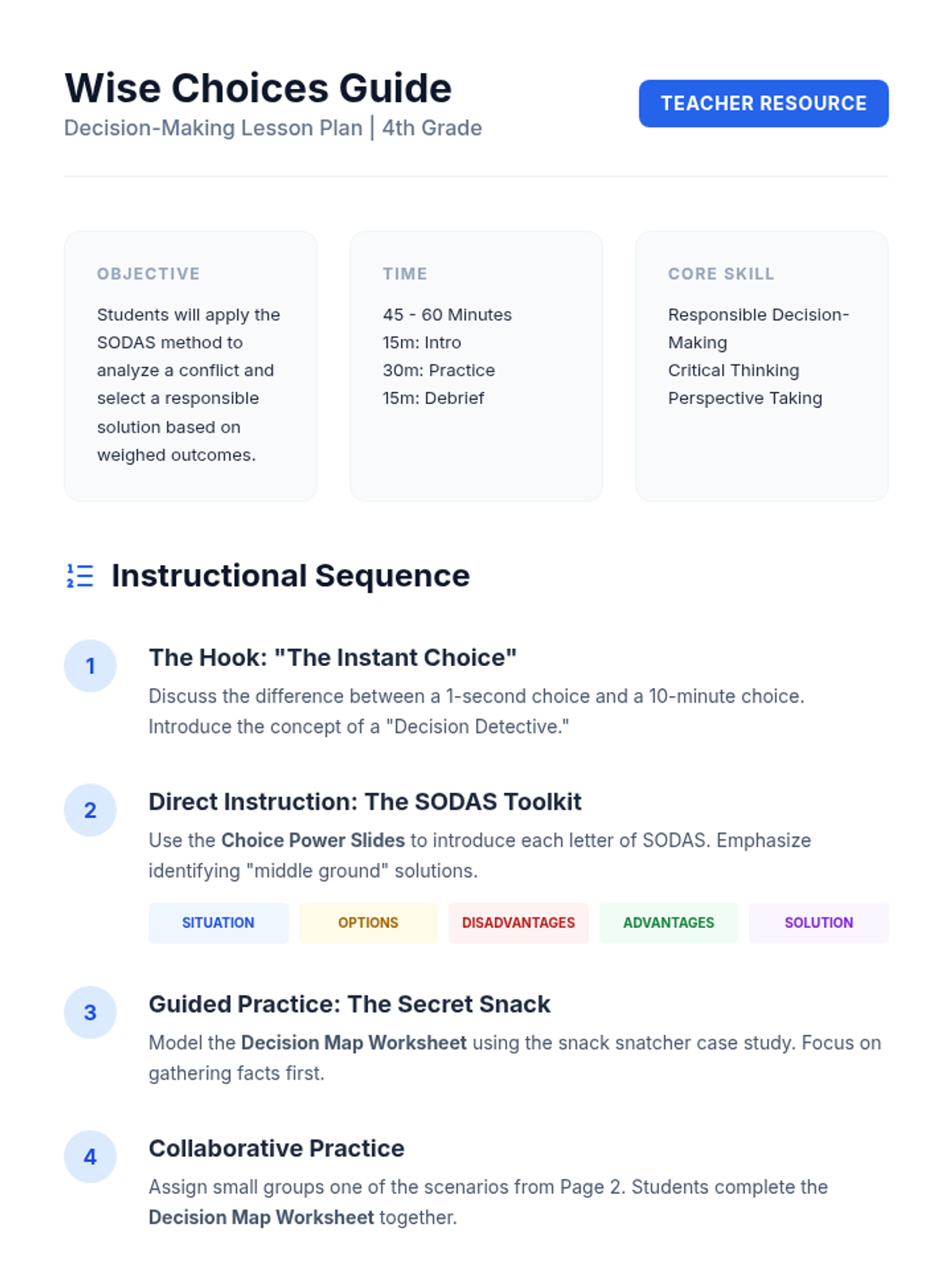 A lesson for 4th graders on making responsible decisions using the SODAS method (Situation, Options, Disadvantages, Advantages, Solution) to navigate social and personal challenges.