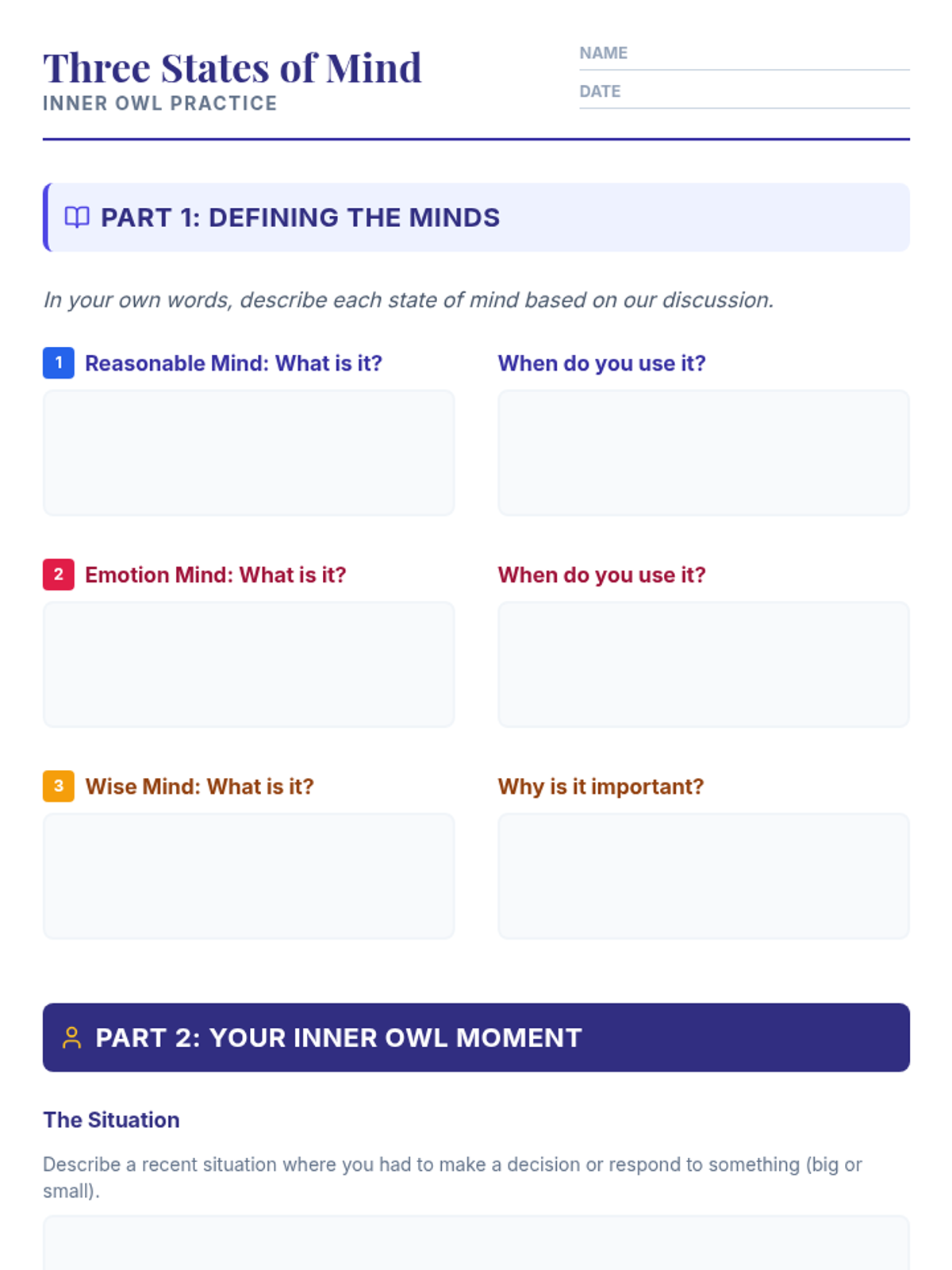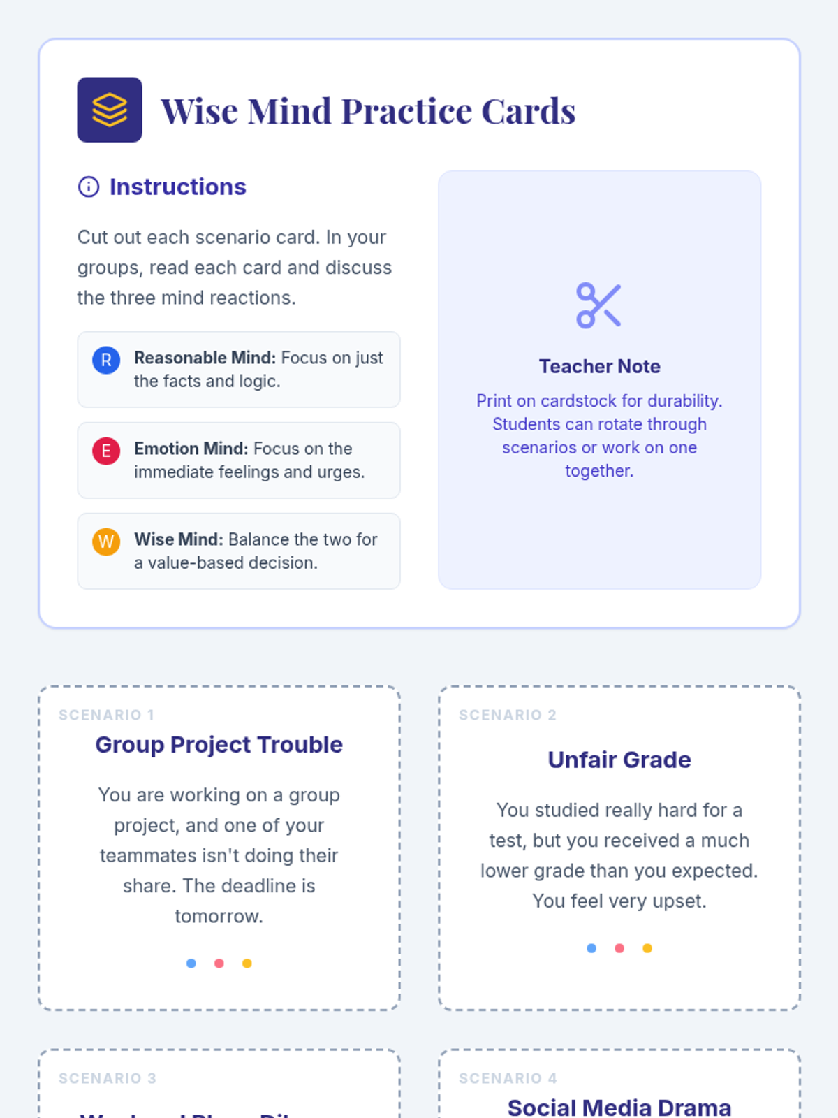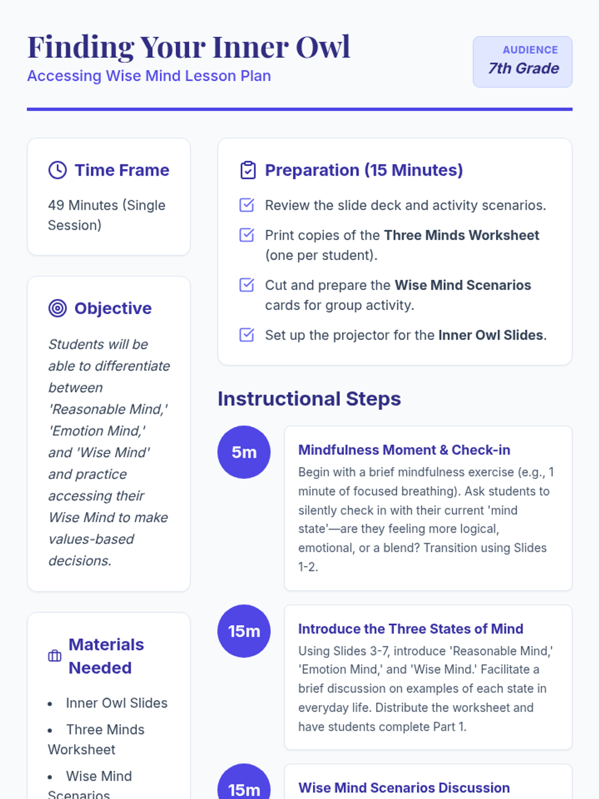 Students will learn to differentiate between 'Reasonable Mind,' 'Emotion Mind,' and 'Wise Mind,' and practice accessing their Wise Mind to make values-based decisions. This lesson is crucial for developing emotional intelligence and decision-making skills in 7th-grade students.