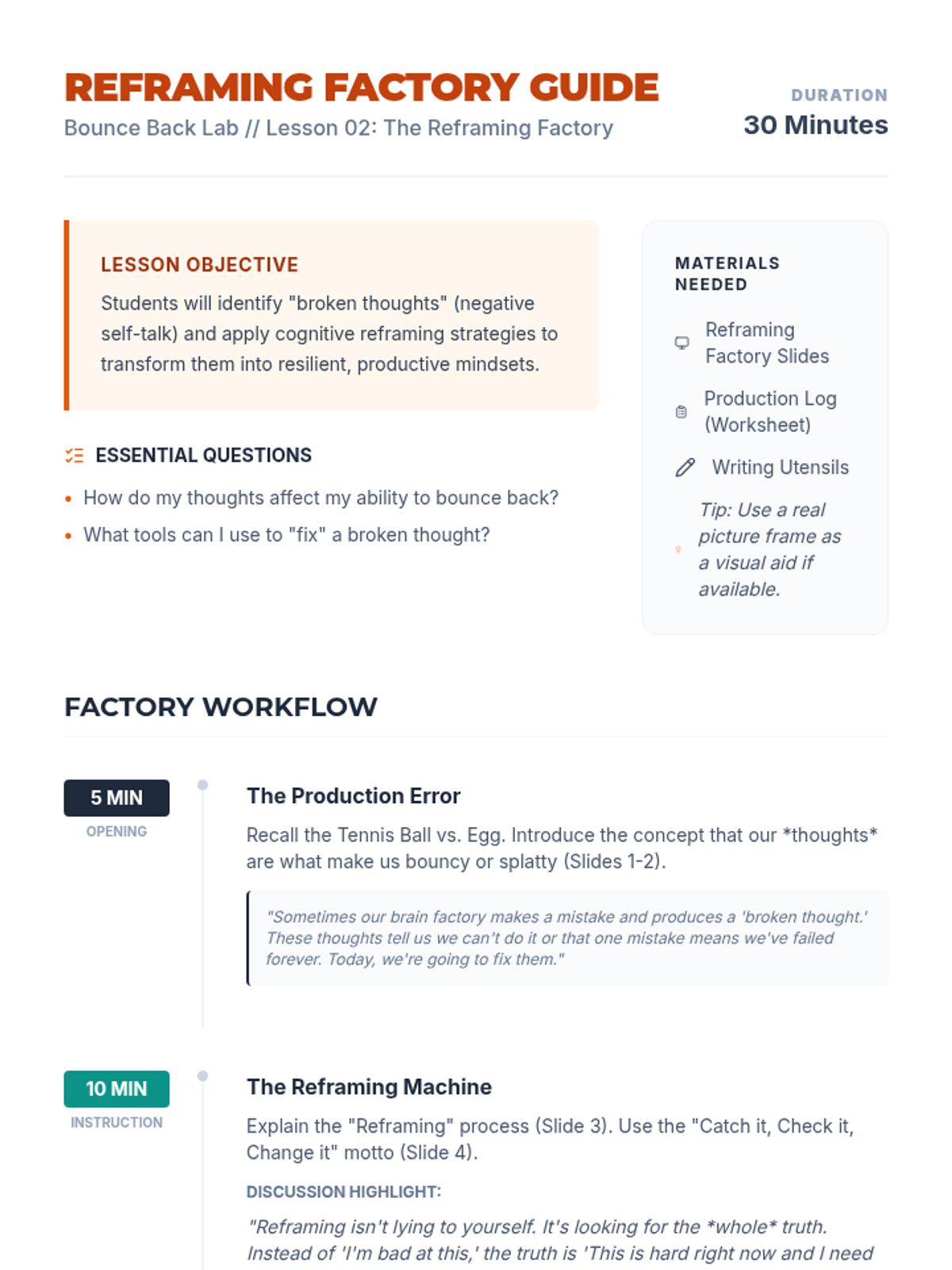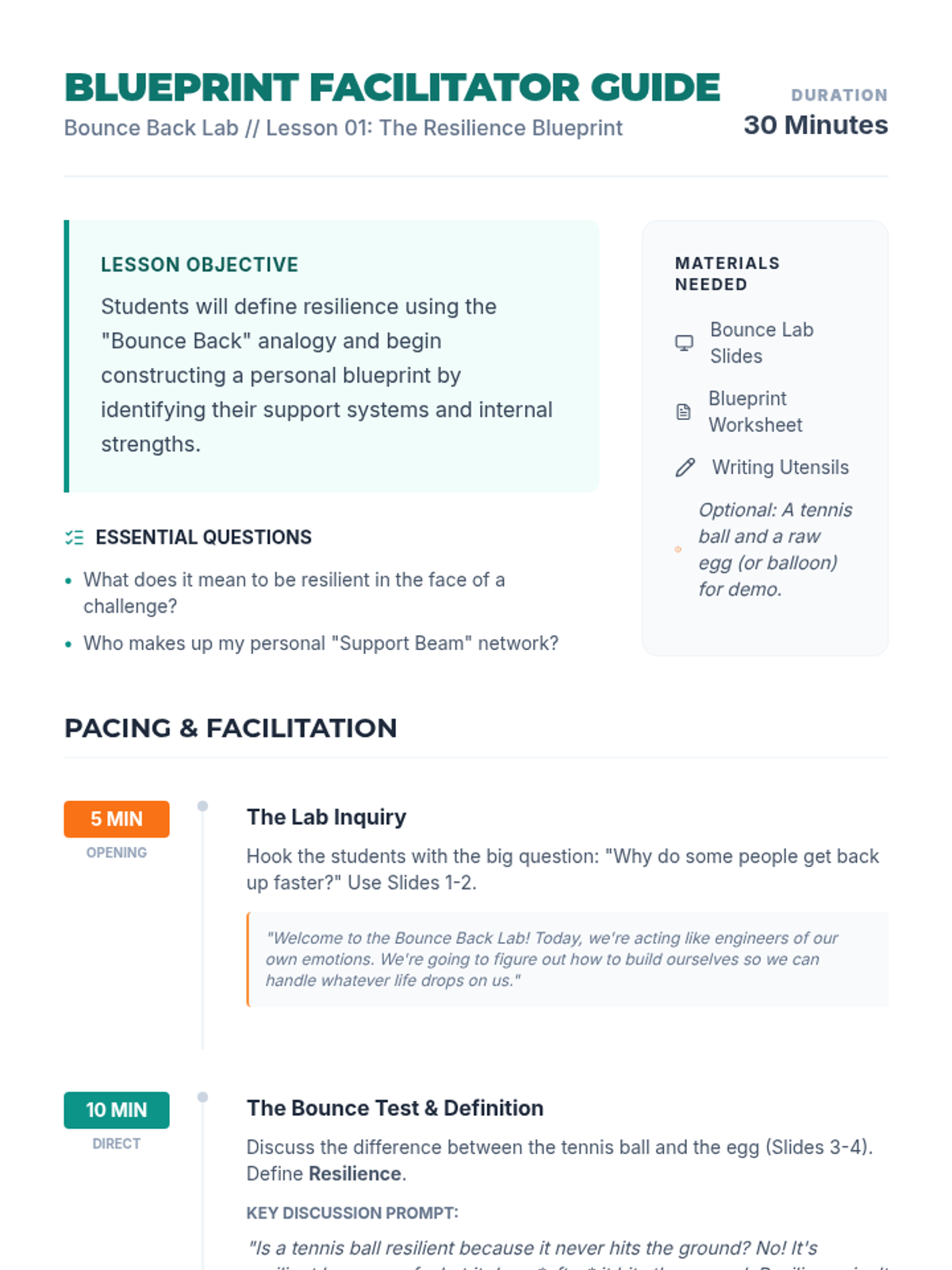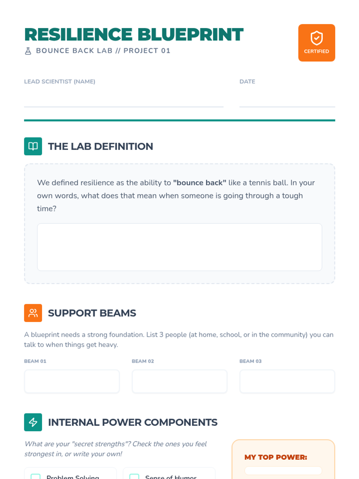 Students define resilience through the "Bounce Back" analogy and map out their personal strengths and support systems.