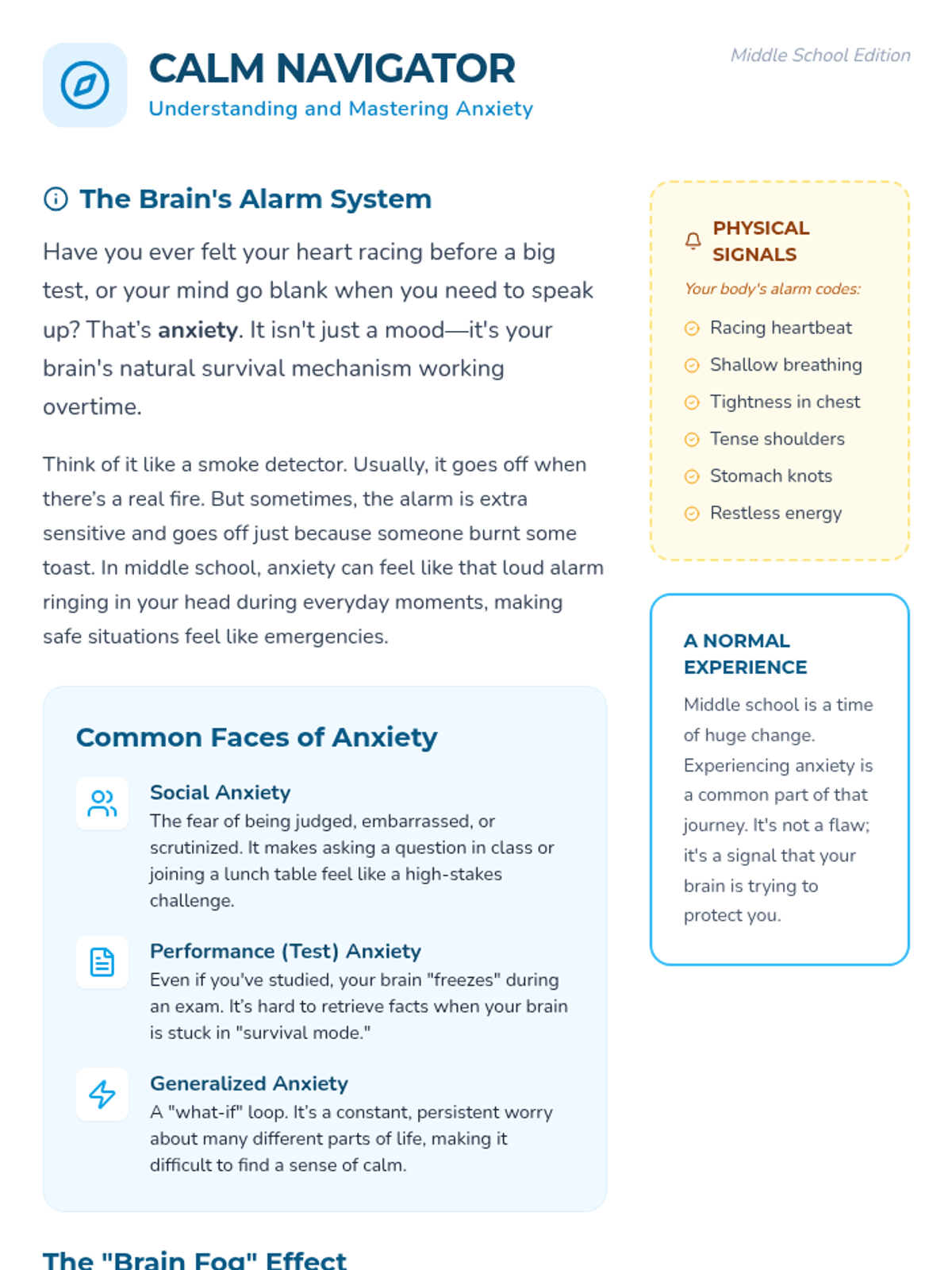 A lesson designed to help students understand the mechanics of anxiety, identify their own triggers, and build a practical toolkit for managing stress in a school environment.