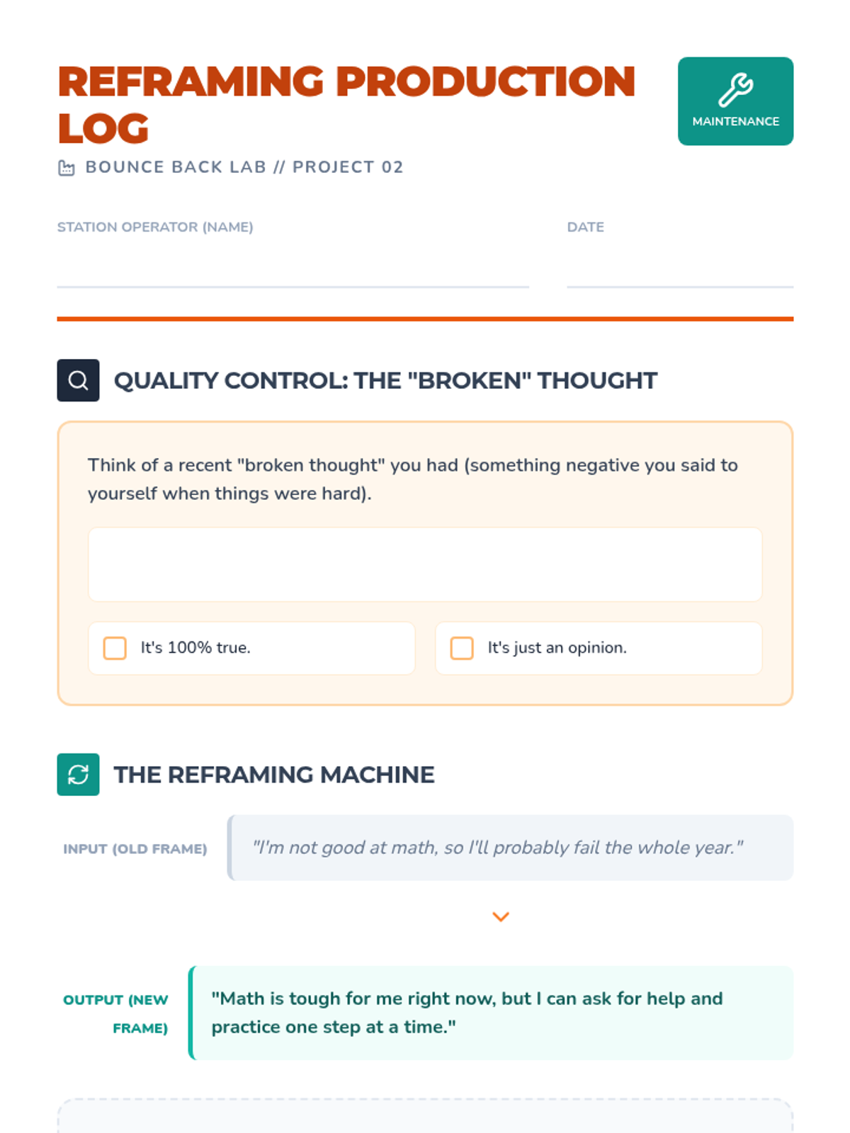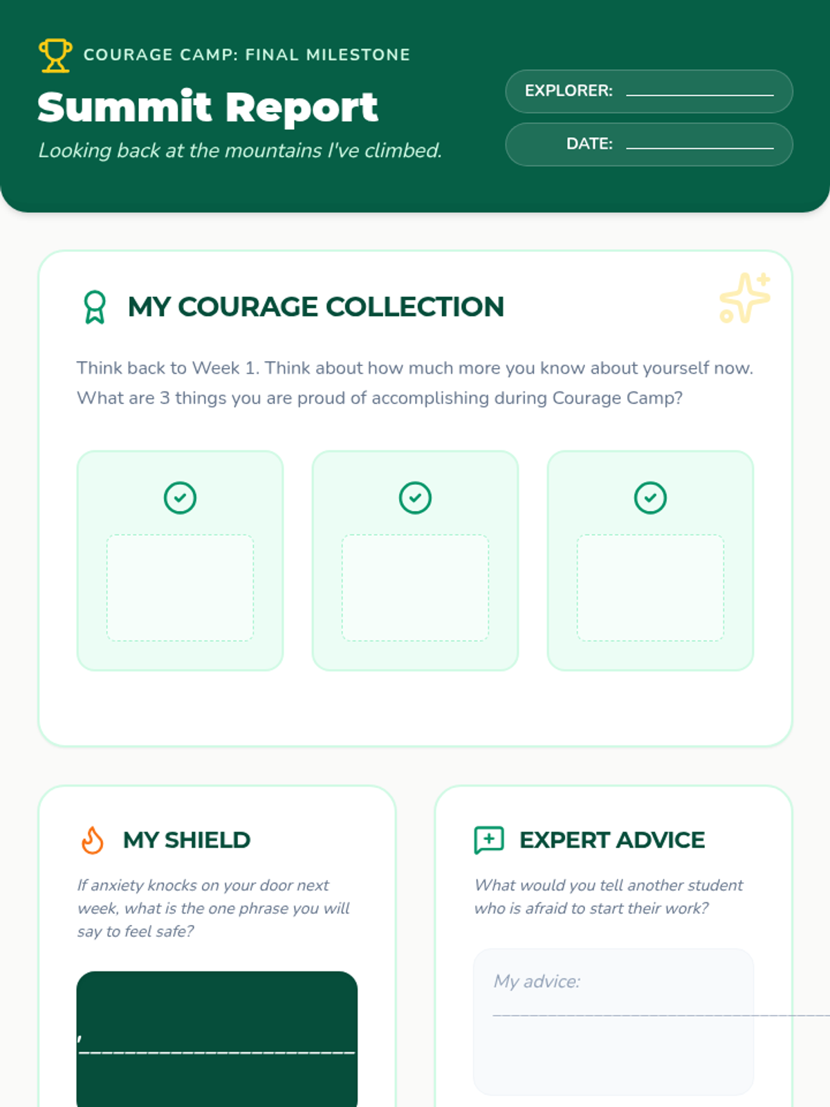 Students practice reframing negative self-talk and building a personalized toolkit of coping strategies.