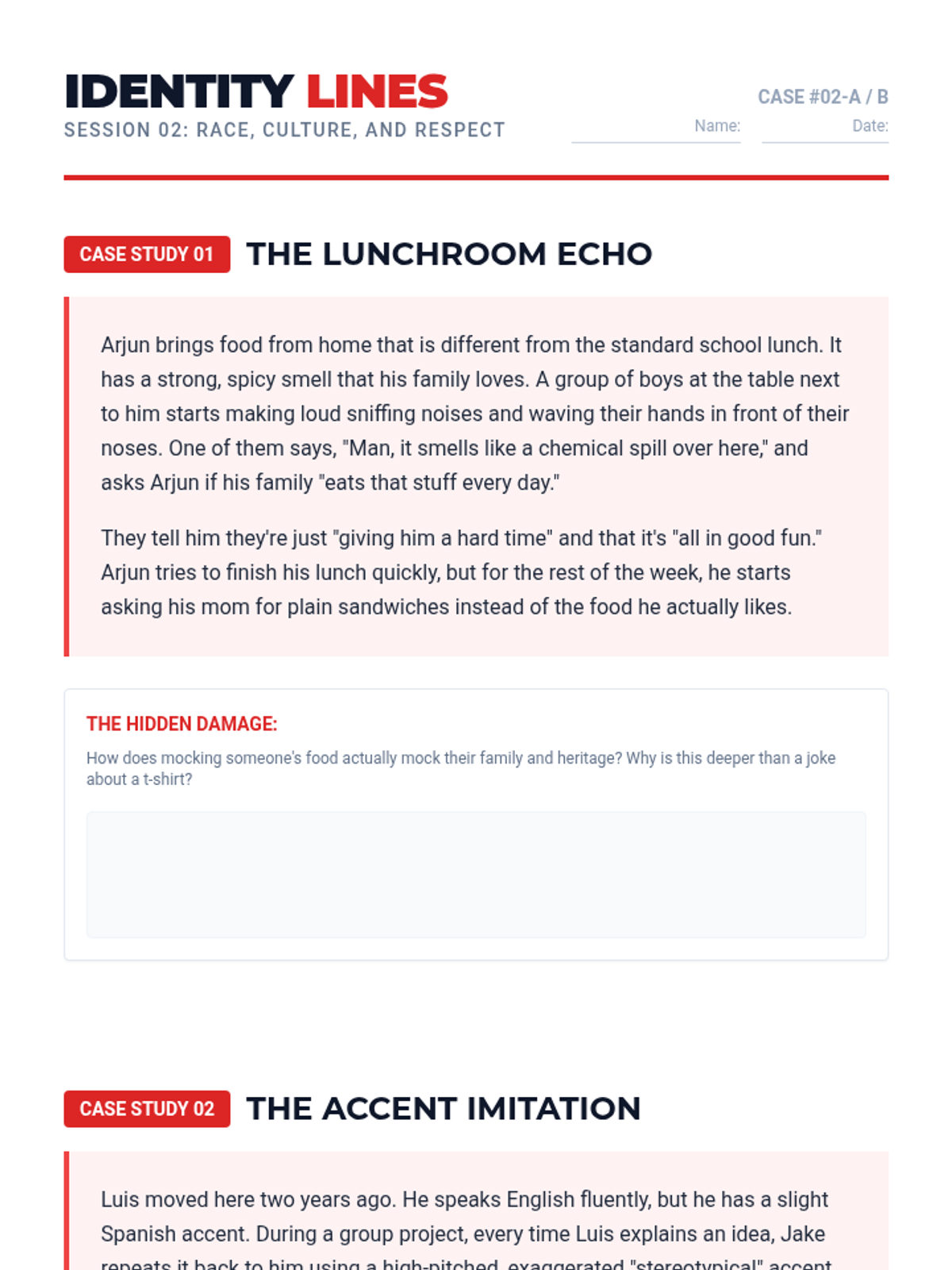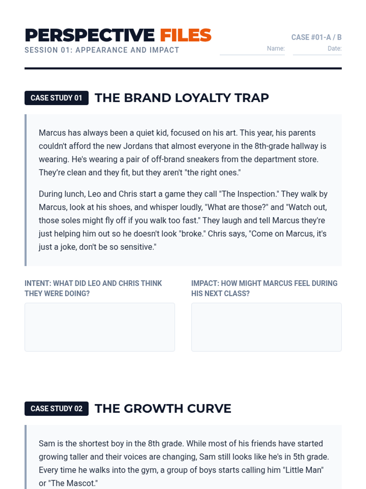 Focuses on the impact of appearance-based teasing, exploring the difference between intent and impact through case studies and empathy mapping.