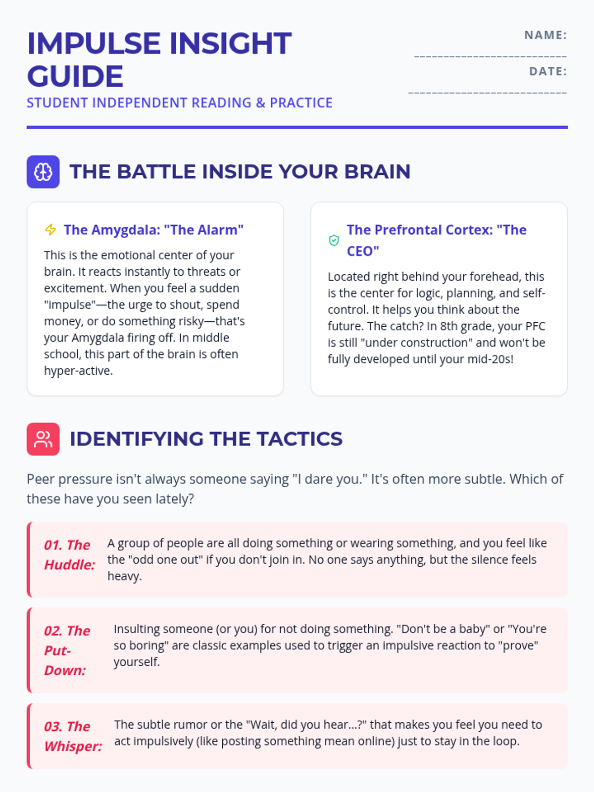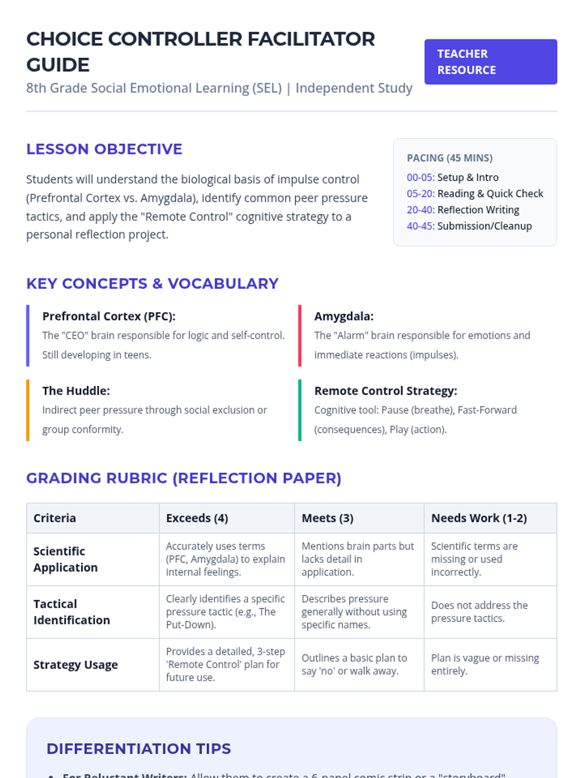 A 45-minute independent lesson for 8th graders focusing on the neurobiology of impulse control, identifying peer pressure tactics, and applying the 'Remote Control' strategy through a structured reflection paper.