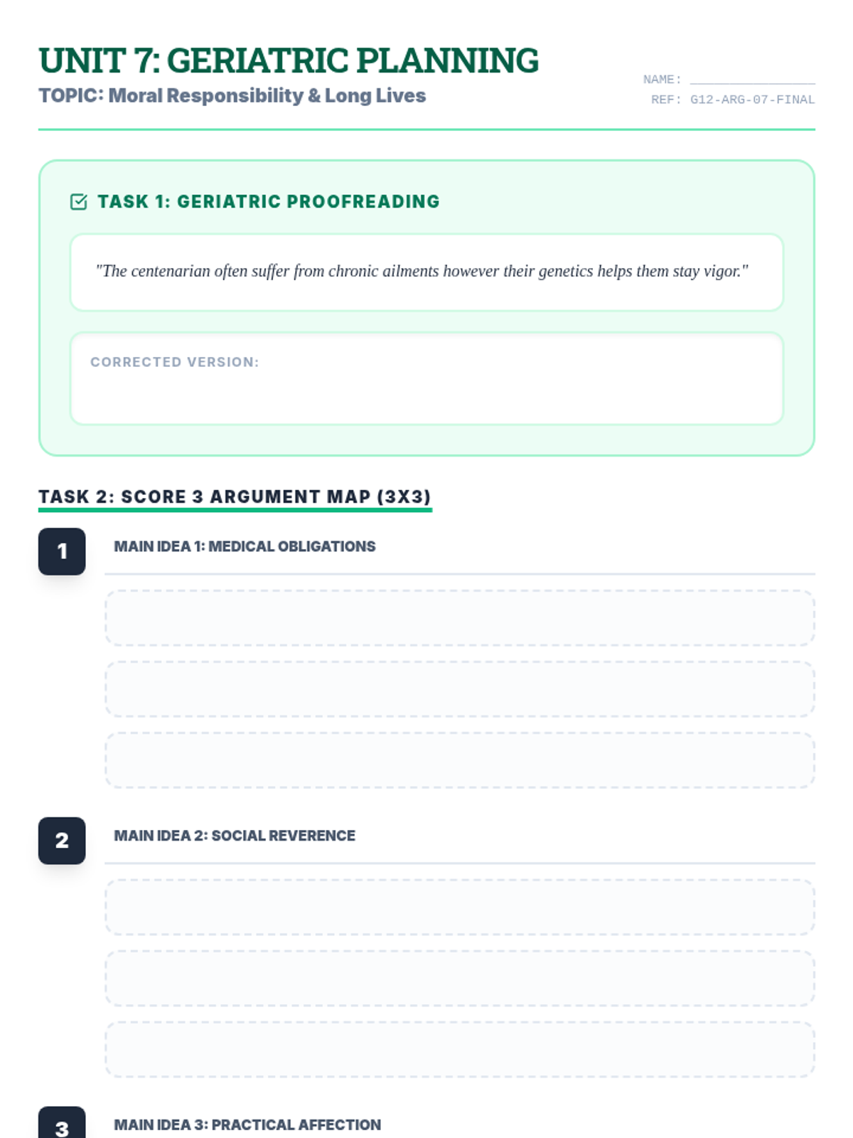 Focuses on writing articles about elderly care, teaching subject-verb agreement, punctuation, and article structure with tiered difficulty for elementary to high school levels.