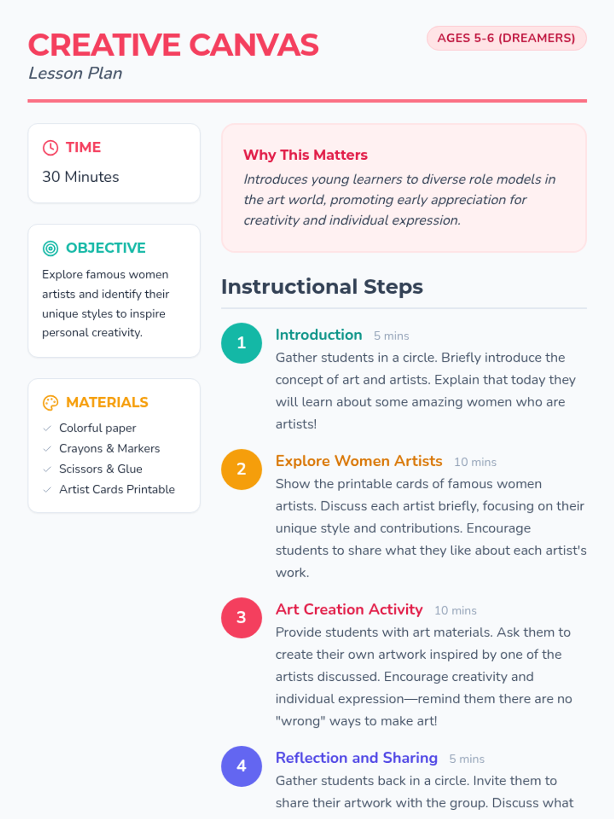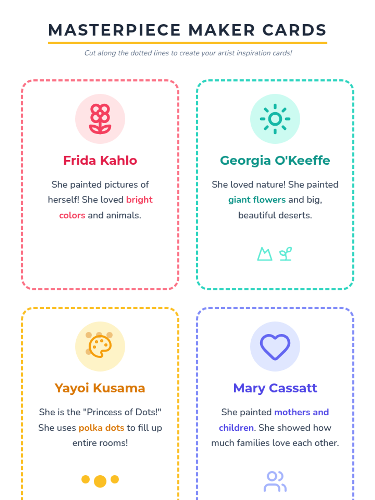 A lesson introducing young learners to four famous women artists, exploring their unique styles, and encouraging students to create their own inspired masterpieces.