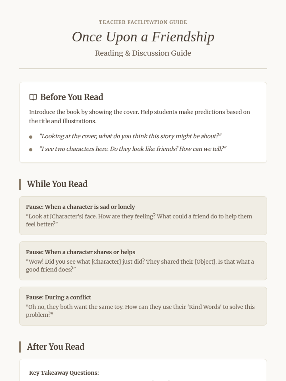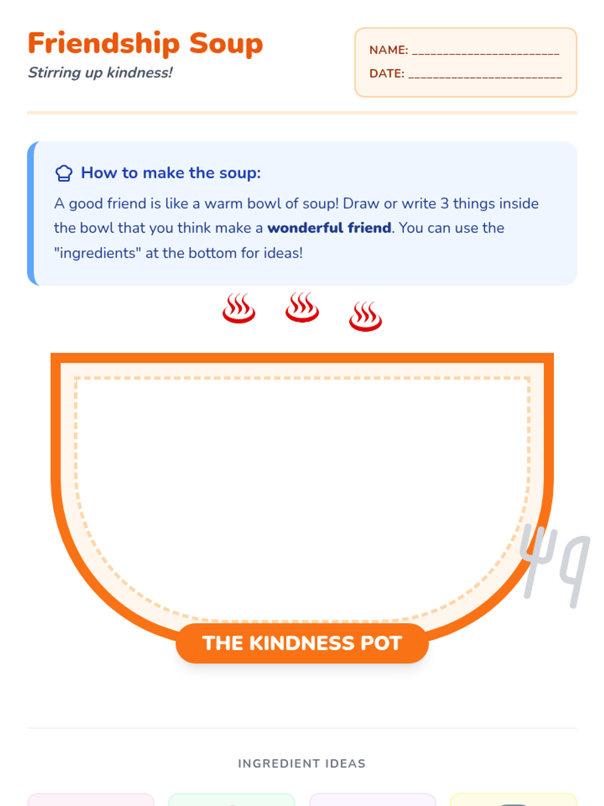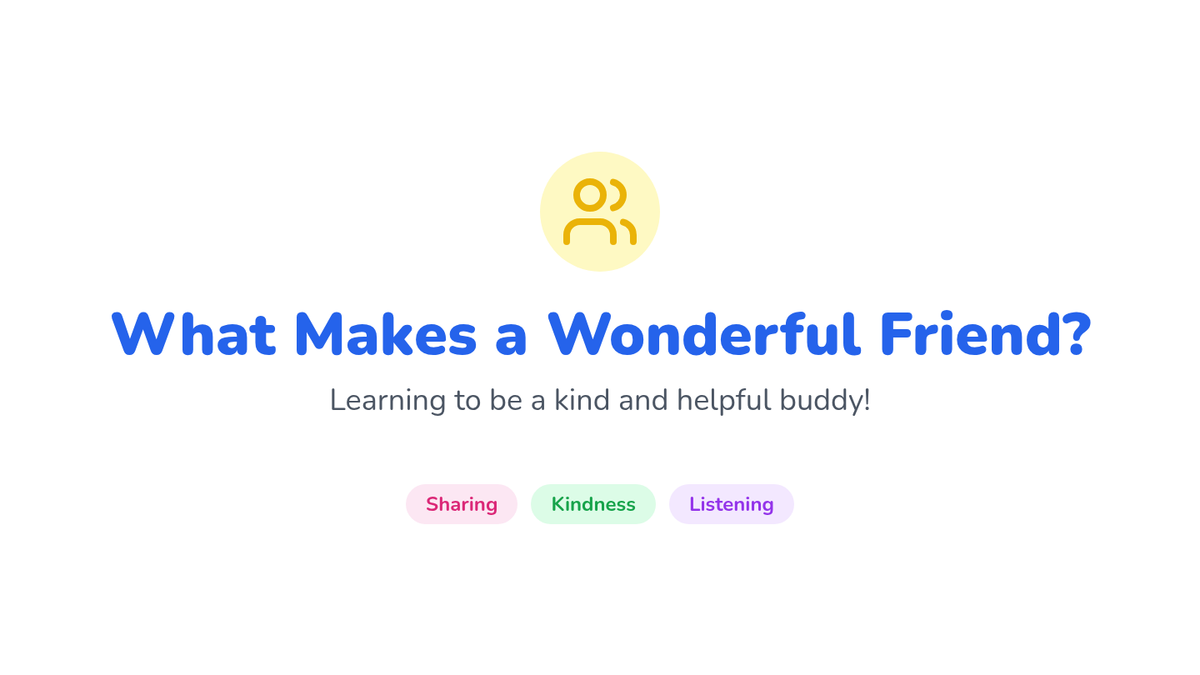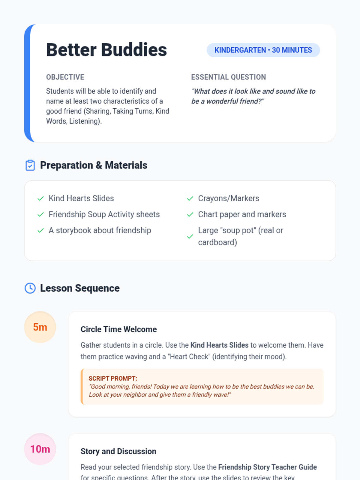 A Kindergarten lesson focused on identifying the qualities of a good friend through story, discussion, and a collaborative 'soup' activity. Students explore sharing, kind words, and listening.