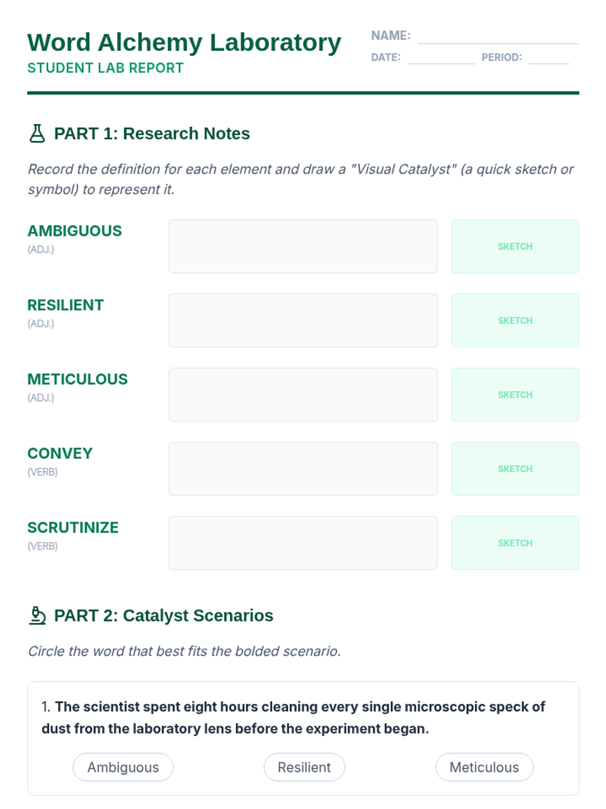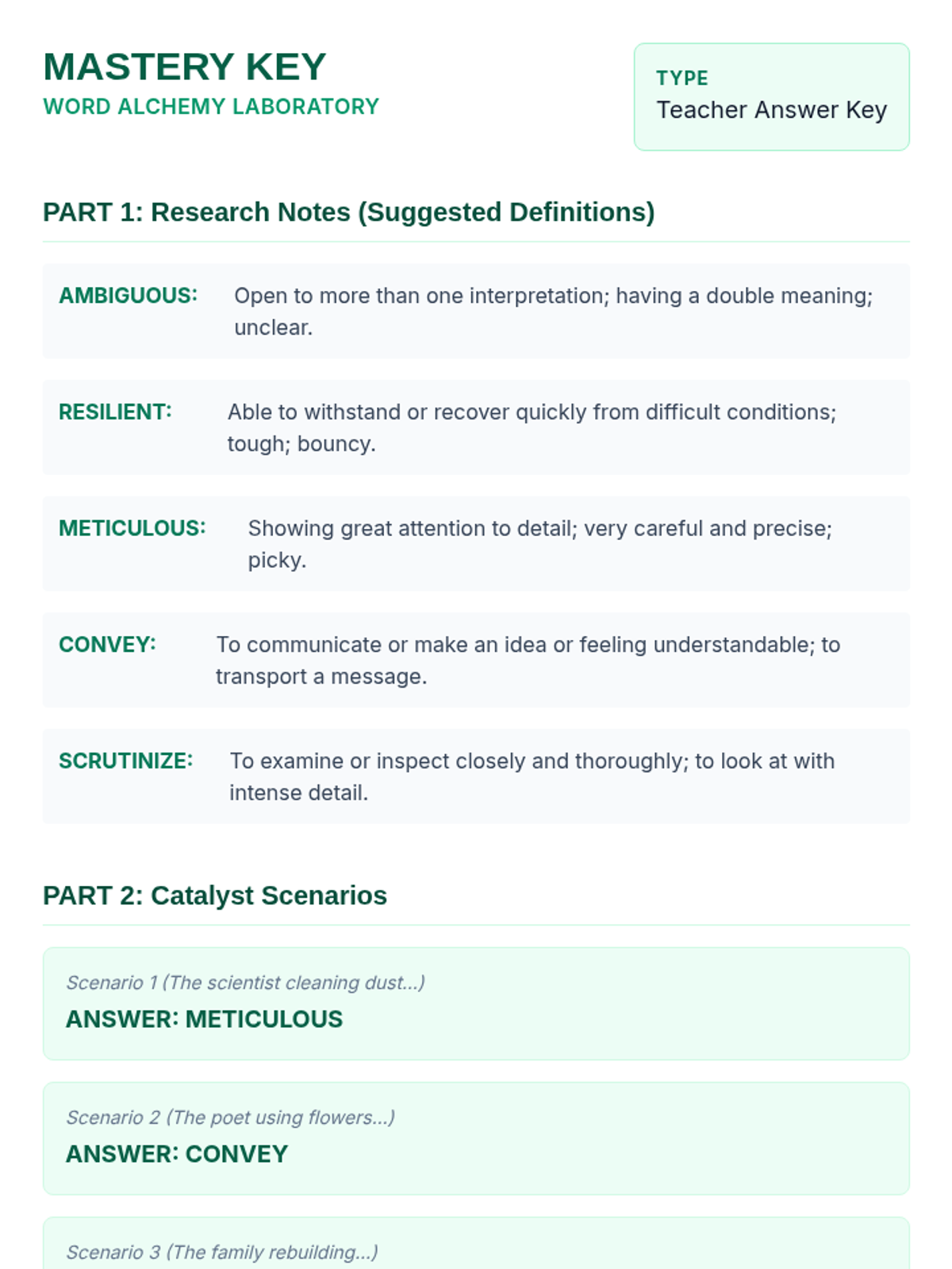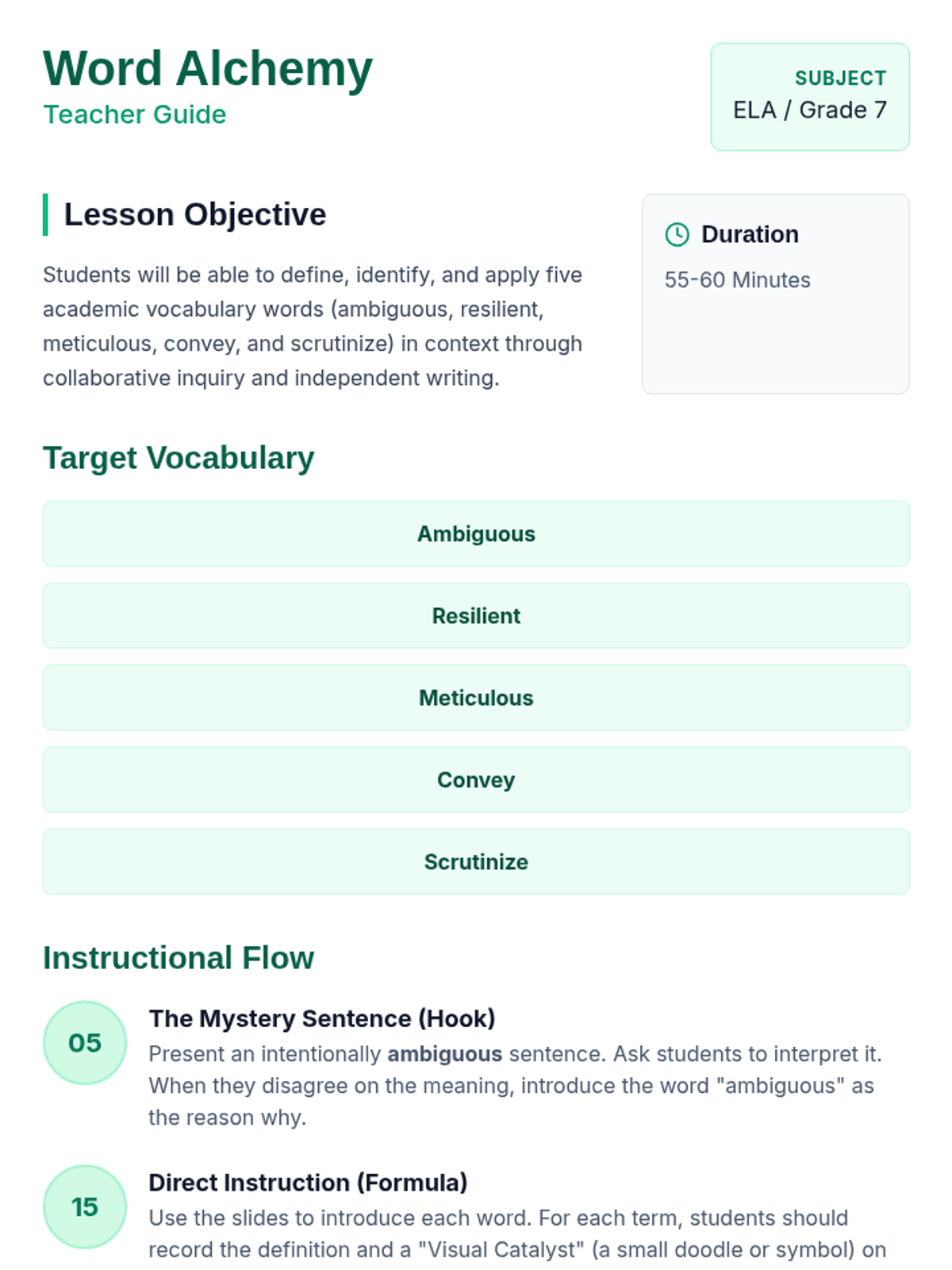 A comprehensive vocabulary lesson for 7th graders focusing on five high-frequency academic terms through a 'Word Alchemy' theme. Includes direct instruction, collaborative engagement, and independent practice.