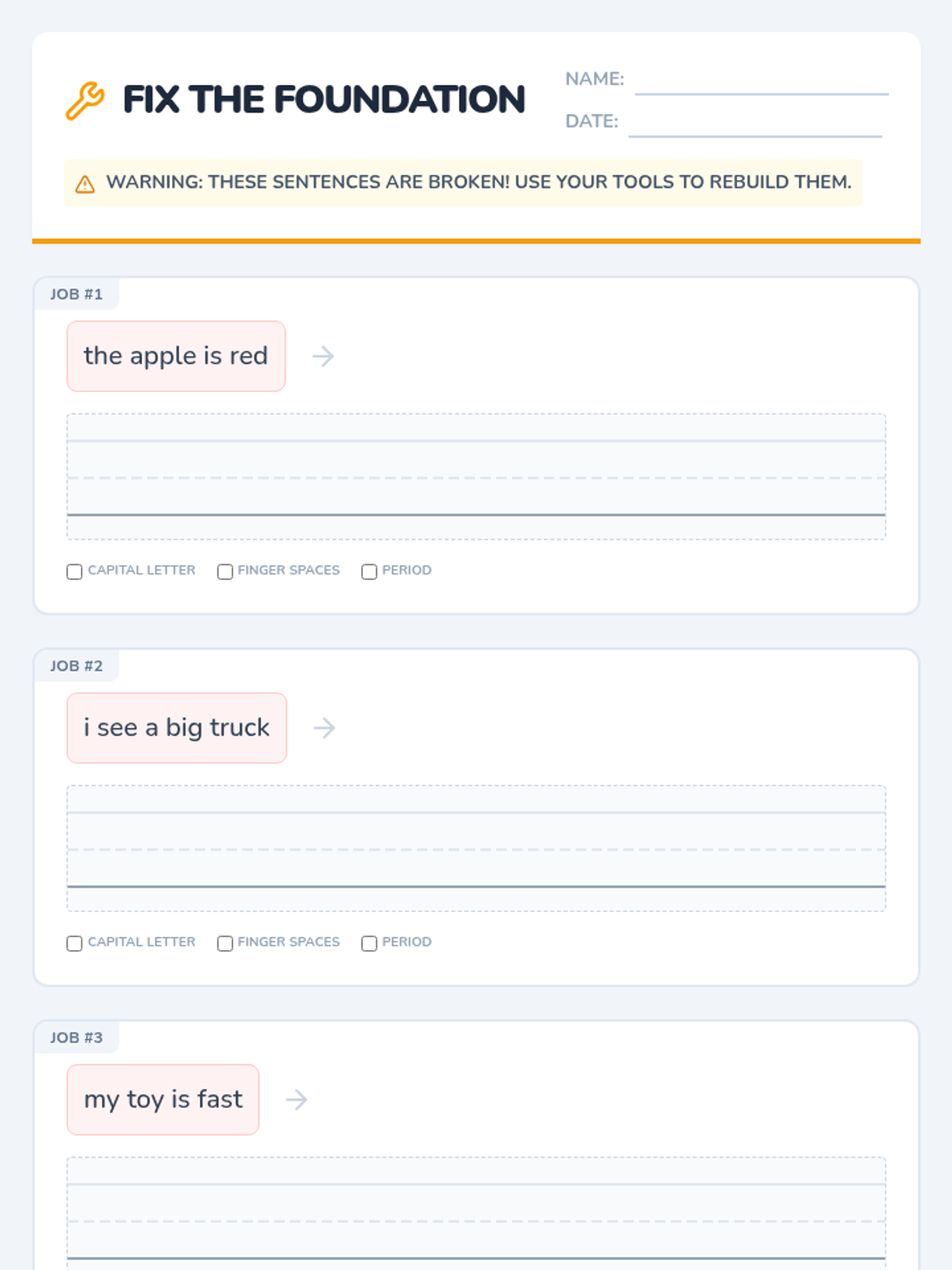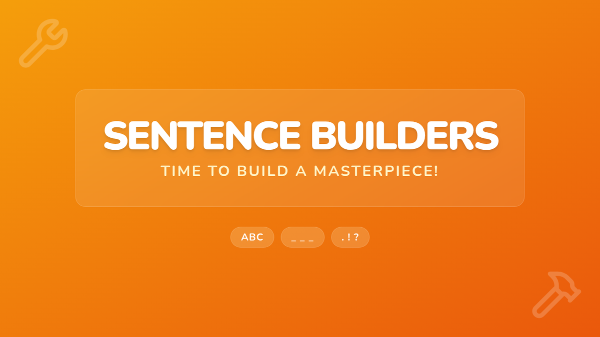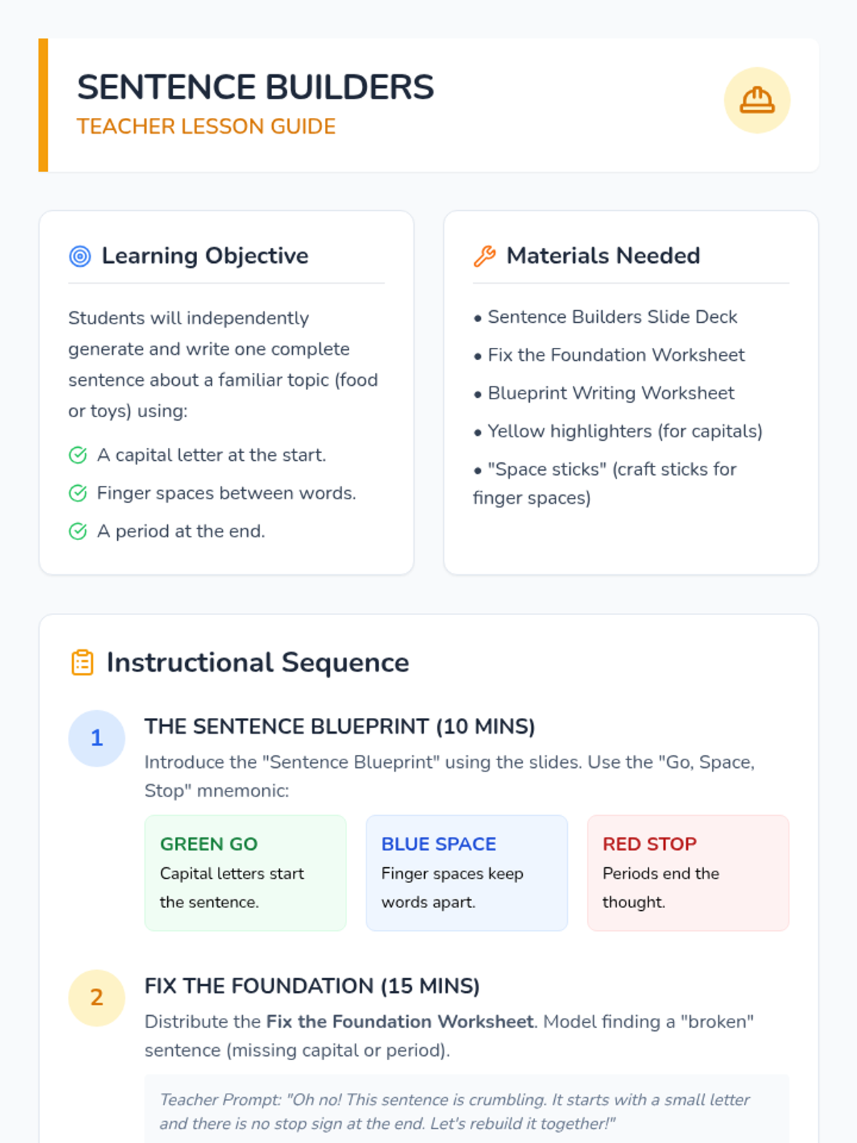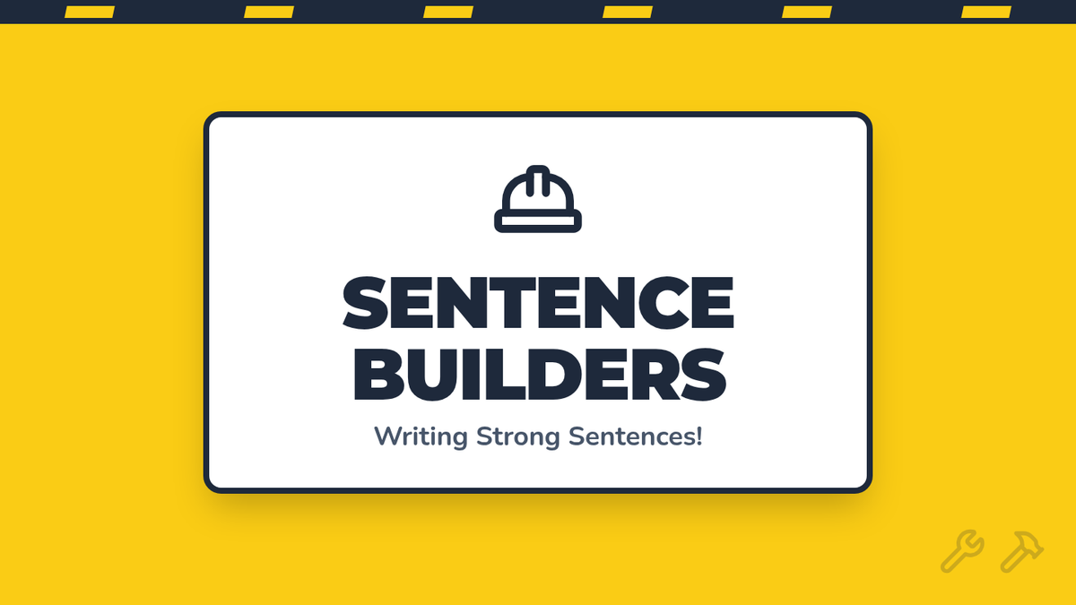 A foundational writing lesson for first-grade students focused on building complete sentences with correct capitalization, punctuation, and grammar using a 'Sentence Builders' theme.