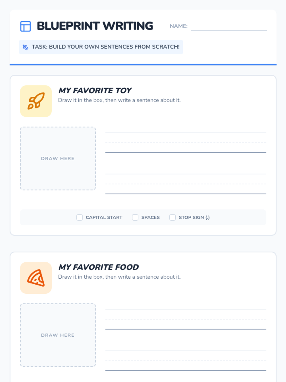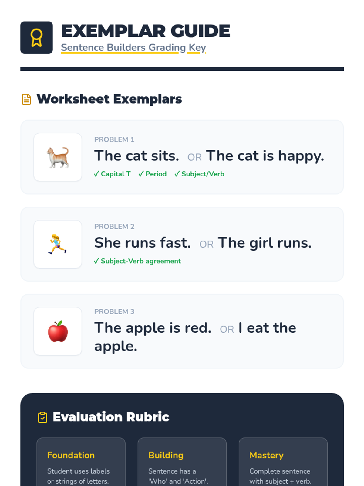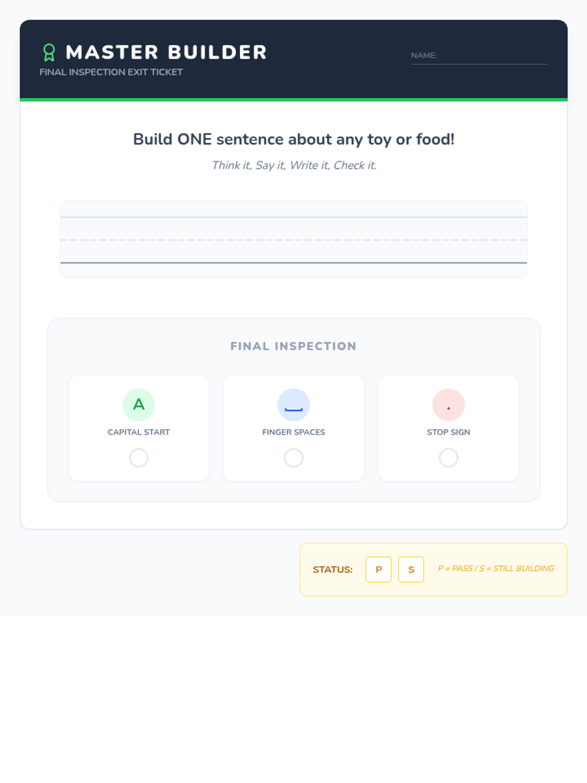 A foundational writing lesson for first-grade students focused on building complete sentences with correct capitalization, punctuation, and grammar using a 'Sentence Builders' theme.