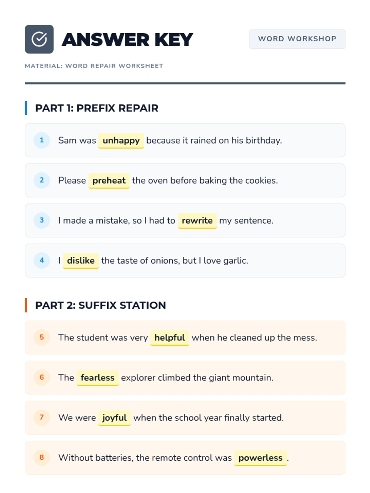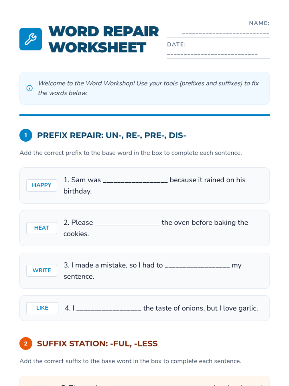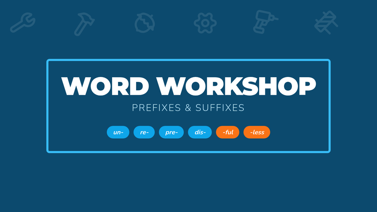 A lesson focused on common prefixes (un-, re-, pre-, dis-) and suffixes (-ful, -less, -er, -ly) using a 'Word Workshop' theme to help students understand how word parts change meanings.