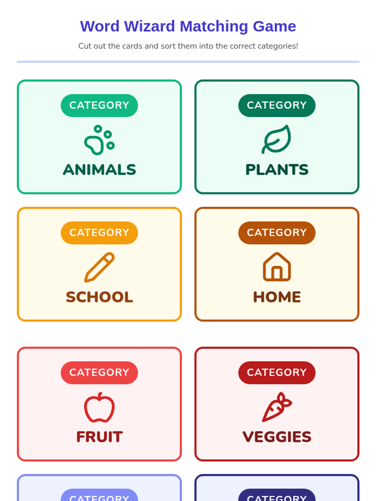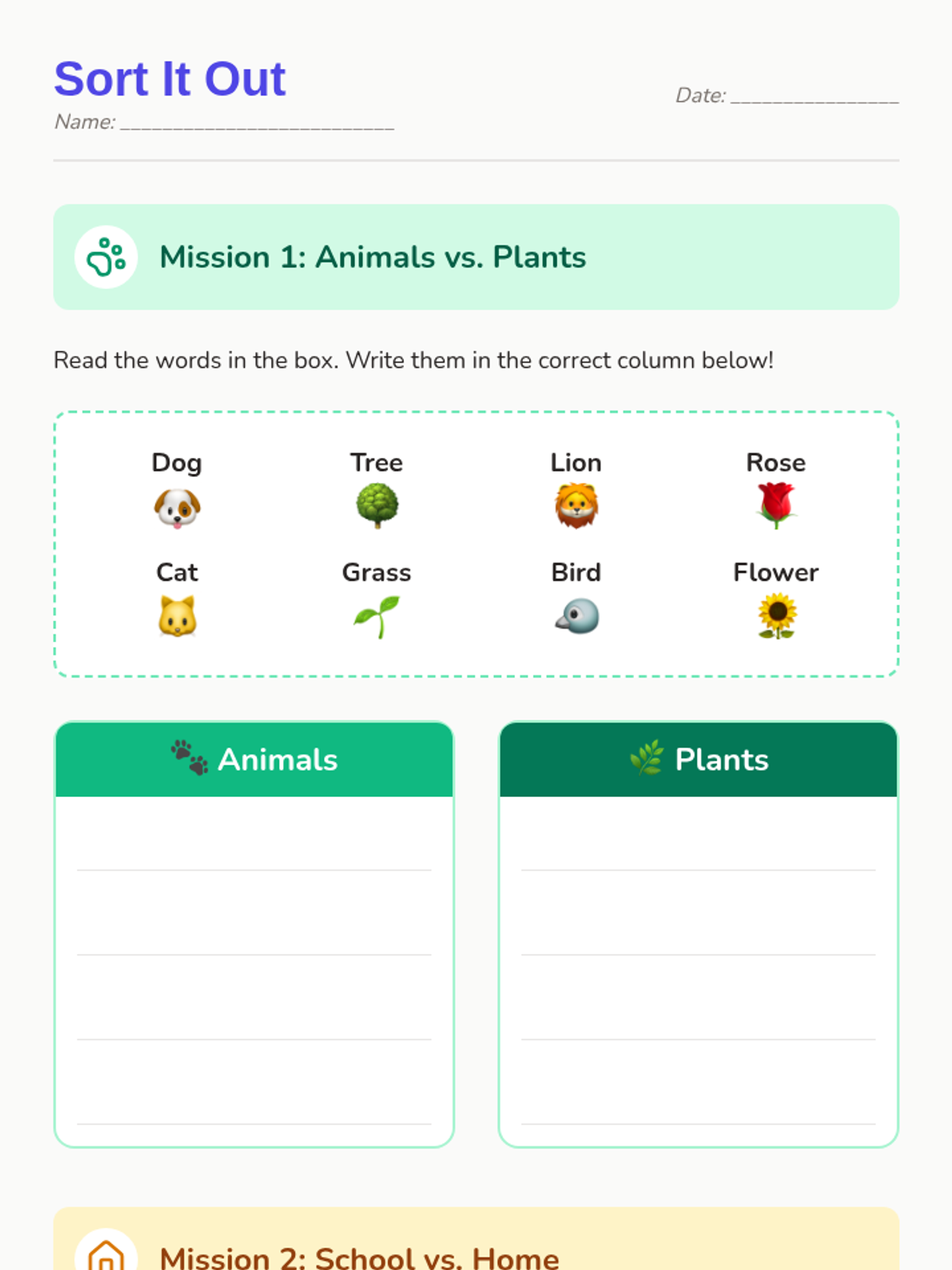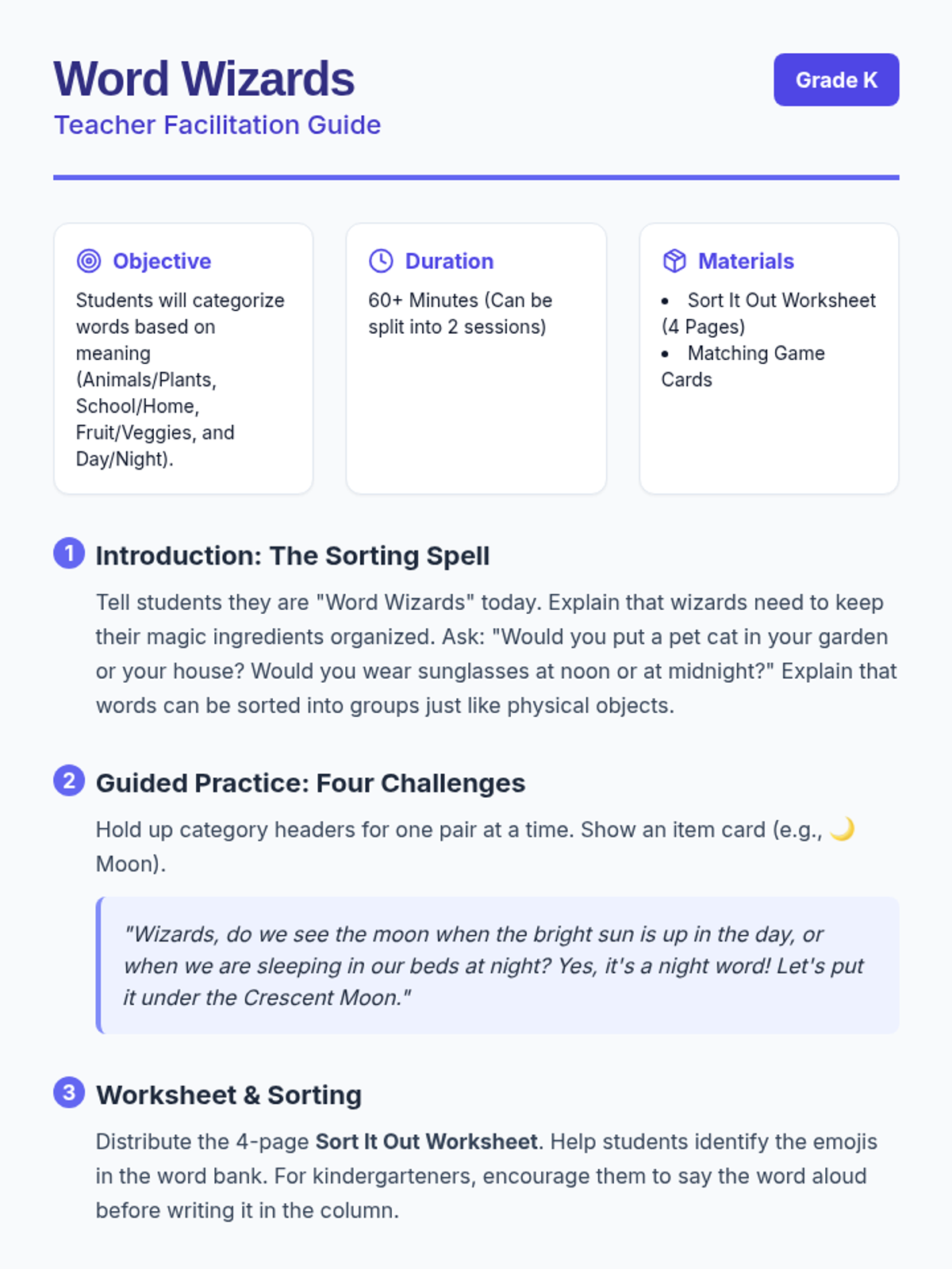 A foundational vocabulary lesson where kindergarteners learn to categorize words based on their meanings, focusing on living things and common environments.